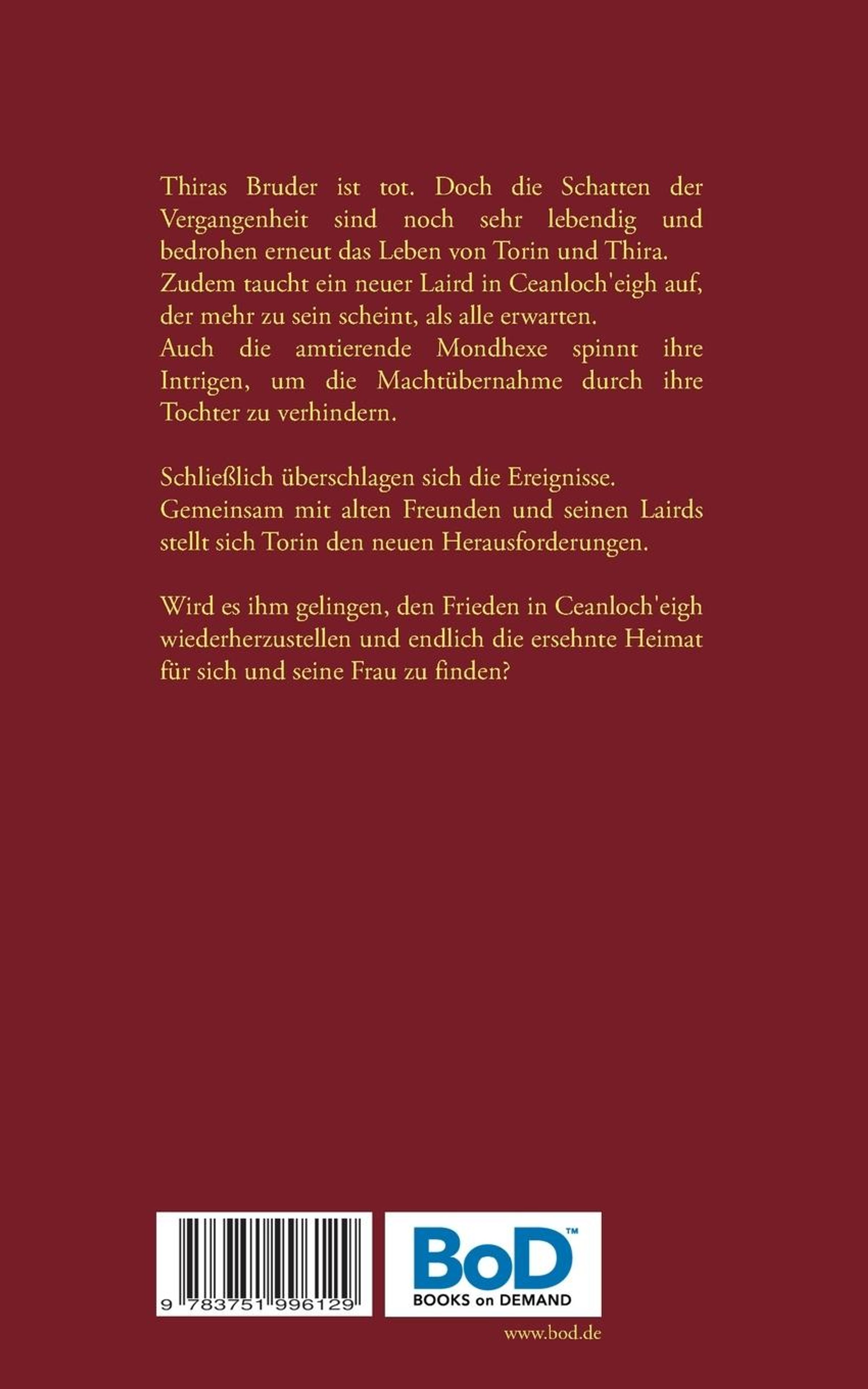 Thiras Bruder ist tot. Doch die Schatten der Vergangenheit sind noch sehr lebendig und bedrohen erneut das Leben von Torin und Thira. Zudem taucht ein neuer Laird auf, der mehr zu sein scheint, als alle erwarten. Gemeinsam mit alten Freunden und seinen Lairds stellt sich Torin den neuen Herausforderungen. Auch als die amtierende Mondhexe ihre Intrigen spinnt und die Machtübernahme durch ihre Tochter verhindern will. Schließlich überschlagen sich die Ereignisse.