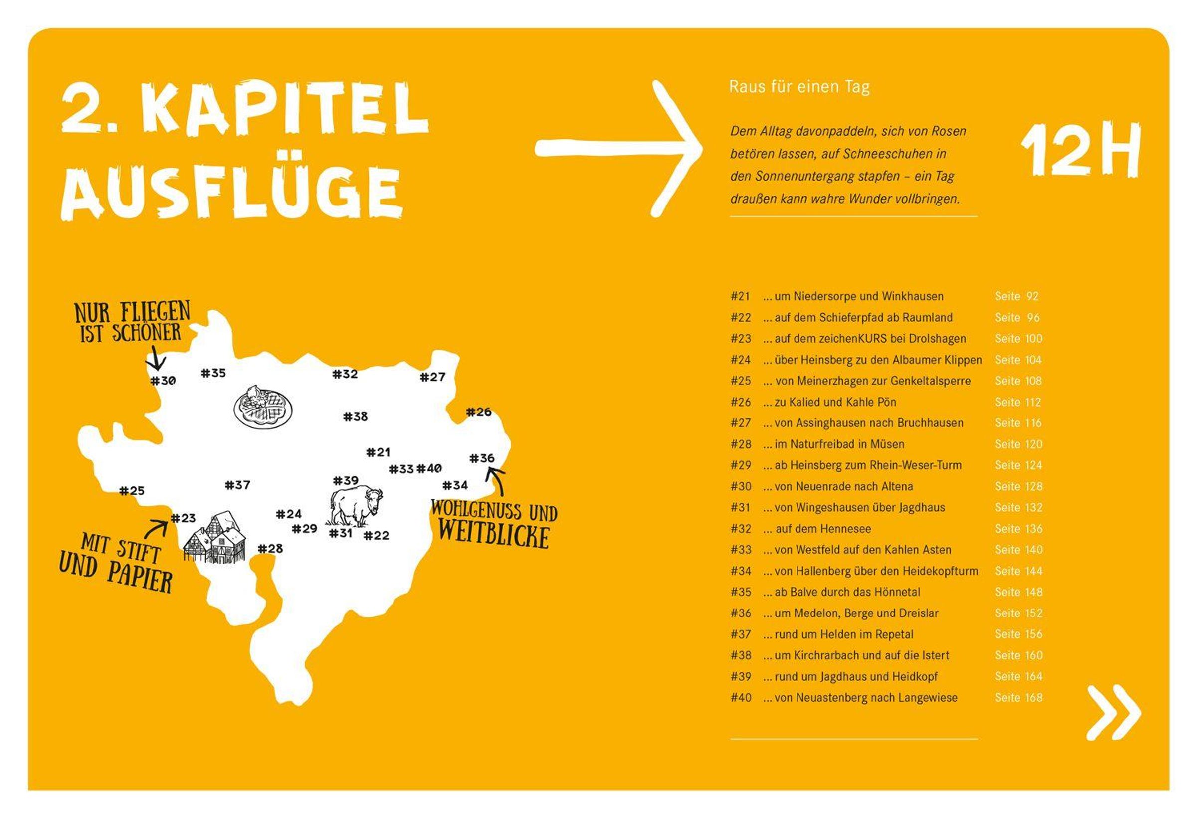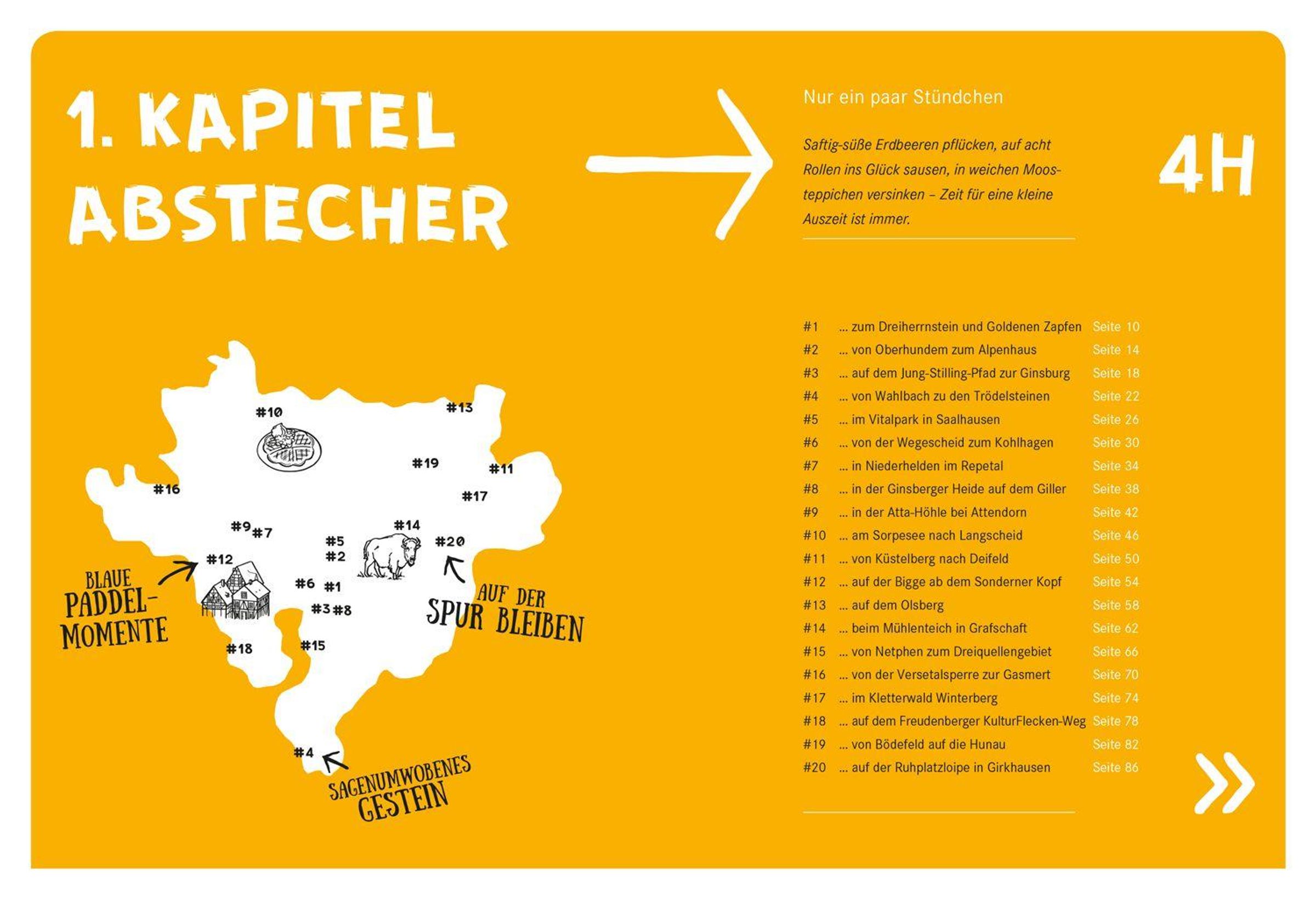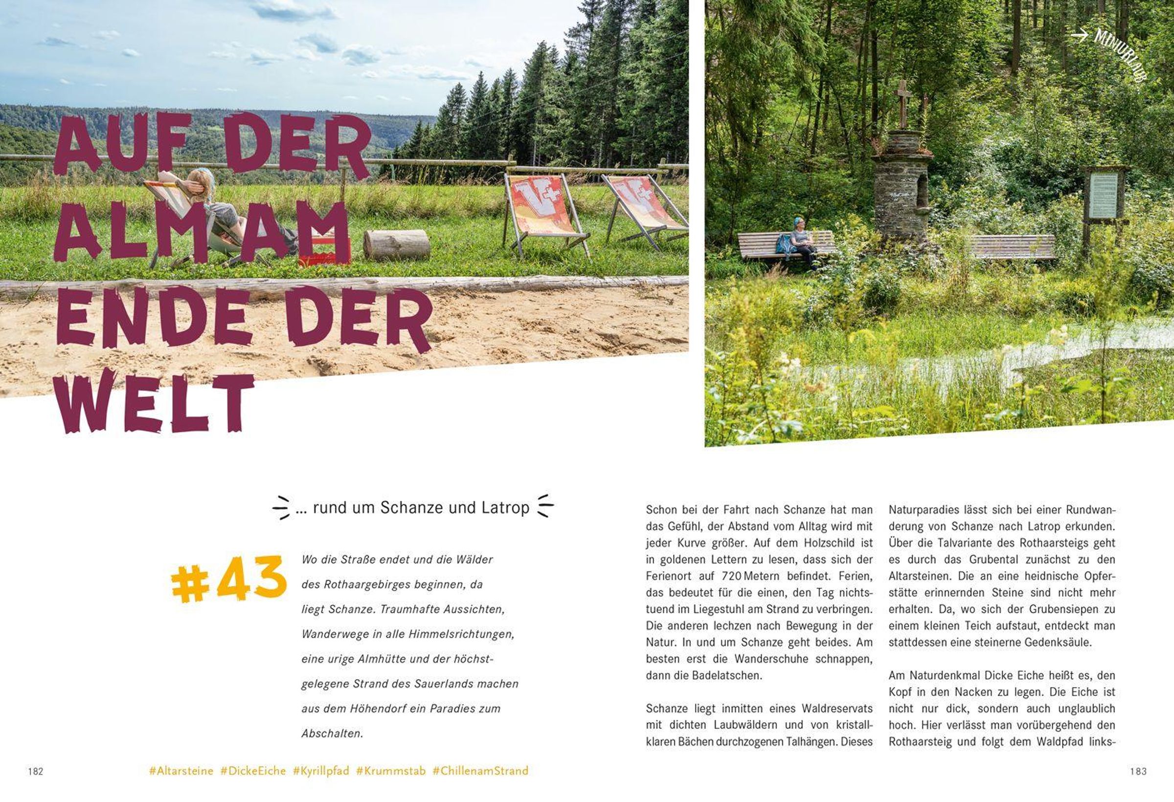 Ob wandern, radeln, paddeln oder in aller Ruhe die Natur genießen: 52 kleine und große Eskapaden machen Lust, die schönsten Ecken im Naturpark Sauerland Rothaargebirge zu entdecken. Für wenige Stunden, einen Tag oder ein Wochenende - unwiderstehliche Ausflüge ins Grüne warten. Wilde Wisente suchen, durch Baumwipfel fliegen oder auf dem Vulkan tanzen, es ist so einfach, mehr zu erleben als das Bekannte. Also ab nach draußen!