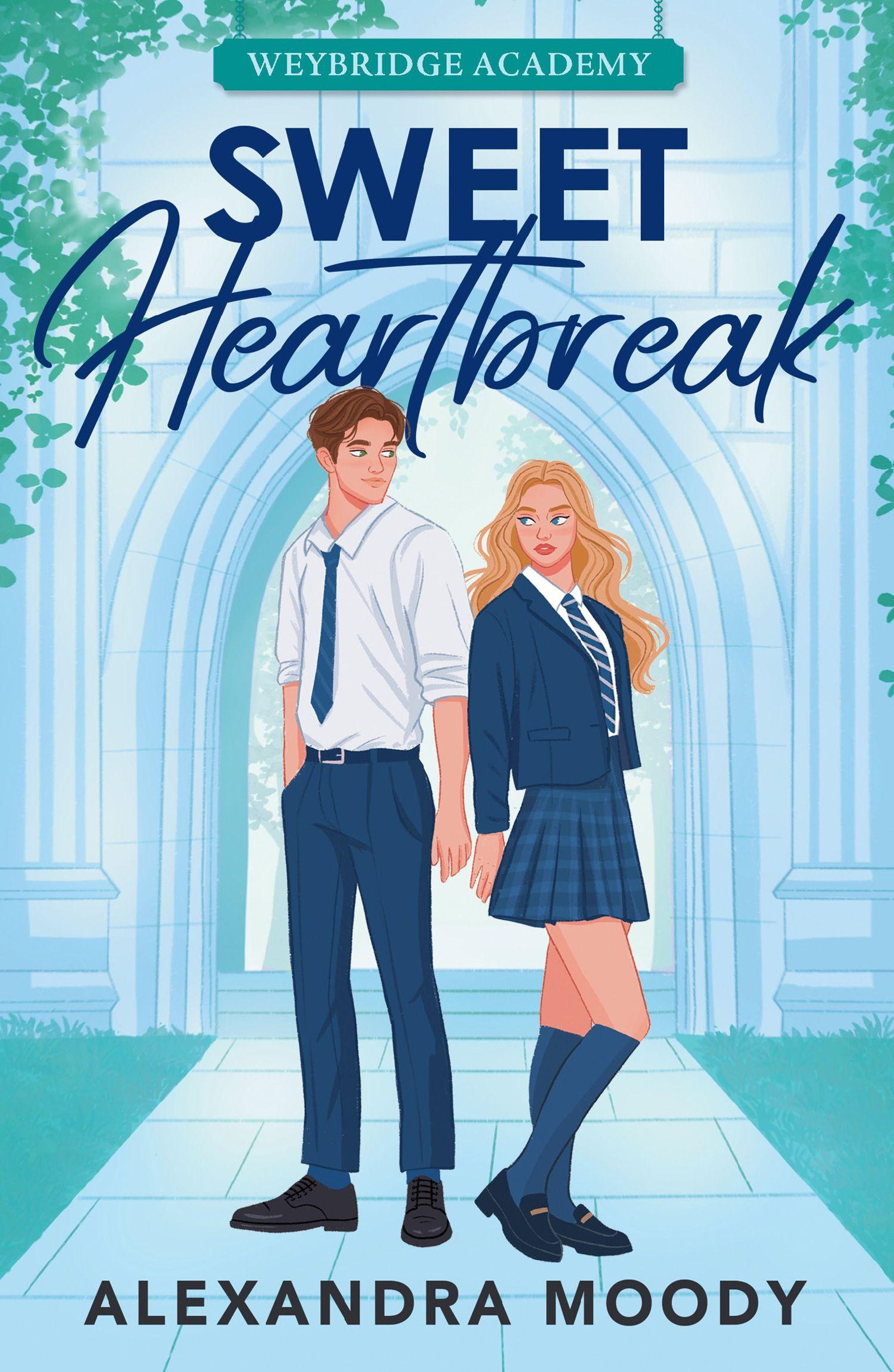 WEYBRIDGE ACADEMY, SWEET Heartbreak, ALEXANDRA MOODY. Illustration von zwei Jugendlichen in Schuluniform vor einem Torbogen., Buch