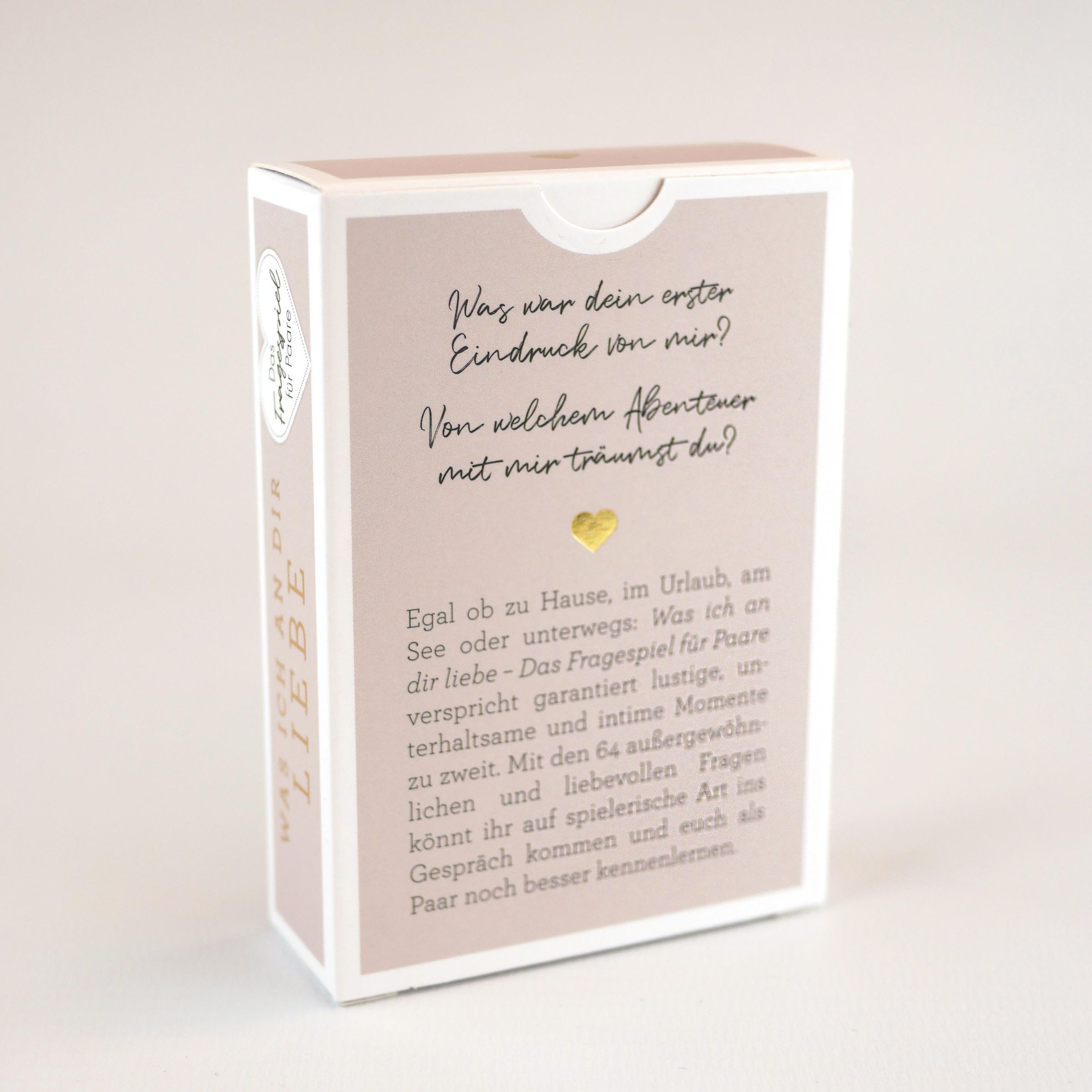 Was war dein erster Eindruck von mir? Womit bringe ich dich oft zum Lachen? Und von welchem Abenteuer mit mir träumst du? Egal ob zu Hause, im Urlaub, am See oder unterwegs: >>Was ich an dir liebe - Das Fragespiel für Paare<< verspricht garantiert lustige, unterhaltsame und intime Momente zu zweit. Mit den 64 außergewöhnlichen und liebevollen Fragen könnt ihr auf spielerische Art ins Gespräch kommen und euch als Paar noch besser kennenlernen.