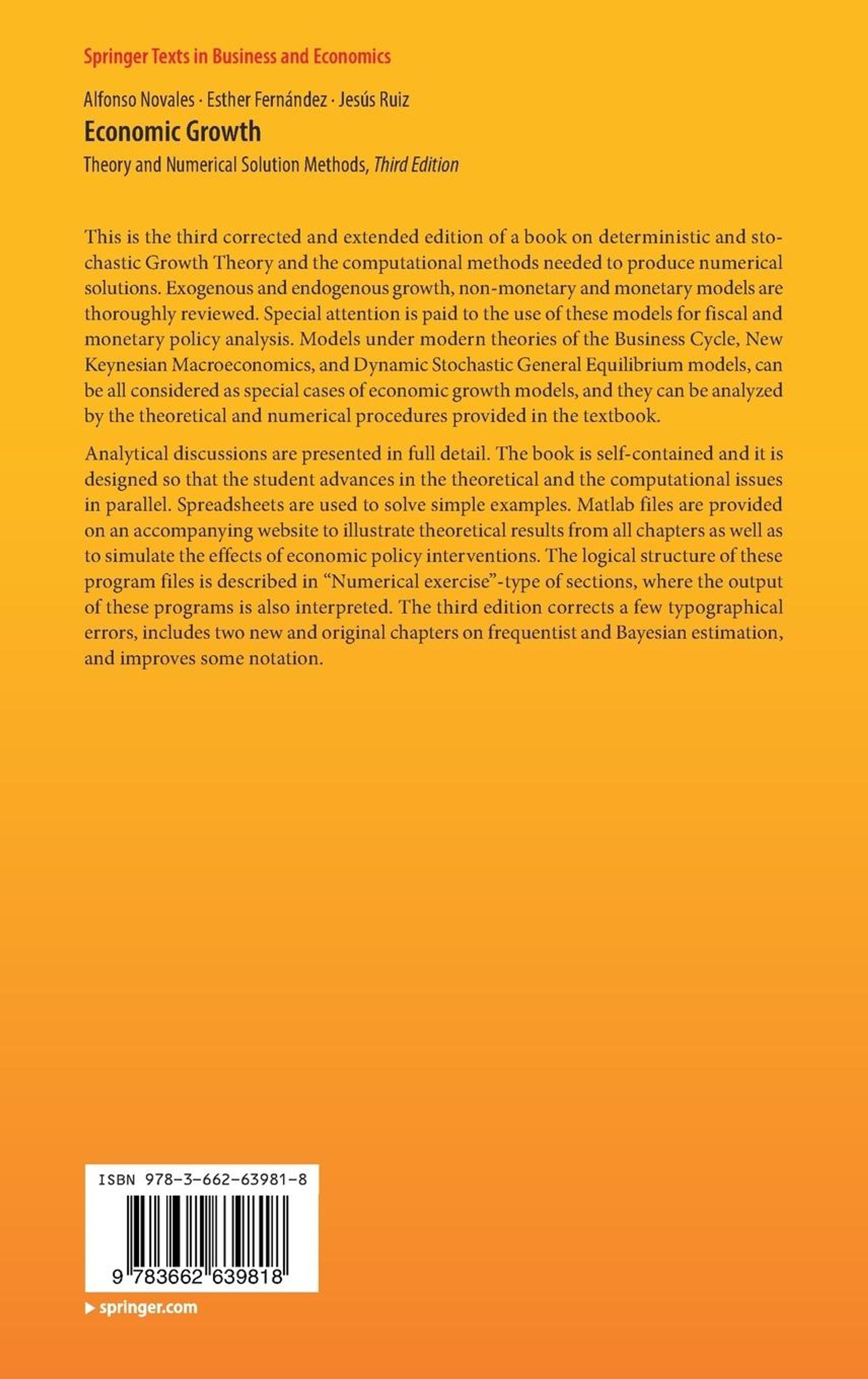 Analytical discussions are presented in full detail. The book is self-contained and it is designed so that the student advances in the theoretical and the computational issues in parallel. Spreadsheets are used to solve simple examples. Matlab files are provided on an accompanying website to illustrate theoretical results from all chapters as well as to simulate the effects of economic policy interventions. The logical structure of these program files is described in "Numerical exercise"-type of sections, where the output of these programs is also interpreted. The third edition corrects a few typographical errors, includes two new and original chapters on frequentist and Bayesian estimation, and improves some notation.