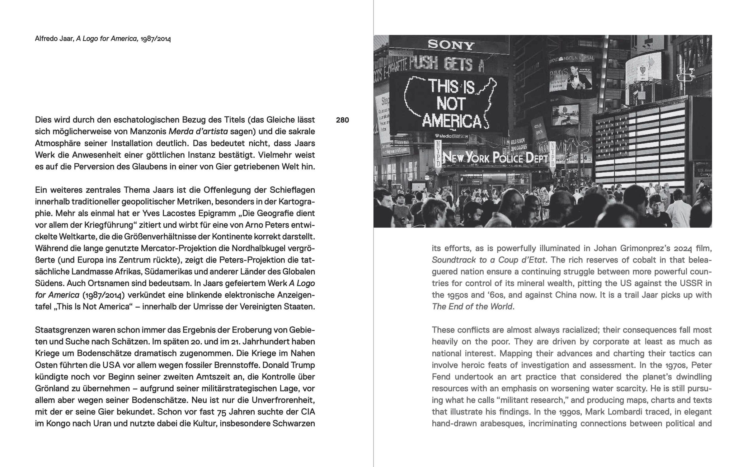 In The End of the World, which grew out of a multi-year research project assisted by the human geographer and political geologist Adam Bobbette, Jaar shines a spotlight on the struggle for resources, which is a central and ever more salient factor in international conflicts. The site-specific work, a cube measuring 4 × 4 × 4 centimeters, is composed of several such resources: cobalt, rare earths, copper, tin, nickel, lithium, manganese, coltan, germanium, and platinum. These ten strategic metals are of vital importance in the fields of digital technology and electromobility, for high-tech applications and storage media. As demand for them has grown steadily, their extraction has been accompanied by massive human rights violations and environmental destruction. Jaar astutely observes these lines of conflict that convulse our planet. His artistic research is complemented by essays by Adam Bobbette and Nancy Princenthal and an introduction by Kathrin Becker.