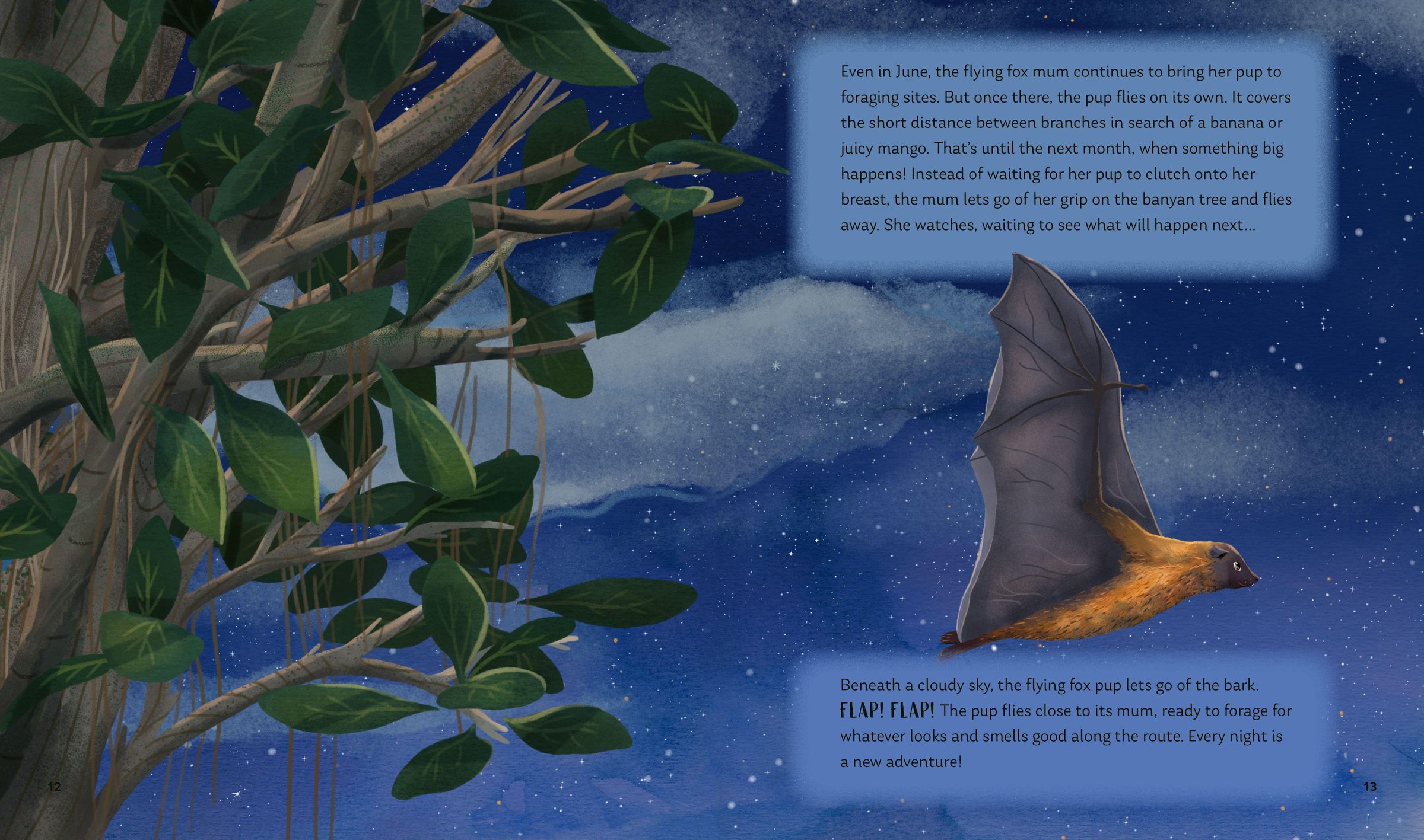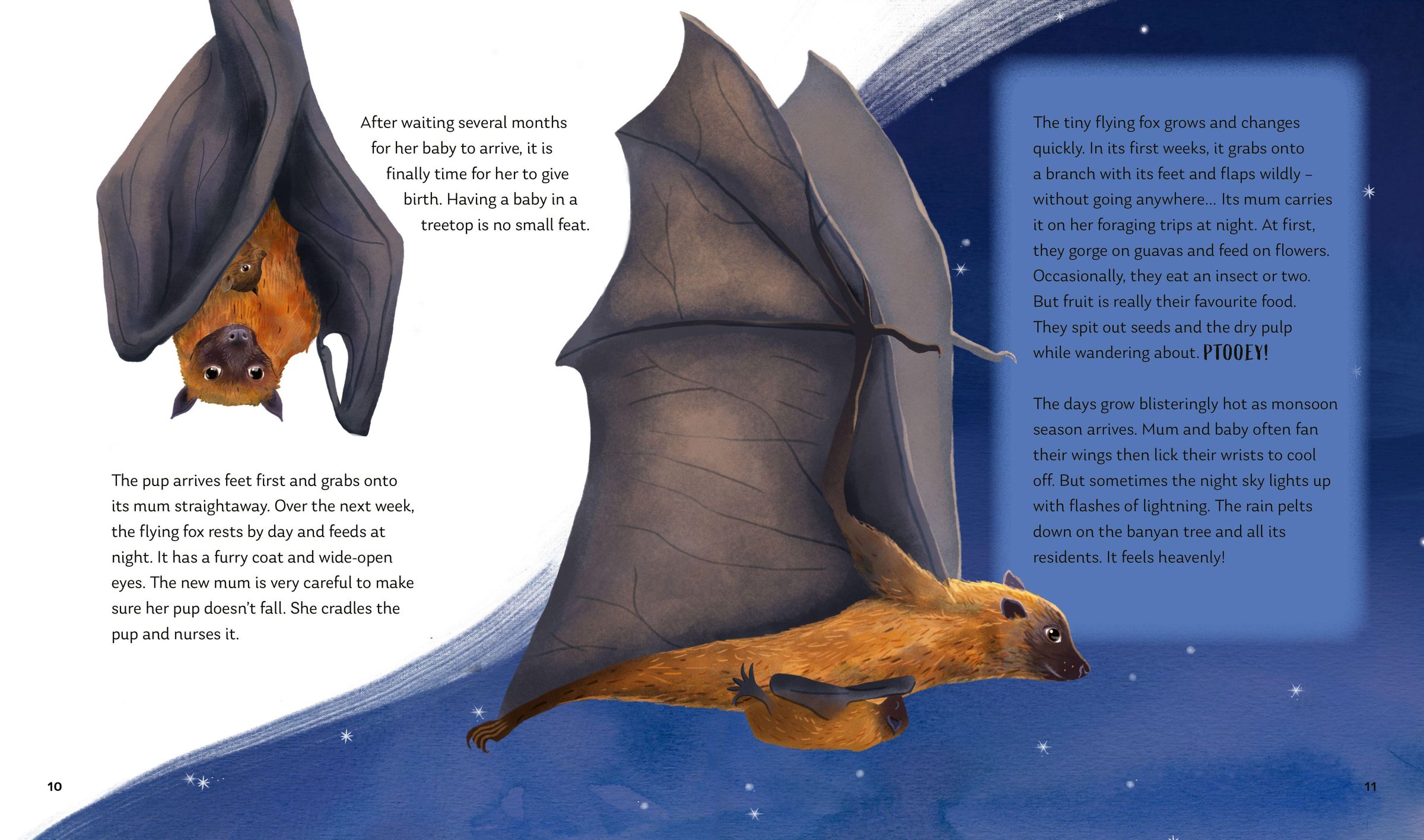 Other stories feature American alligators, Fennec foxes, wombats, snowy owls, bushbabies, flying frogs, luna moths and even a rat making its way across a sleeping city. All of these nighttime animals and their habitats are brought to life with impressive skill by illustrator Jennifer Falkner.