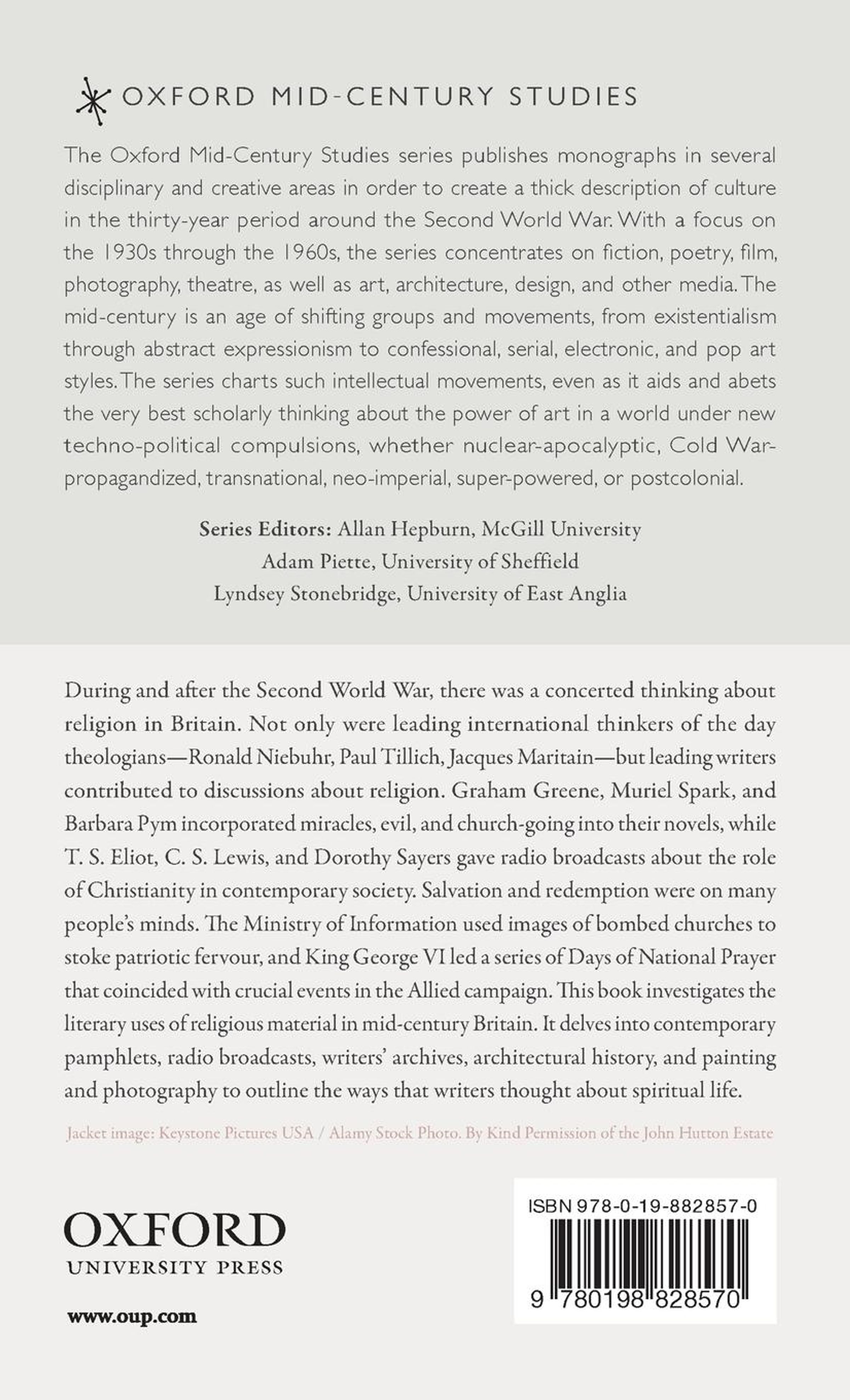 During and after the Second World War, there was a concerted thinking about religion in Britain. Not only were leading international thinkers of the day theologians--Ronald Niebuhr, Paul Tillich, Jacques Maritain--but leading writers contributed to discussions about religion. Graham Greene, Muriel Spark, and Barbara Pym incorporated miracles, evil, and church-going into their novels, while Louis MacNeice, T. S. Eliot, and C. S. Lewis gave radio broadcasts about the role of Christianity in contemporary society. Certainly the war revived interest in aspects of Christian life. Salvation and redemption were on many people's minds. The Ministry of Information used images of bombed churches to stoke patriotic fervour, and King George VI led a series of Days of National Prayer that coincided with crucial events in the Allied campaign. After the war and throughout the 1950s, approximately 1.4 million Britons converted to Roman Catholicism as a way of expressing their spiritual ambitions and solidarity with humanity on a world-wide scale. Religion provided one way for writers to answer the question, 'what is man?' It also afforded ways to think about social obligation and ethical engagement. Moreover, the mid-century turn to religion offered ways to articulate statehood, not from the perspective of nationhood and politics, but from the perspective of moral action and social improvement. Instead of being a retreat into seclusion and solitude, the mid-century turn to religion is a call to responsibility.
