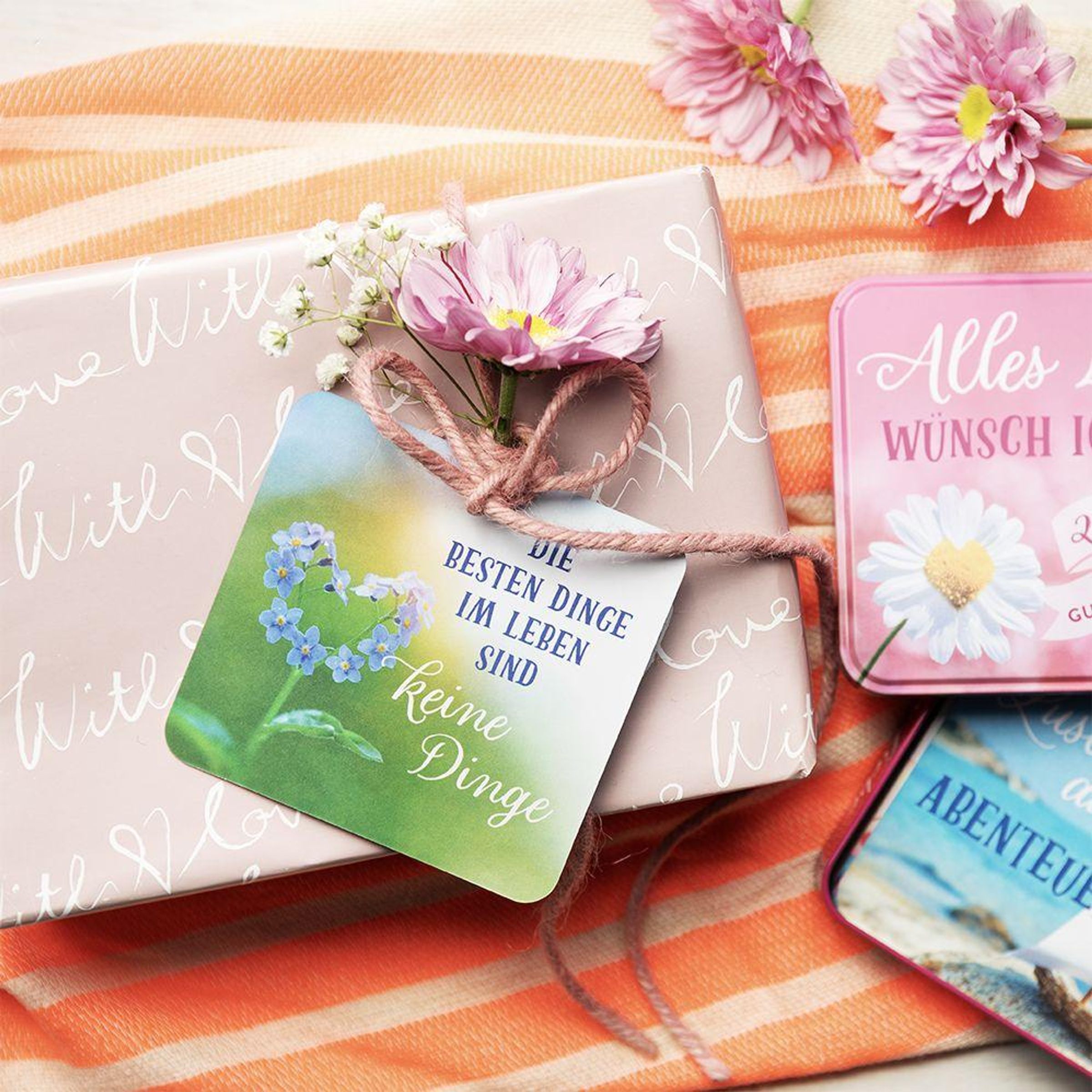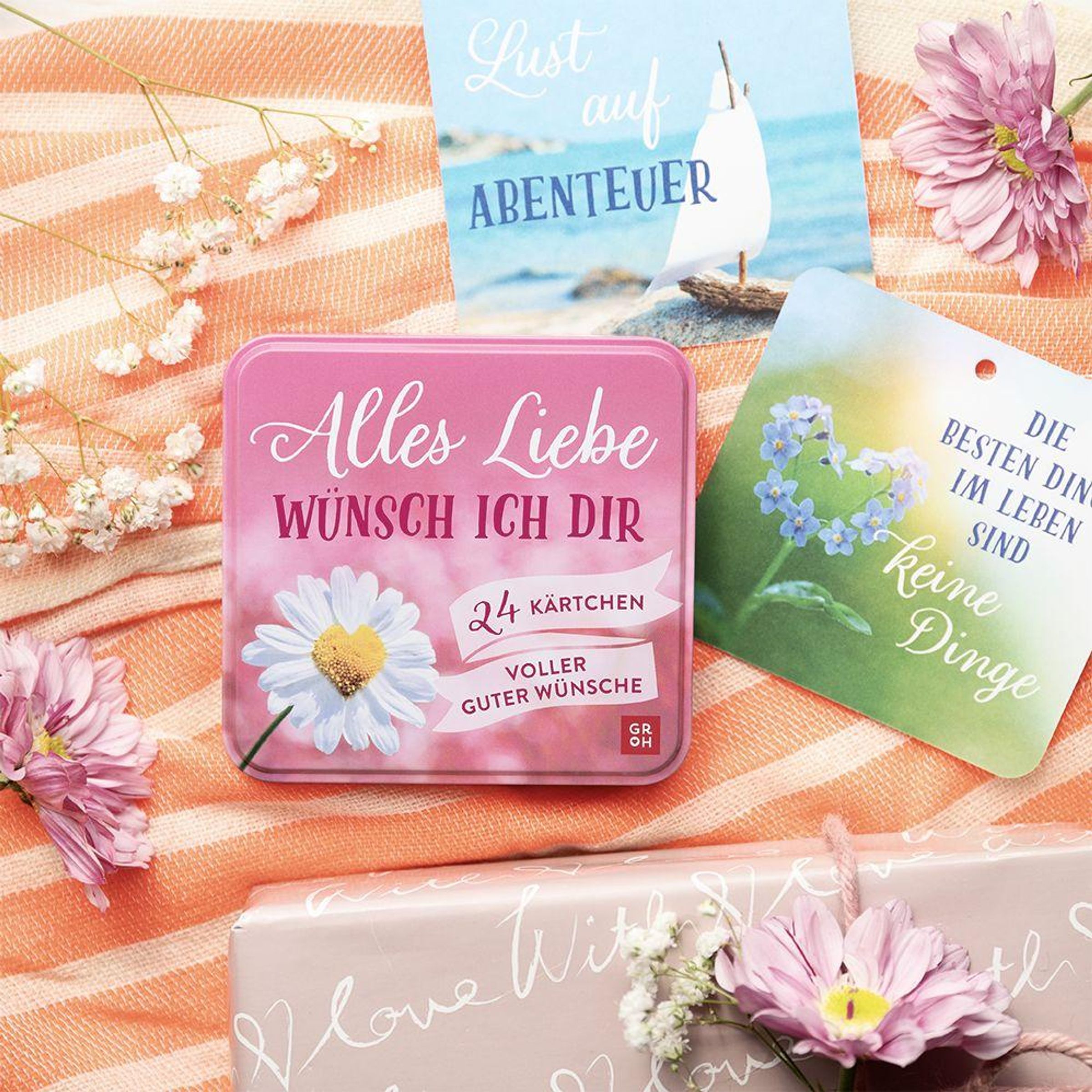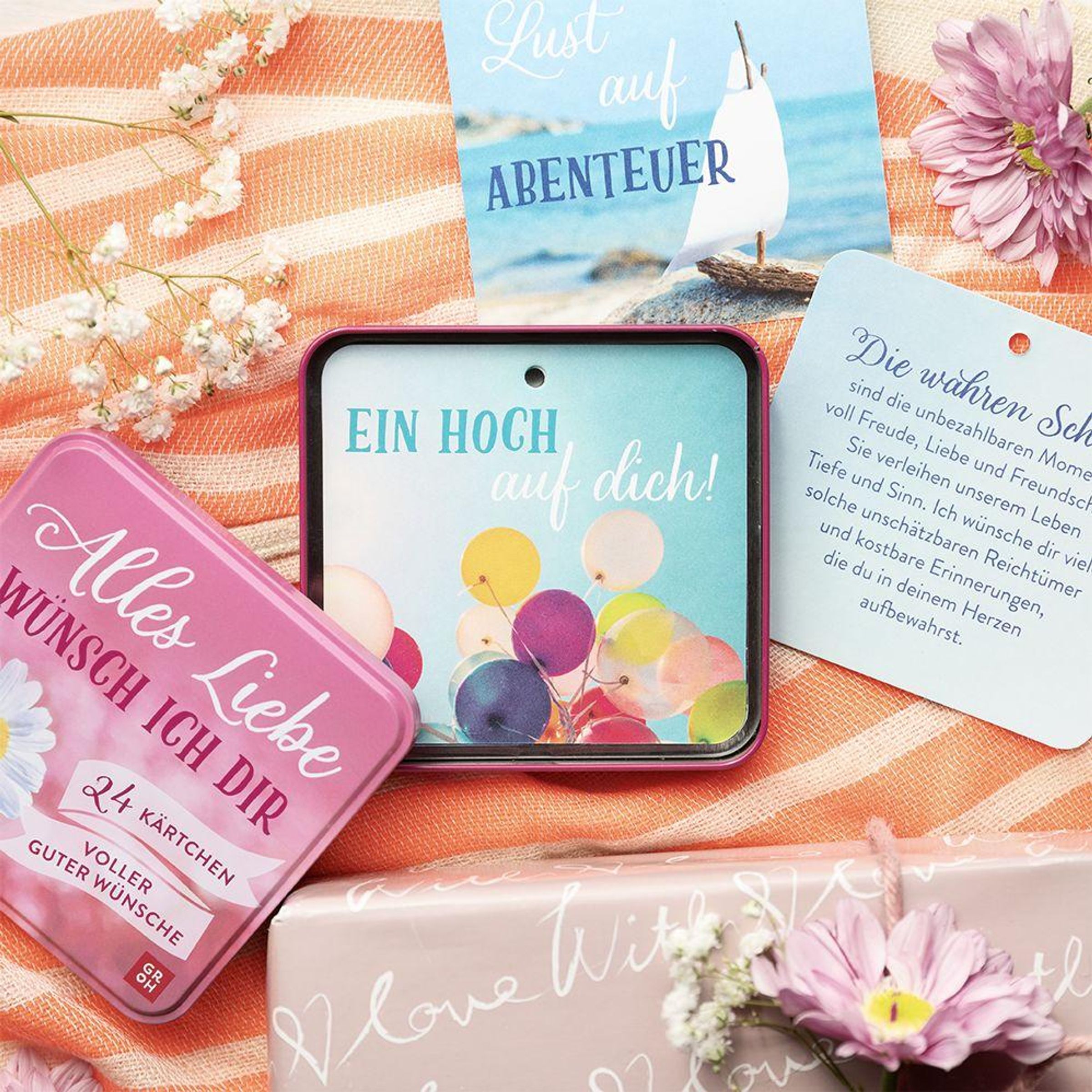 Es gibt immer einen guten Grund, jemandem einen guten Wunsch zu überbringen, sei es zum Geburtstag, zu einem besonderen Jahrestag oder einfach nur so. Mit dieser dekorativen Geschenkdose sorgst du 24 Mal für ein Lächeln. Sie enthält 24 Karten mit herzlichen, persönlich formulierten Wünschen zu Themen wie "Genieße den Tag", "Nimm dir Zeit für den Augenblick" oder "Sieh das kleine Glück". Die Texte sind liebevolle Botschaft, Motivation und Tagesmotto zugleich.