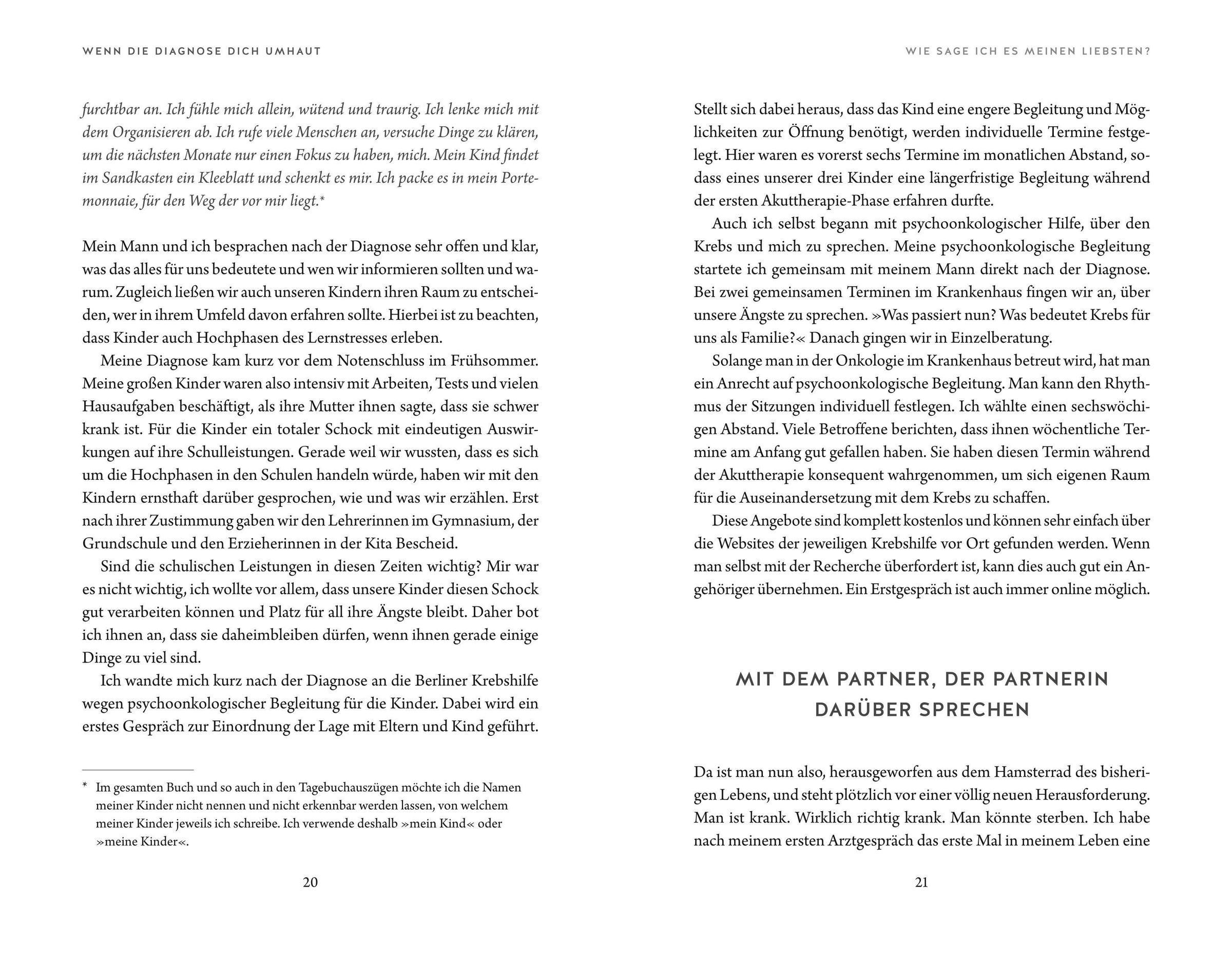 Beiträge von Betroffenen und Expert: innen bereichern dieses Buch auf vielen Ebenen: Bestsellerautorin Patricia Cammarata schreibt eindringlich über Mental Load in Familien während einer Krebserkrankung. Ernährungsinfluencerin Carolin Kotke erklärt, warum Himbeeren keinen Krebs heilen - und liefert Rezepte, die Körper und Seele guttun. Trauerbegleiterin und Bloggerin Lisa Harmann geht der Frage nach: Was trägt uns, wenn wir sterben - und wie bereiten wir unsere Familie liebevoll darauf vor?