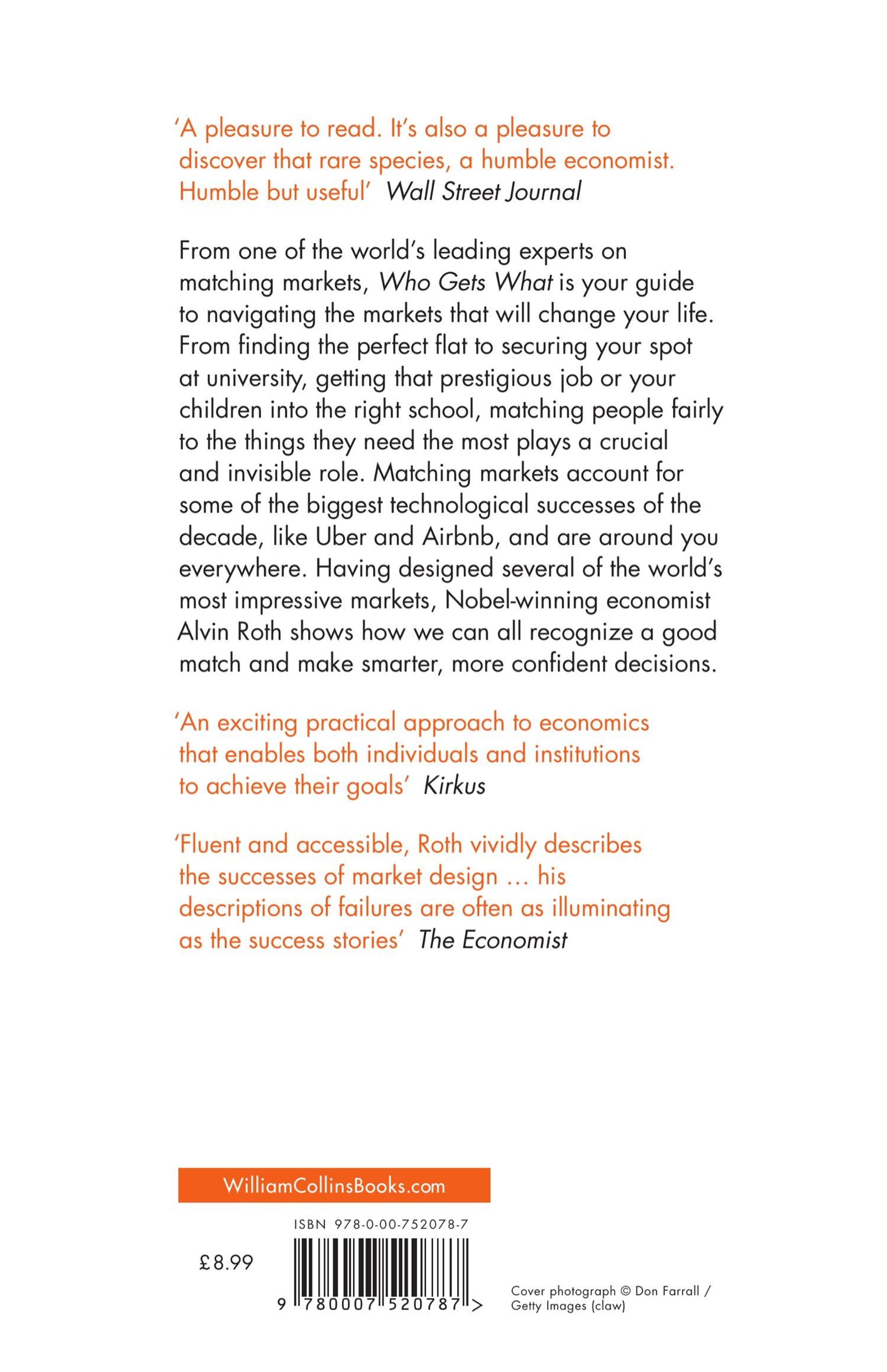 Who Gets What and Why is a piquantly written, mind-expanding exploration of the markets that matter most to many of us. If you've ever sought a job or hired someone, applied to university or guided your child into a good school, asked someone out on a date or been asked out, you have participated in a matching market. They are everywhere around us and account for some of the biggest technological successes of the decade, like Uber and Airbnb. Matching markets can even be the gatekeeper of life itself, guiding how desperately ill patients receive scarce organs for transplants.
