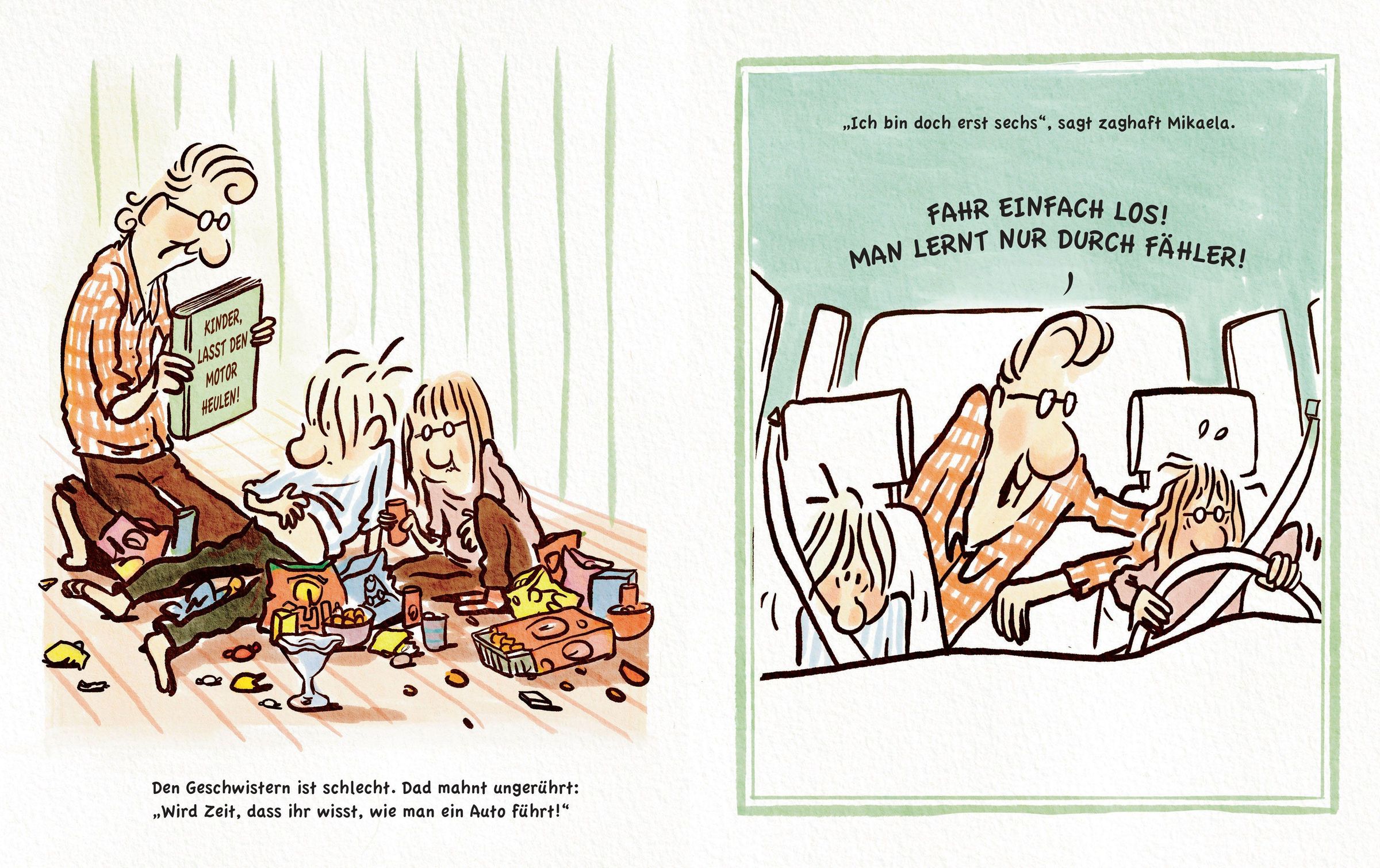 Die Flunkerei-Bücherei. Zwei Personen lesen sitzend, umgeben von fliegenden Büchern, neben einem überfüllten Auto., Buch