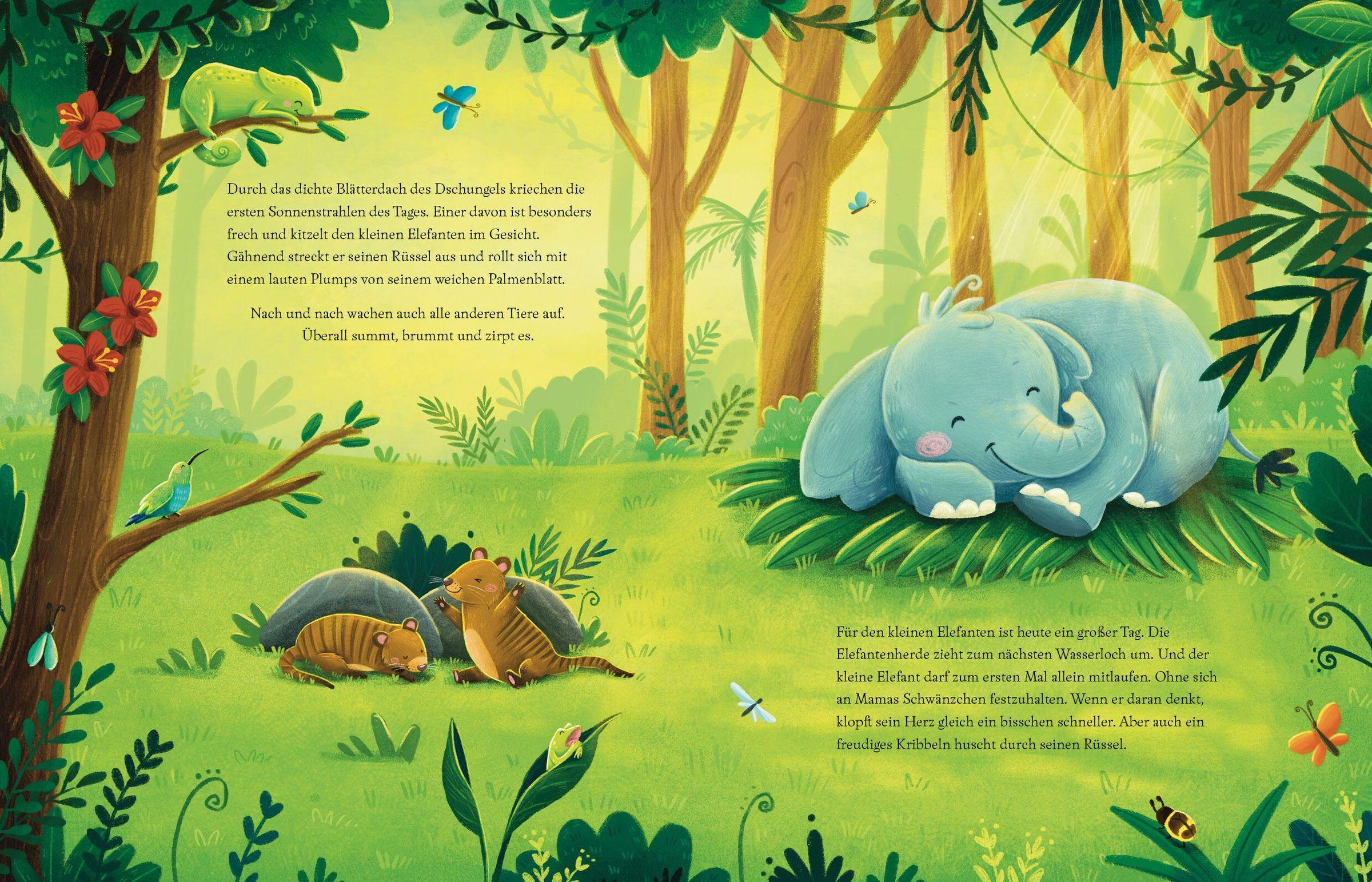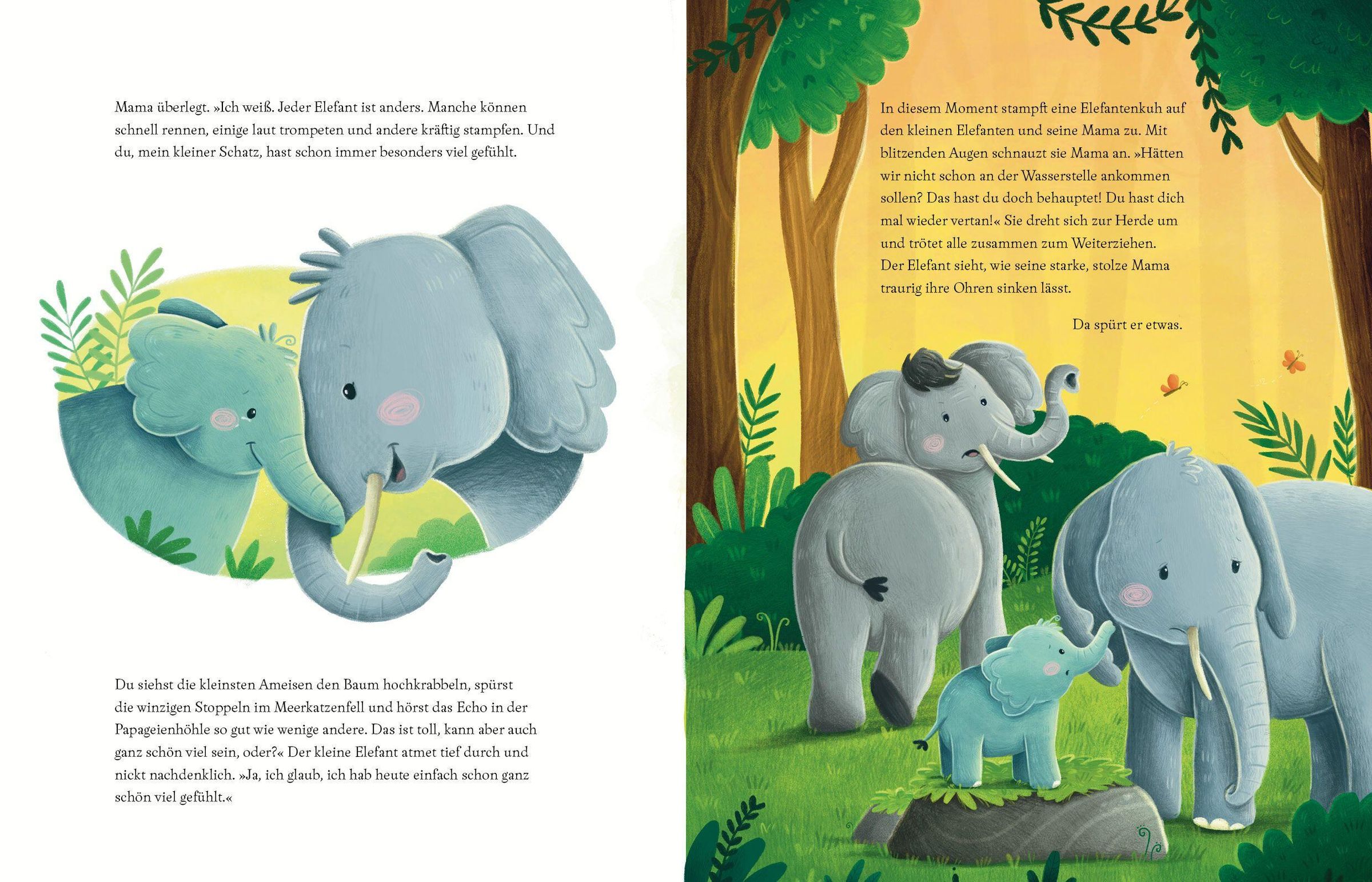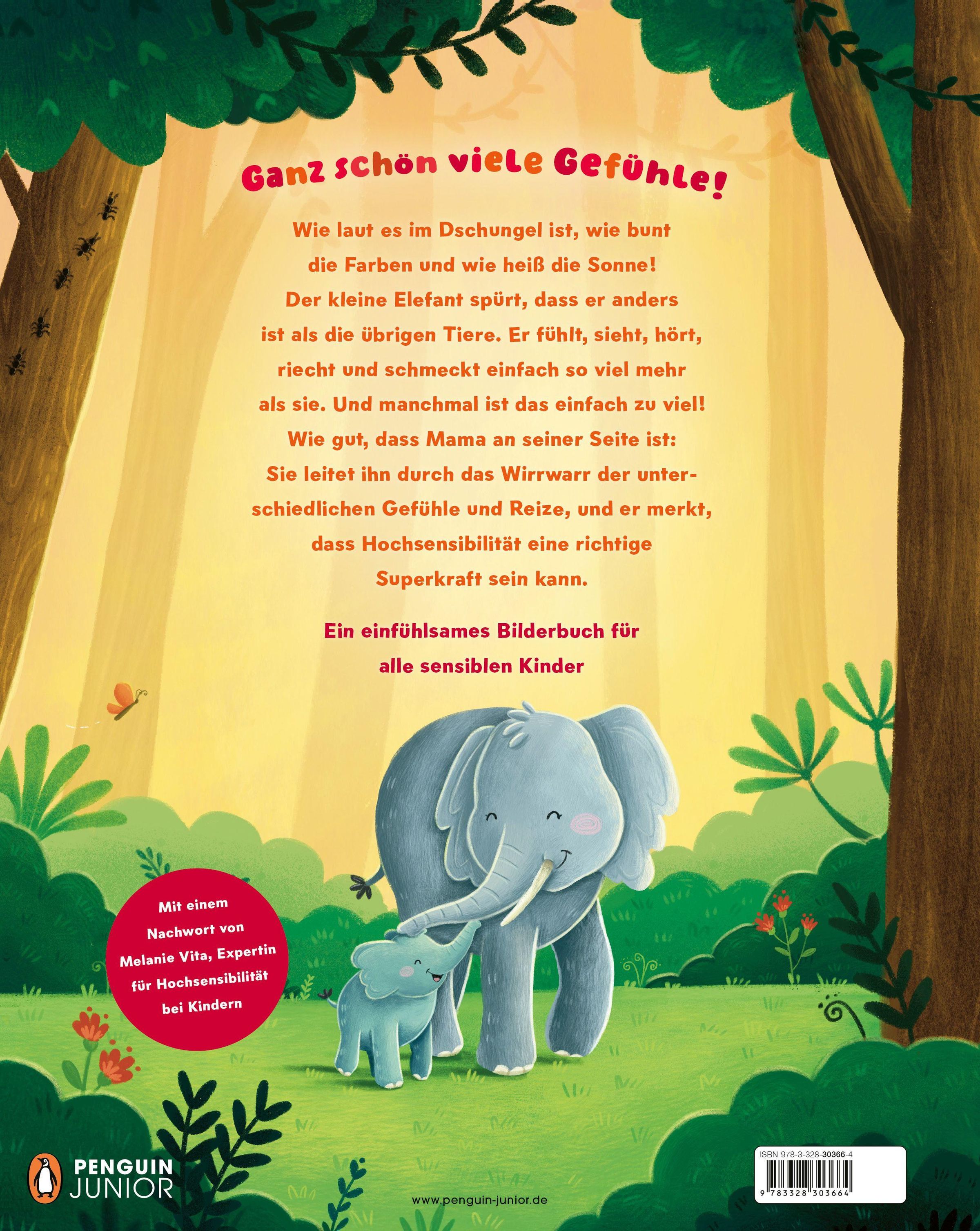 Wie laut es im Dschungel ist, wie bunt die Farben und wie heiß die Sonne! Der kleine Elefant spürt, dass er anders ist als die übrigen Tiere. Er fühlt, sieht, hört, riecht und schmeckt einfach so viel mehr als sie. Und manchmal ist das einfach zu viel! Wie gut, dass Mama an seiner Seite ist: Sie leitet ihn durch das Wirrwarr der unterschiedlichen Gefühle und Reize, und er merkt, dass Hochsensibilität eine richtige Superkraft sein kann.