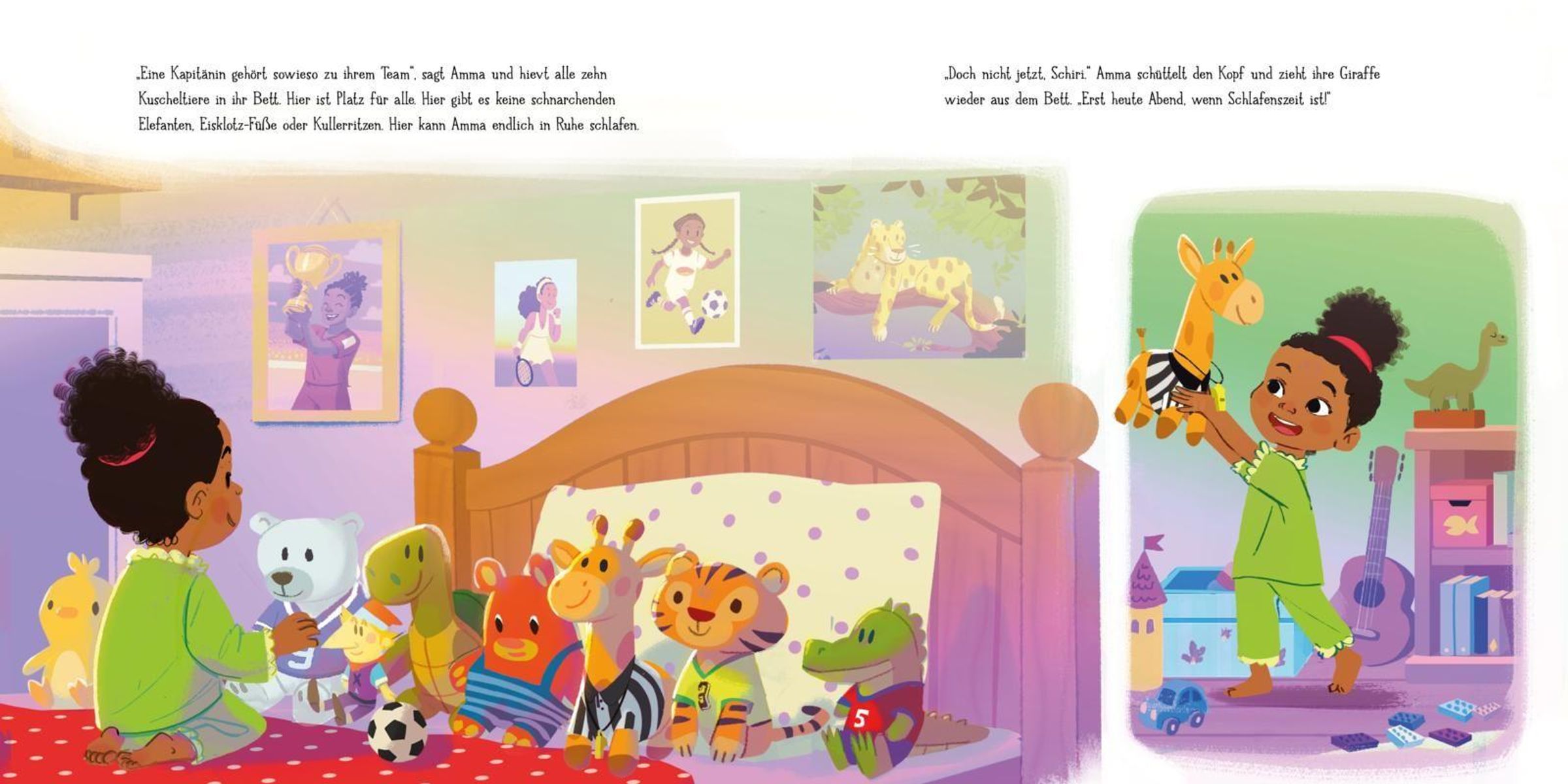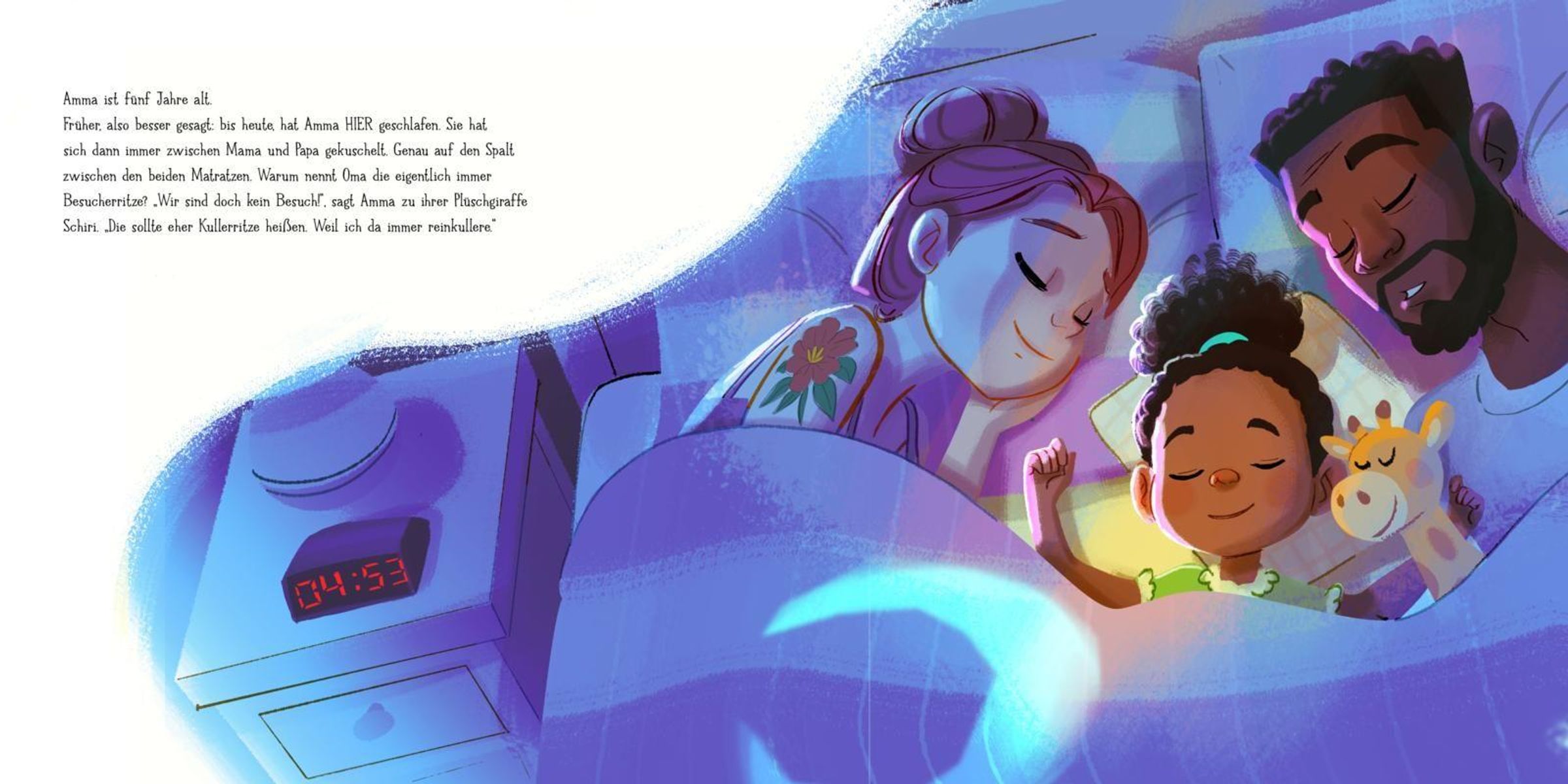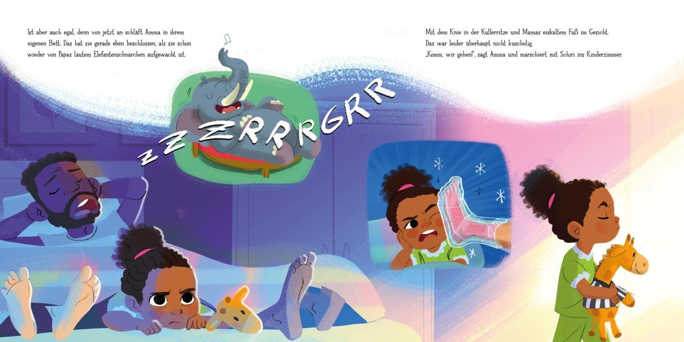 Eigentlich ist es bei Papa und Mama im Bett ganz gemütlich. Doch heute kann Amma einfach nicht in der Kullerritze schlafen. Papa schnarcht wie ein Elefant und Mamas Eisfüße treten. Zeit, ins Kinderzimmer umzuziehen! Amma schnappt sich Schiri und den Rest ihres Kuscheltier-Teams und macht es sichin ihrem eigenen Bett bequem. Endlich schlafen! Doch jedes Mal, wenn ihr gerade die Augen zufallen, stehen auf einmal Mama und Papa in der Tür: mit einem Glas Milch, der Gutenachtgeschichte, einer extra Decke ... wie soll Amma so einschlummern können?