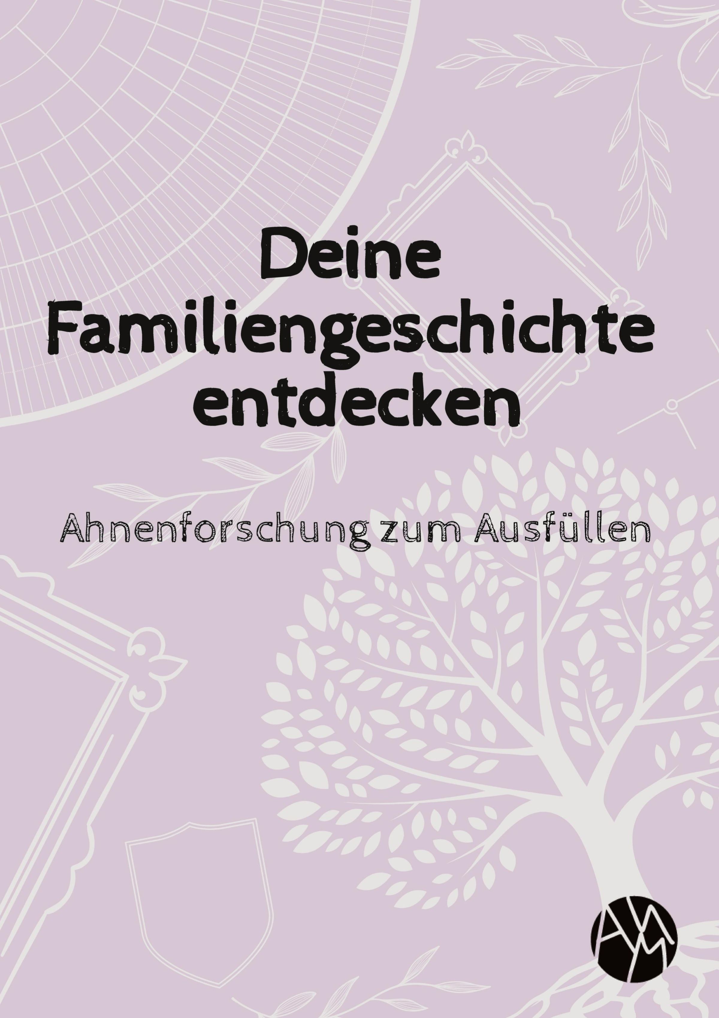 "Deine Familiengeschichte entdecken. Ahnenforschung zum Ausfüllen." Hintergrund: stilisierte Baum- und Rahmenzeichnungen., Buch