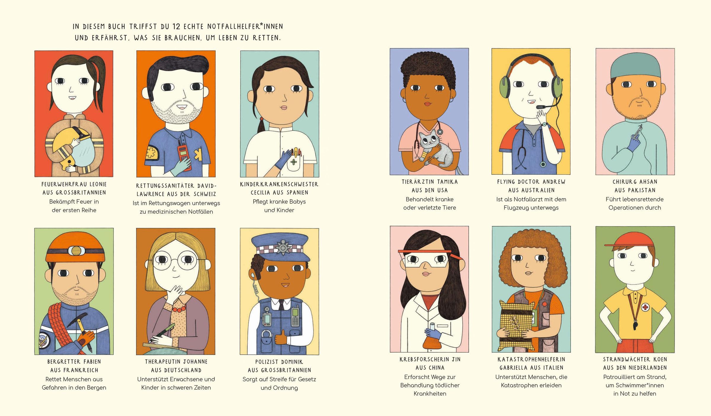 - Begleite 12 echte Notfallhelfer durch ihren Arbeitstag: Feuerwehrfrau, Kinderkrankenschwester, Tierärztin, Polizist, fliegender Arzt, Krebsforscherin u.a.