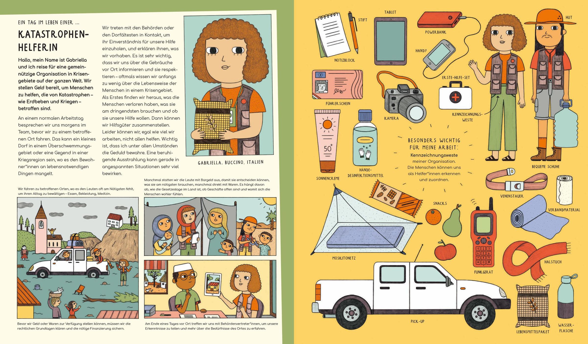 In diesem Buch zeigen dir echte Notfallhelfer alles, was sie brauchen, um Leben zu retten. Zwölf Männer und Frauen aus verschiedenen Ländern, die Menschen und Tieren helfen und Leben retten, erzählen uns von ihrem Berufsalltag und zeigen uns, was sie für ihren Beruf brauchen. Da ist zum Beispiel die Feuerwehrfrau Leonie, deren wichtigstes Werkzeug der Hochdruckschlauch ist, mit dem sie Feuer löschen oder ersticken kann. Das wichtigste Gerät der Kinderkrankenschwester Cecilia ist der Brutkasten, in dem zu früh geborene Babys überleben können. Du triffst auch die Tierärztin Tamika, den Polizist Dominik, Andrew, den fliegenden Arzt aus Australien, die Krebsforscherin Jin und Johanna, die Menschen in schwierigen Zeiten unterstützt. Ein großartiges Buch über unsere wahren Heldinnen und Helden und wichtige Berufe, die oft erst in schwierigen Zeiten so richtig wahrgenommen werden.