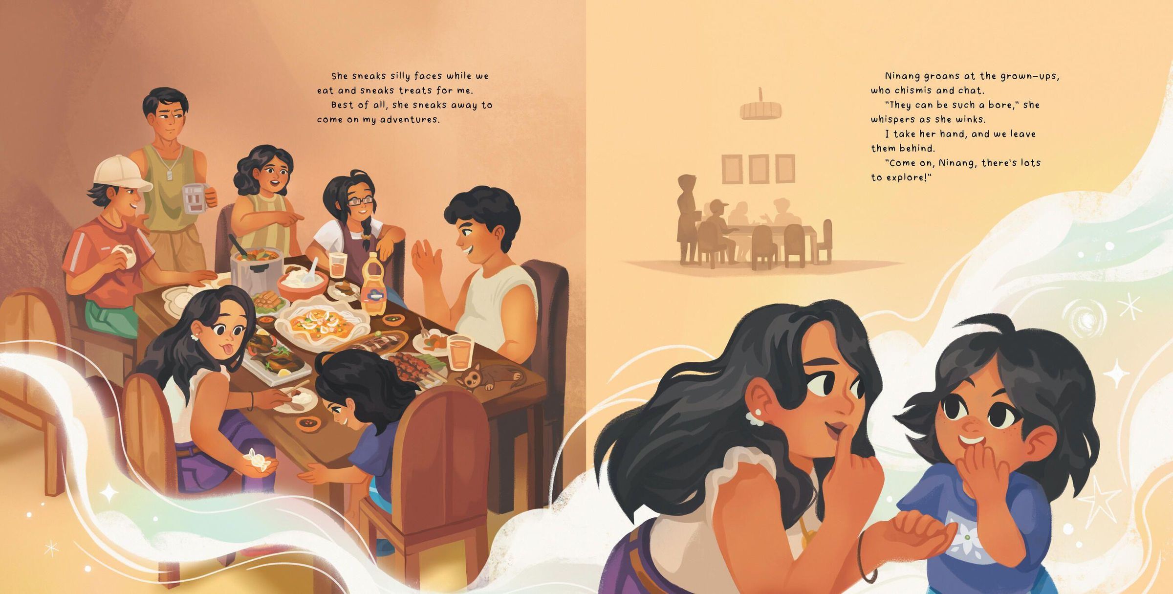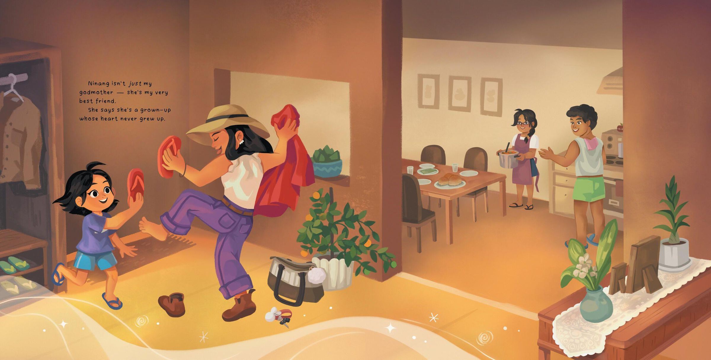 A young girl's ninang ("godmother" in Tagalog) has arrived for a visit, and she's thrilled! After all, Ninang isn't just the girl's godmother, she's also her very best friend. Ninang describes herself as "a grown-up whose heart never grew up," which means the two get to have a day full of adventures, including blasting off into outer space and rescuing lost balloons and cats stuck in trees! Unfortunately, as with all wonderful visits, this one must come to end. Or can the girl find a way to get Ninang to stay?