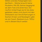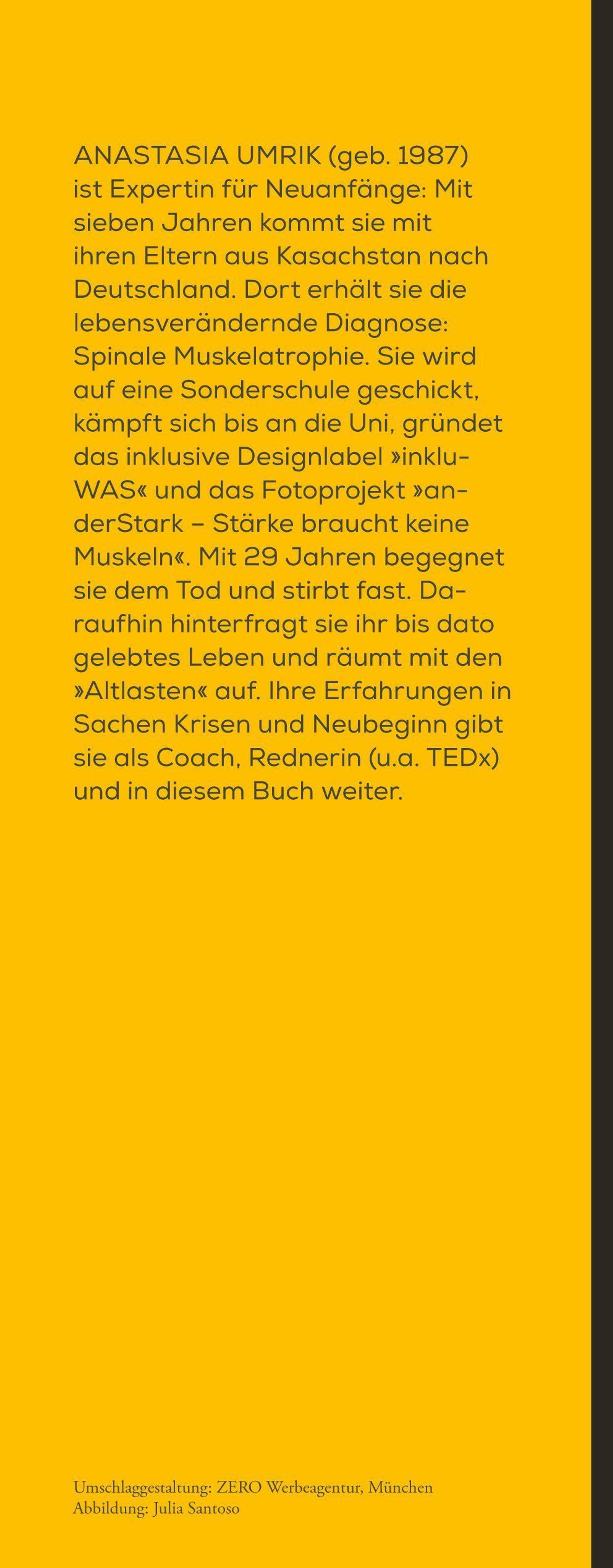 Anastasia Umrik (geb. 1987) ist „Expertin für Neuanfänge" (taz): mit sieben Jahren kommt sie mit ihren Eltern aus Kasachstan nach Deutschland, dort erhält sie die niederschmetternde Diagnose: Muskelatrophie. Sie wird auf eine Sonderschule geschickt, kämpft sich bis an die Uni, gründet das inklusive Designlabel „inkluWAS" und das Fotoprojekt „anderStark - Stärke braucht keine Muskeln". Mit 29 Jahren hat sie eine Nahtoderfahrung. Daraufhin hinterfragt sie ihr bis dato gelebtes Leben und räumt mit den „Altlasten" auf. Ihre Erfahrungen in Sachen Krisen und Neubeginn gibt sie als Coach, Rednerin (u.a. TEDx) und Autorin weiter.Anmerkungen: