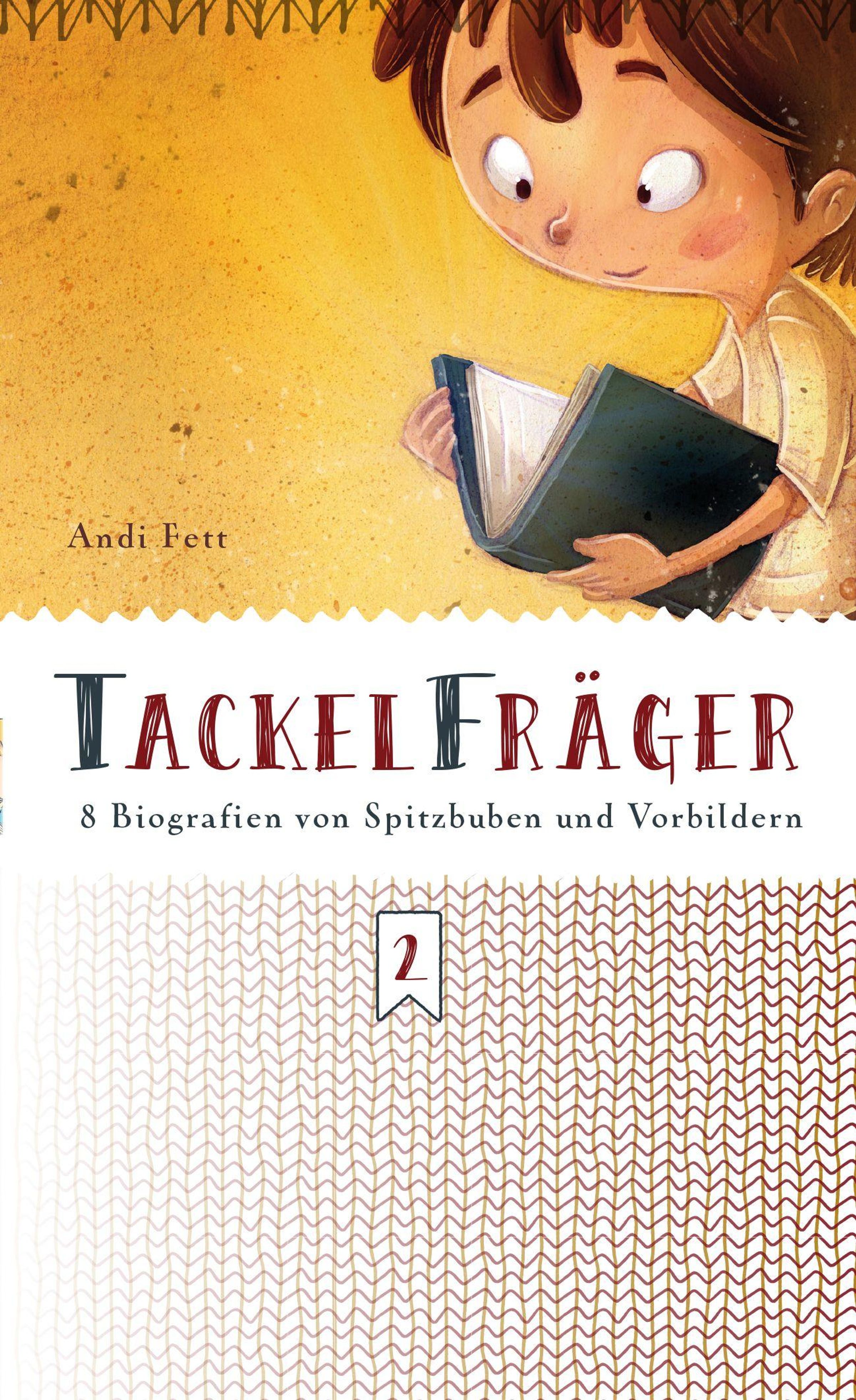 "Tackel Fräger: 8 Biografien von Spitzbuben und Vorbildern. Kind mit Buch, gelber Hintergrund, Illustration.", Buch