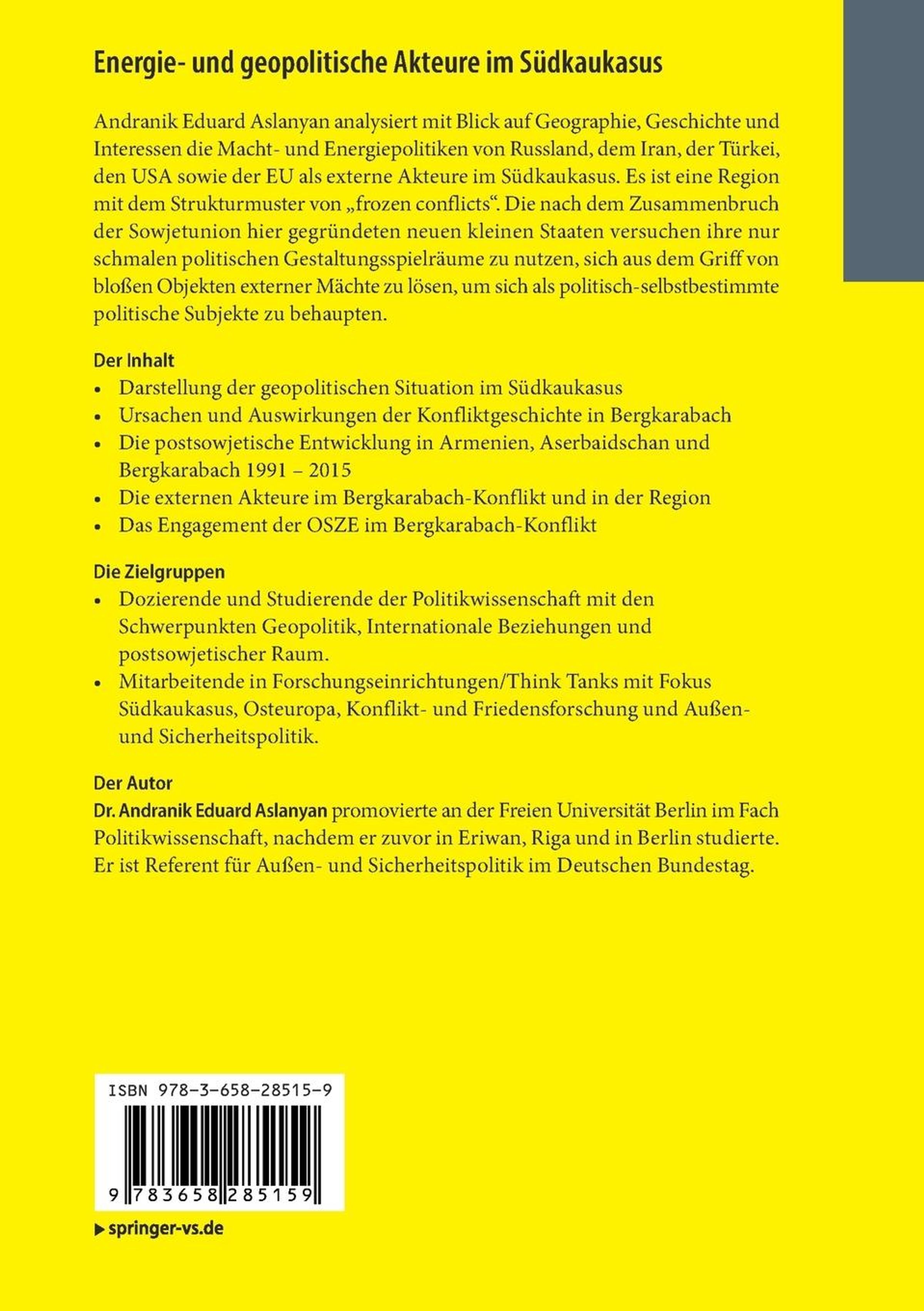 Andranik Eduard Aslanyan analysiert mit Blick auf Geographie, Geschichte und Interessen die Macht- und Energiepolitiken von Russland, dem Iran, der Türkei, den USA sowie der EU als externe Akteure im Südkaukasus. Es ist eine Region mit dem Strukturmuster von ¿frozen conflicts¿. Die nach dem Zusammenbruch der Sowjetunion hier gegründeten neuen kleinen Staaten versuchen ihre nur schmalen politischen Gestaltungsspielräume zu nutzen, sich aus dem Griff von bloßen Objekten externer Mächte zu lösen, um sich als politisch-selbstbestimmte politische Subjekte zu behaupten.