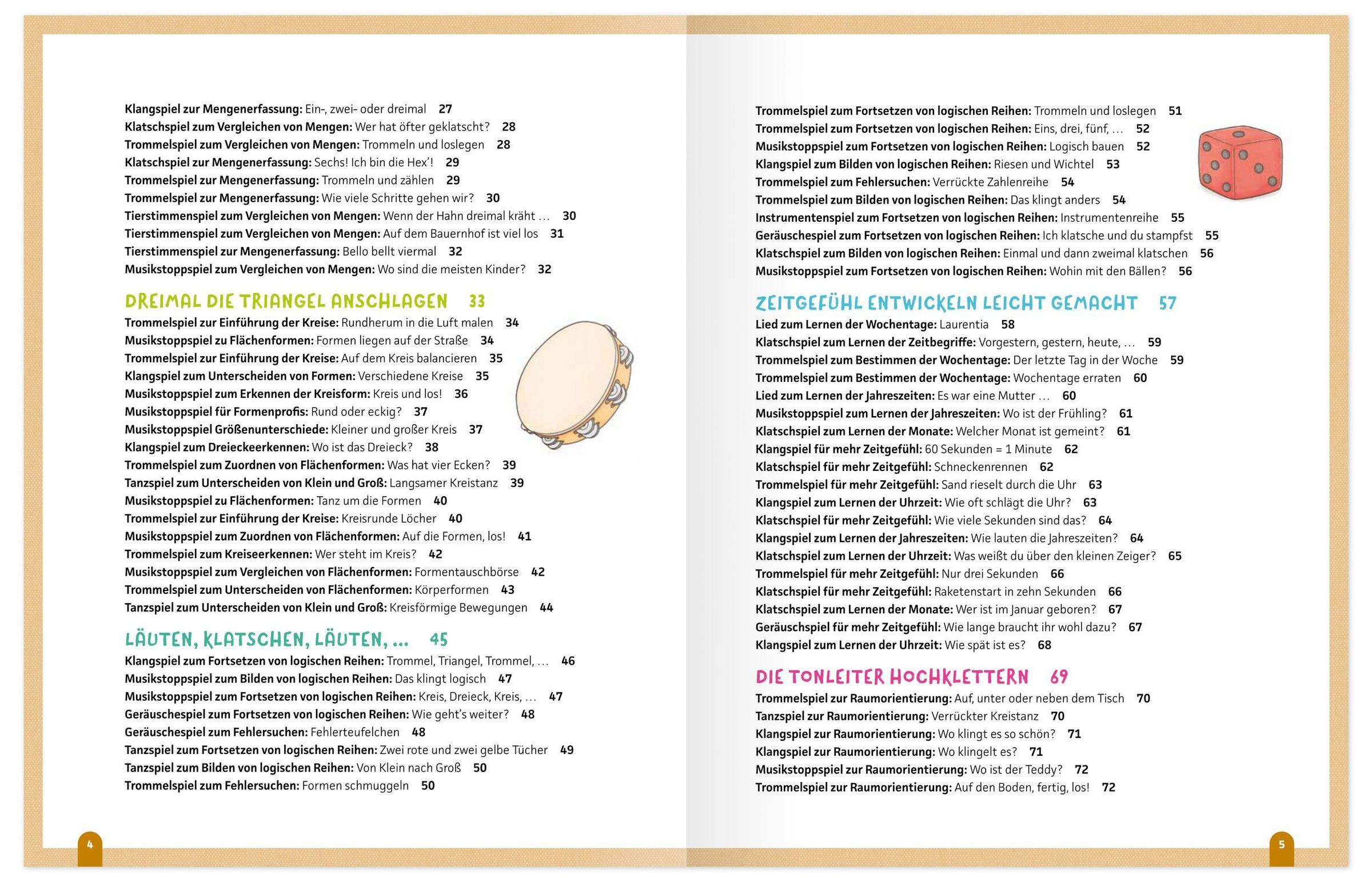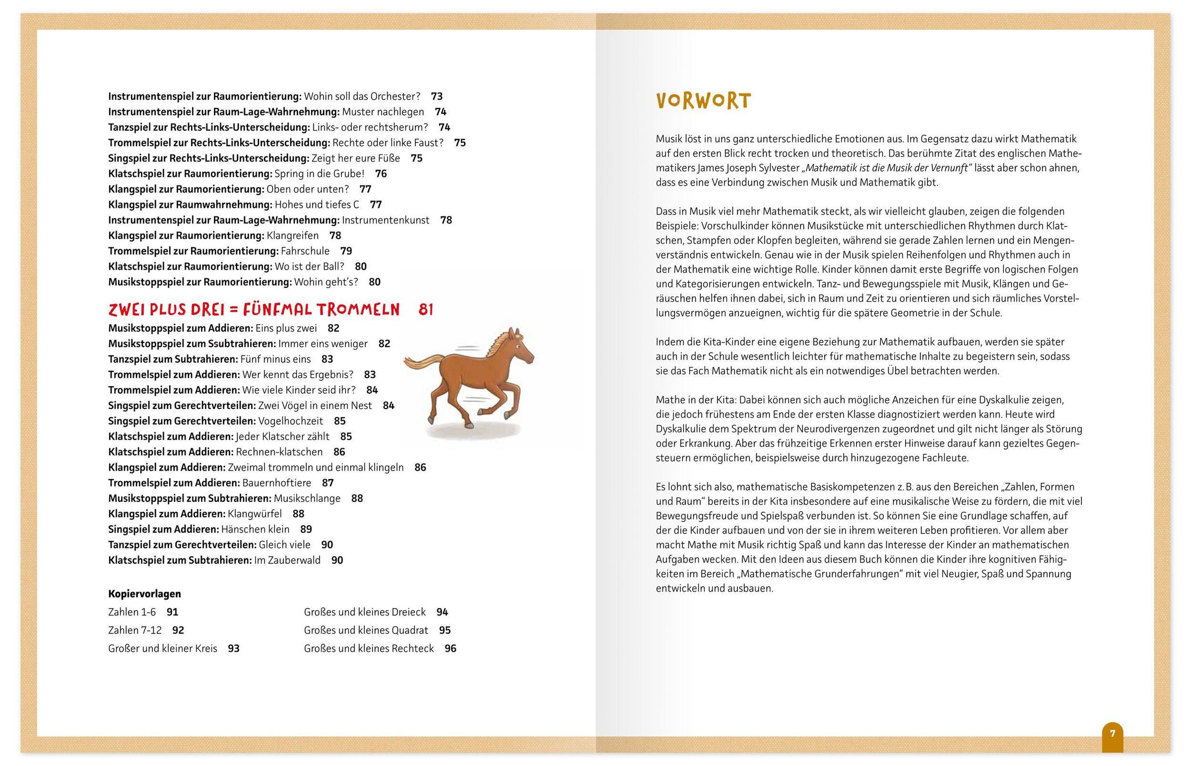 Von Klatsch- und Bewegungsspielen über Trommelideen bis hin zu Zähl-Liedern und rhythmischen Übungen bietet das Buch eine Vielzahl erprobter Impulse, die leicht im Alltag umgesetzt werden können. Die Kinder lernen spielerisch Mengen, Zahlenreihen, Vergleiche und einfache mathematische Zusammenhänge kennen, ohne dass Mathe wie eine trockene Übung wirkt.