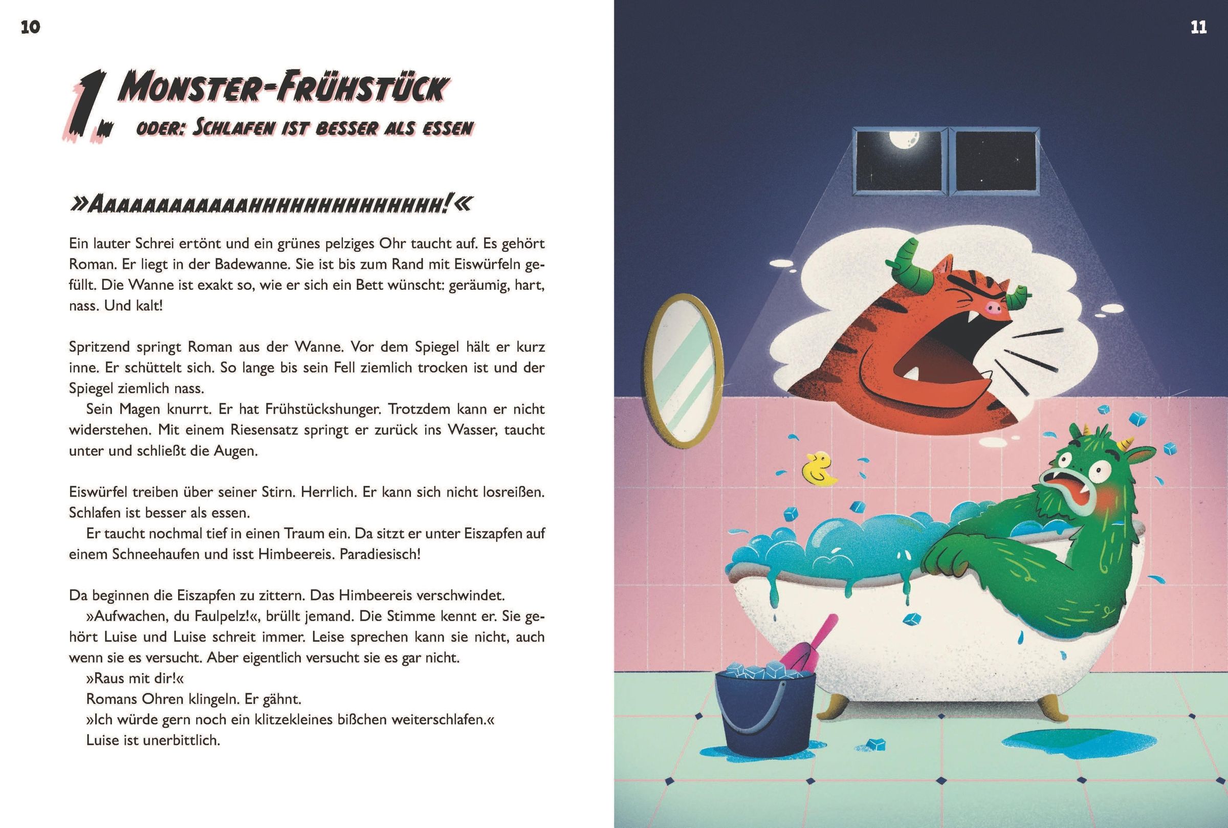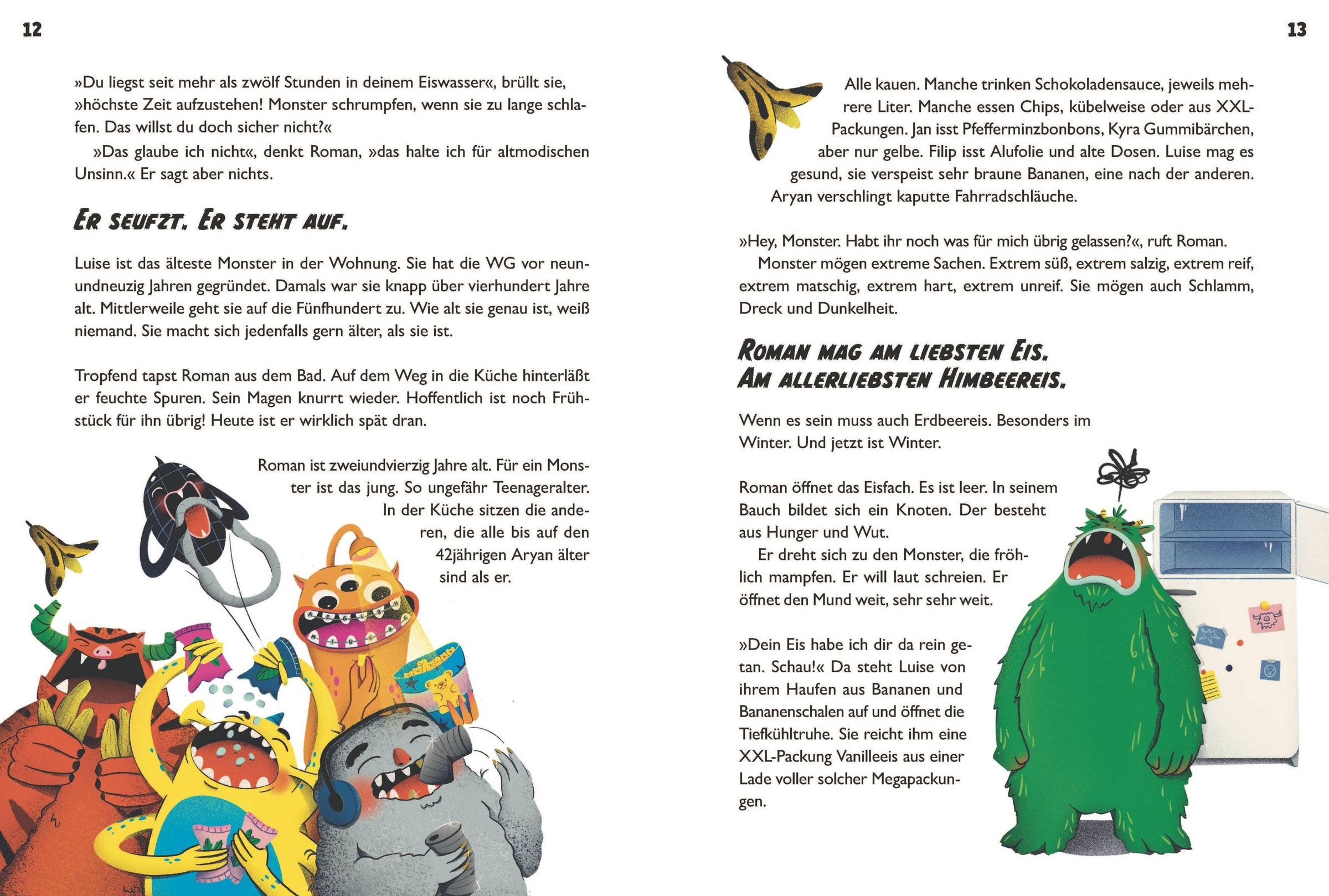 Wenn alle schlafen, erwachen die Monster in der Wohnung. Roman, das grüne Kältemonster, nimmt zuerst einmal ein Bad in einer Wanne voller Eiswürfel, Kyra, das Buchmonster, versteckt sich am liebsten zwischen den Zeilen, Marianne kann sich unsichtbar machen und isst dauernd Zuckerwatte. Doch wie wir Menschen haben auch kleine und große Monster Angst. Als Roman allein in den Park geht, erstarrt er vor Schreck - und Monster müssen ihn retten!