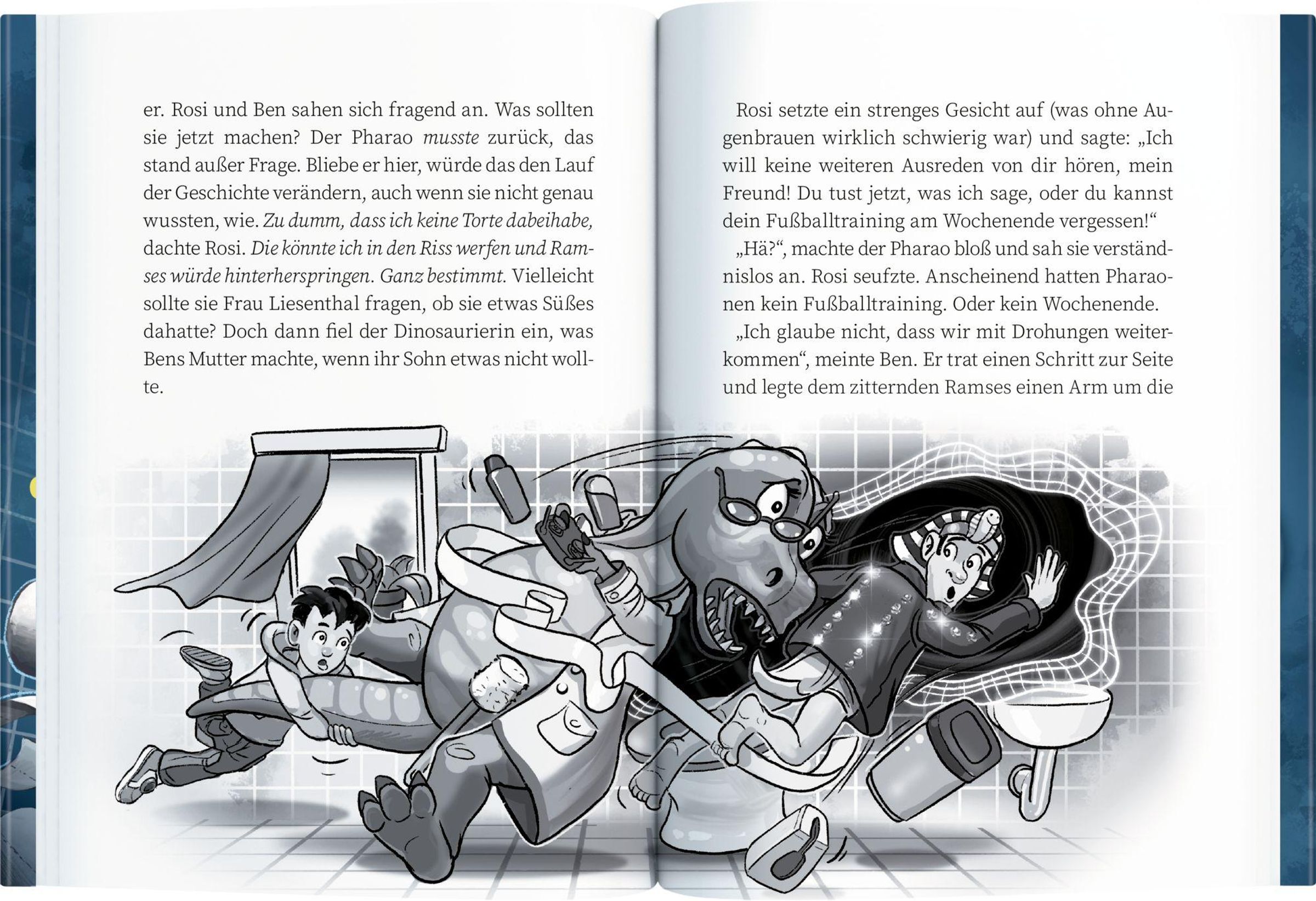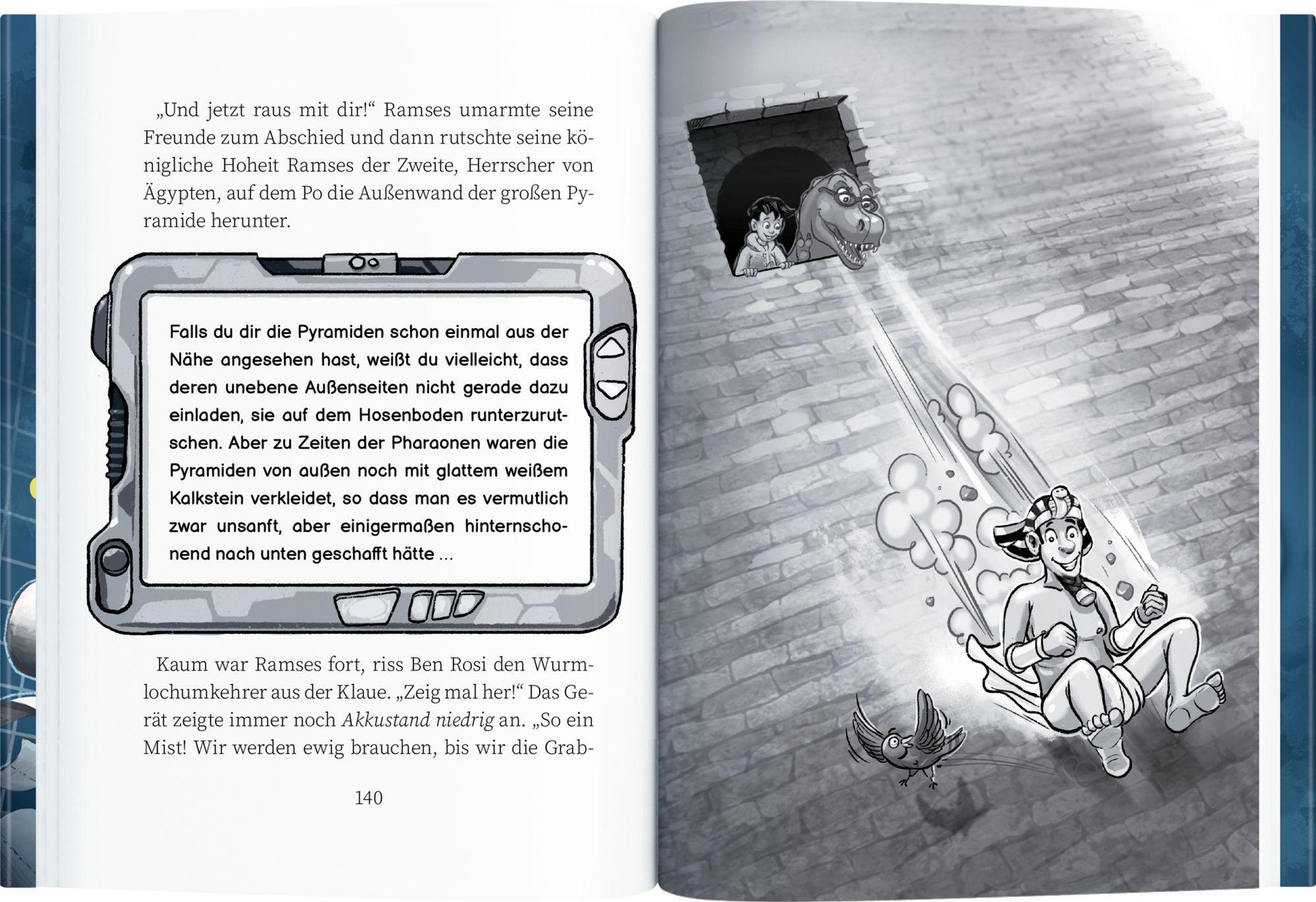 Buchtitel: "Die Zeitreise Chaoten". Untertitel: "Der Pharao im Gästeklo". Illustration: Ein Pharao mit Toilettenpapier., Buch