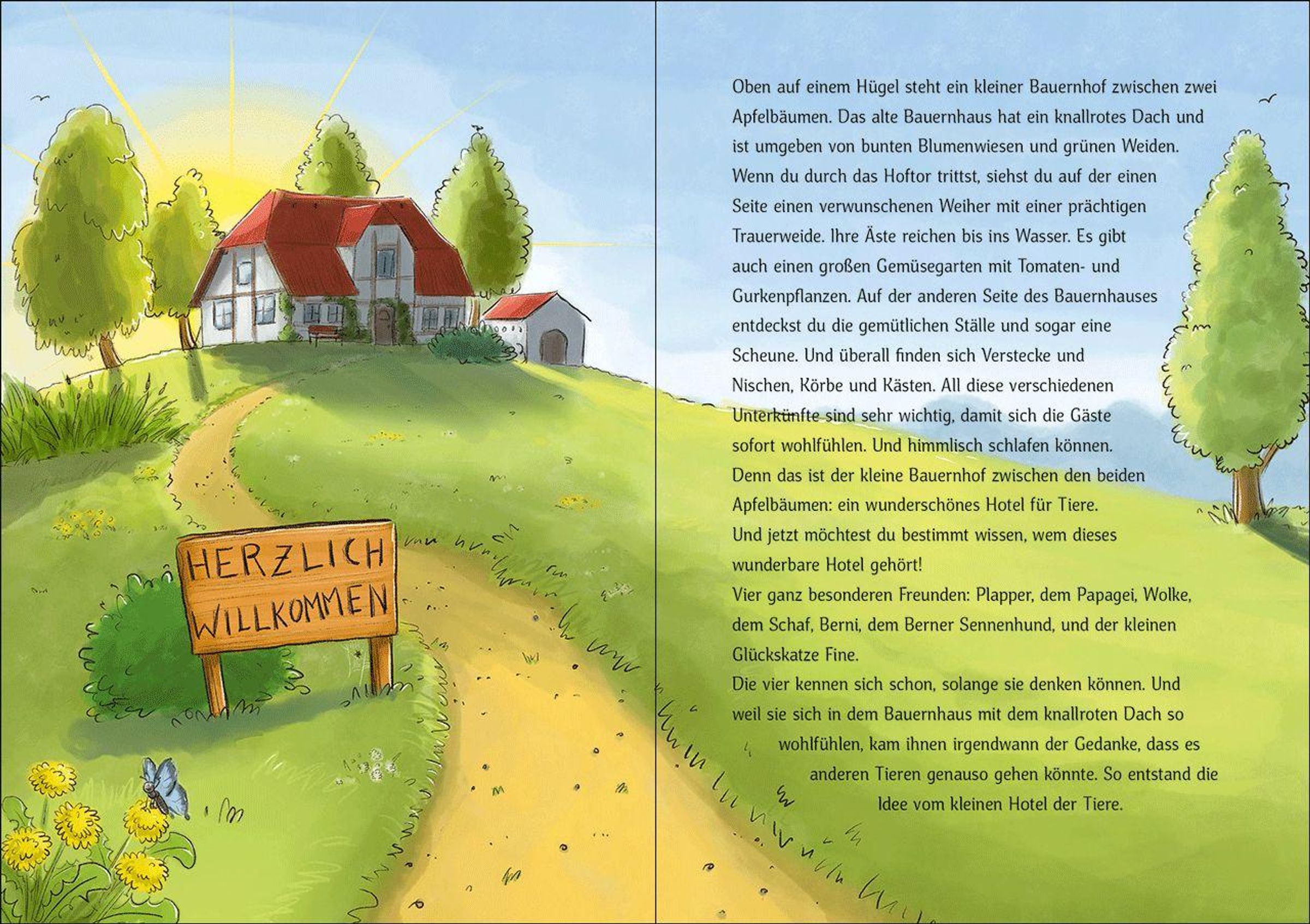 Vorlesezeit ist Zusammenzeit! Auf einem Hügel zwischen zwei Apfelbäumen, steht das kleine Hotel der Tiere. Es gehört vier allerbesten Freunde: Berner Sennenhund Berni, Schaf Wolke, Papagei Plapper und die kleine Glückskatze Fine. Aber ein Hotel zu leiten ist gar nicht so einfach und es gibt immer viel zu tun. Gäste müssen versorgt werden, Wolke braucht dringend Hilfe, ein Geburtstag steht an und dann spukt es auch noch ...! Aber egal ob bei Streit und an miesen Tag oder bei Spaß und guter Laune - diese tierischen Freunde halten immer fest zusammen. Und etwas Schöneres kann es doch gar nicht geben.