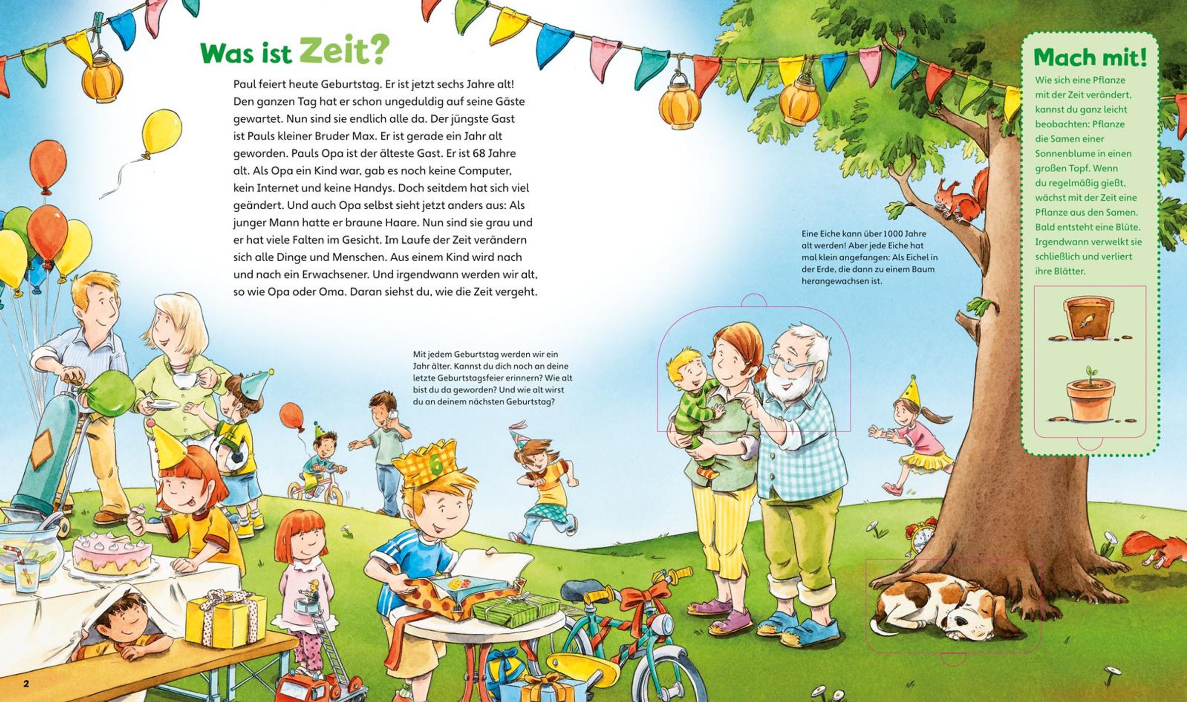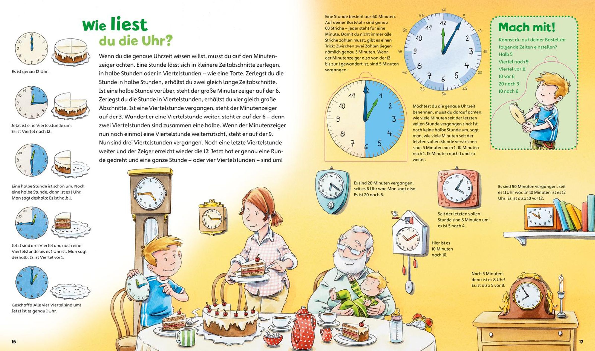 Uhr, Zeit und Uhrzeit sind die Themen in diesem Uhrenbuch für Kinder ab 4 Jahren. Die ihnen zunächst eher abstrakt erscheinenden Begriffe werden anhand ihres Alltags zerlegt und wieder zusammengefügt: zu Stunden, Wochentagen, Monaten, der Zeit zwischen zwei Geburtstagen, Jahreszeiten, Gegenwart und Zukunft ... Mit Uhr zum Selberbasteln und Üben, Entdecker-Klappen, Rätseln und Spielen.