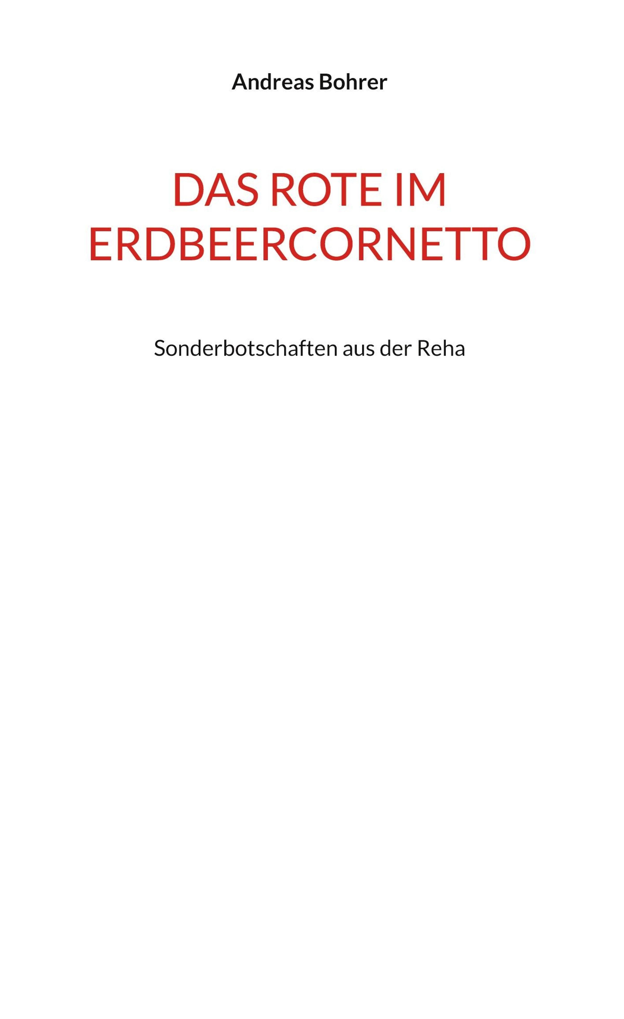 Titel: "DAS ROTE IM ERDBEERCORNETTO", Autor: Andreas Bohrer, Untertitel: "Sonderbotschaften aus der Reha". Weißer Hintergrund., Buch