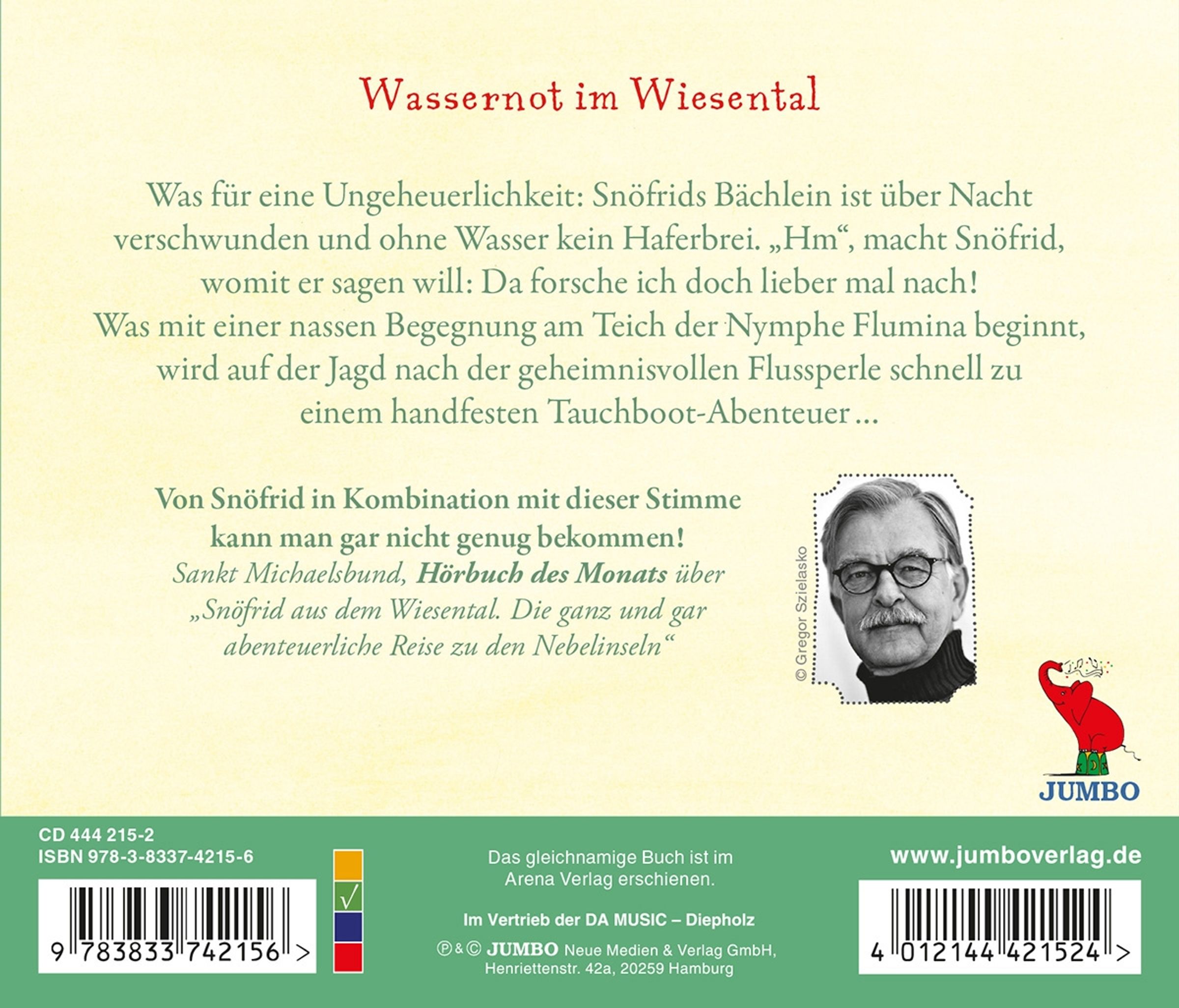 Ein Bächlein macht die Biege Was für eine Ungeheuerlichkeit: Snöfrids Bächlein ist über Nacht verschwunden! Ohne Wasser kein Haferbrei ... und deshalb braucht Snöfrid auch nicht lange zu überlegen. Um diese Sache muss er sich kümmern! Was mit einer nassen Begegnung am Teich der kleinen Nymphe Flumina beginnt, wird auf der Jagd nach der geheimnisvollen Flussperle schnell zu einem handfesten Tauchboot-Abenteuer mit ungewissem Ausgang ...