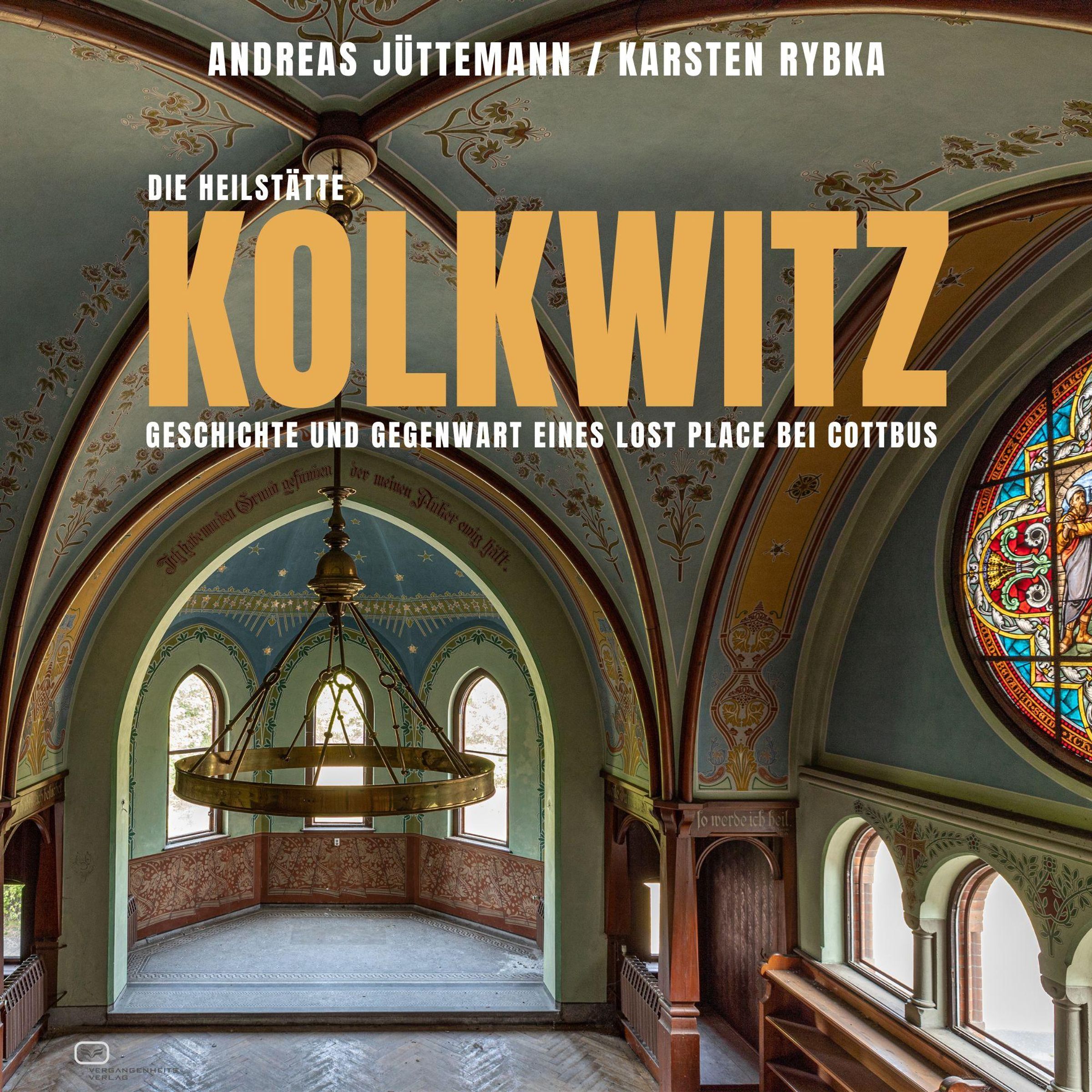 „Die Heilstätte Kolkwitz: Geschichte und Gegenwart eines Lost Place bei Cottbus“ von Andreas Jüttemann/Karsten Rybka. Zeigt einen historischen, reich verzierten Raum mit Buntglasfenster., Buch