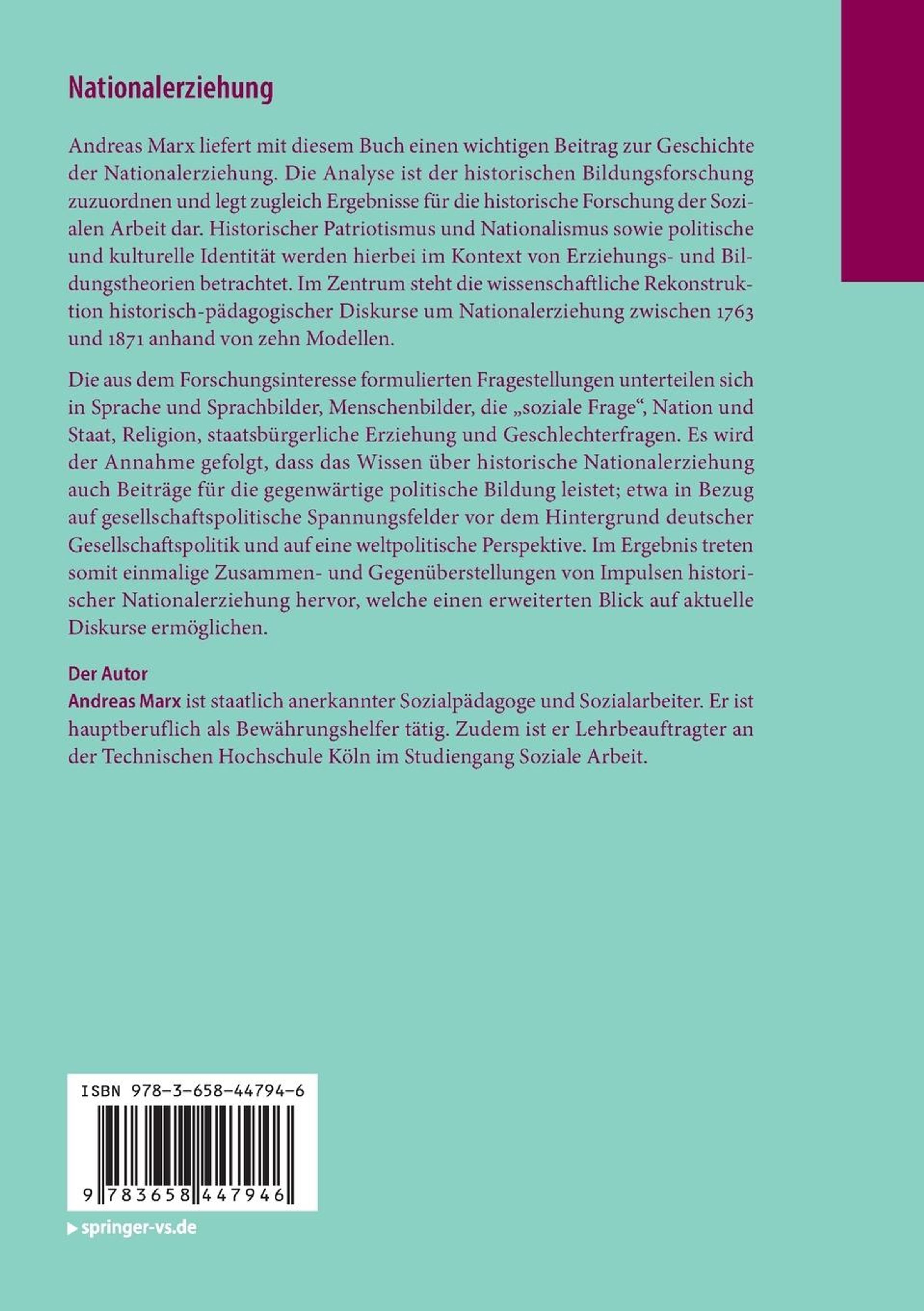 Andreas Marx liefert mit diesem Buch einen wichtigen Beitrag zur Geschichte der Nationalerziehung. Die Analyse ist der historischen Bildungsforschung zuzuordnen und legt zugleich Ergebnisse für die historische Forschung der Sozialen Arbeit dar. Historischer Patriotismus und Nationalismus sowie politische und kulturelle Identität werden hierbei im Kontext von Erziehungs- und Bildungstheorien betrachtet. Im Zentrum steht die wissenschaftliche Rekonstruktion historisch-pädagogischer Diskurse um Nationalerziehung zwischen 1763 und 1871 anhand von zehn Modellen.