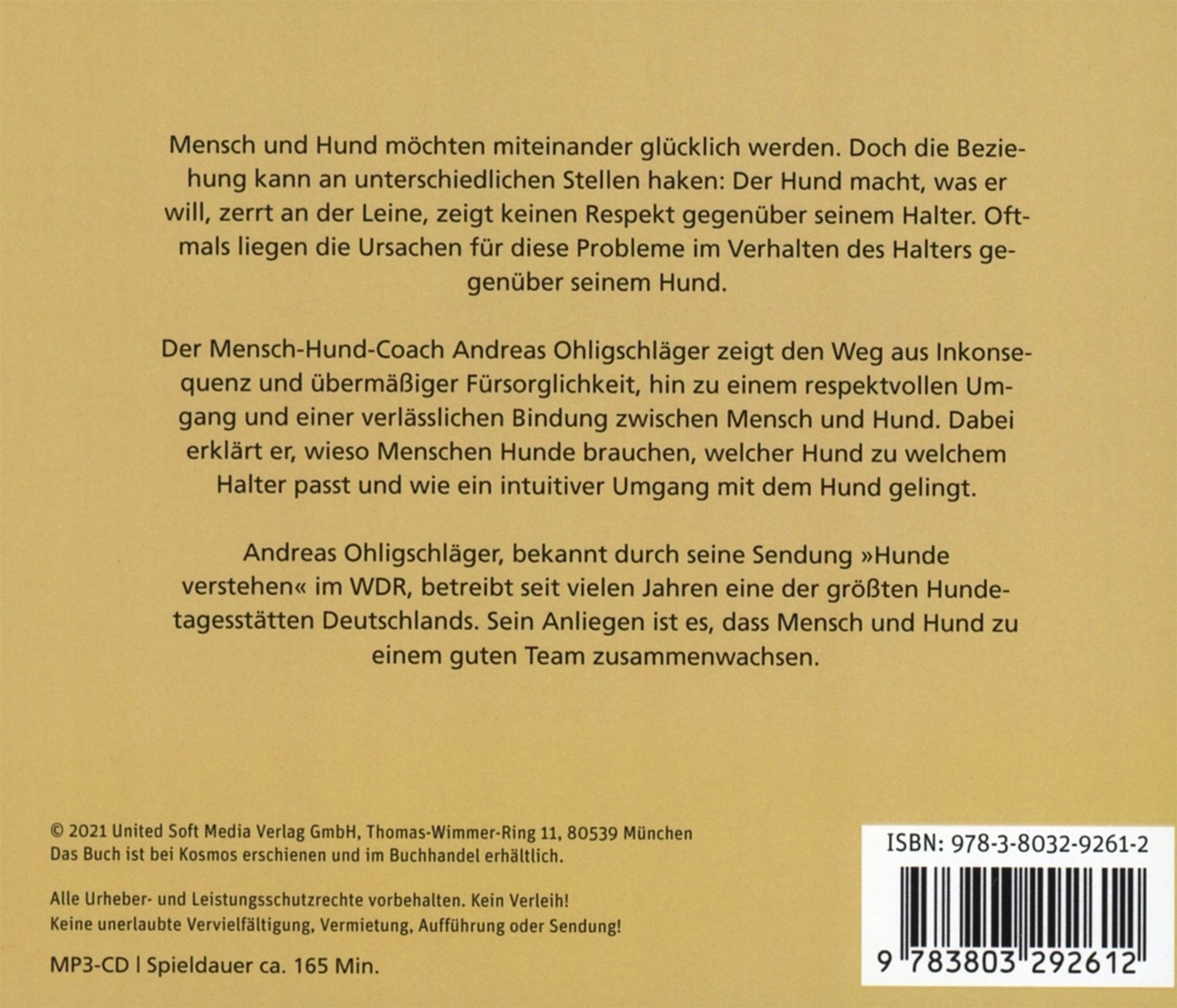 Andreas Ohligschläger, bekannt durch seine Coaching-Reihe im WDR-Fernsehen, wird täglich mit Problemen konfrontiert, die (Erst-)Hundehaltern das Leben mit ihrem Tier schwer machen. Sein Anliegen ist es, dass der Mensch ein Gefühl für Wesen und Verhalten seines Hundes entwickelt und dadurch zum echten Team mit ihm zusammenwächst. In diesem Buch stellt der erfolgreiche Mensch-Hund-Coach seine Philosophie vor, zeigt, wie er arbeitet, und gibt Anstöße dazu, wie man zu einem Menschen wird, den sich sein Hund aussuchen würde.