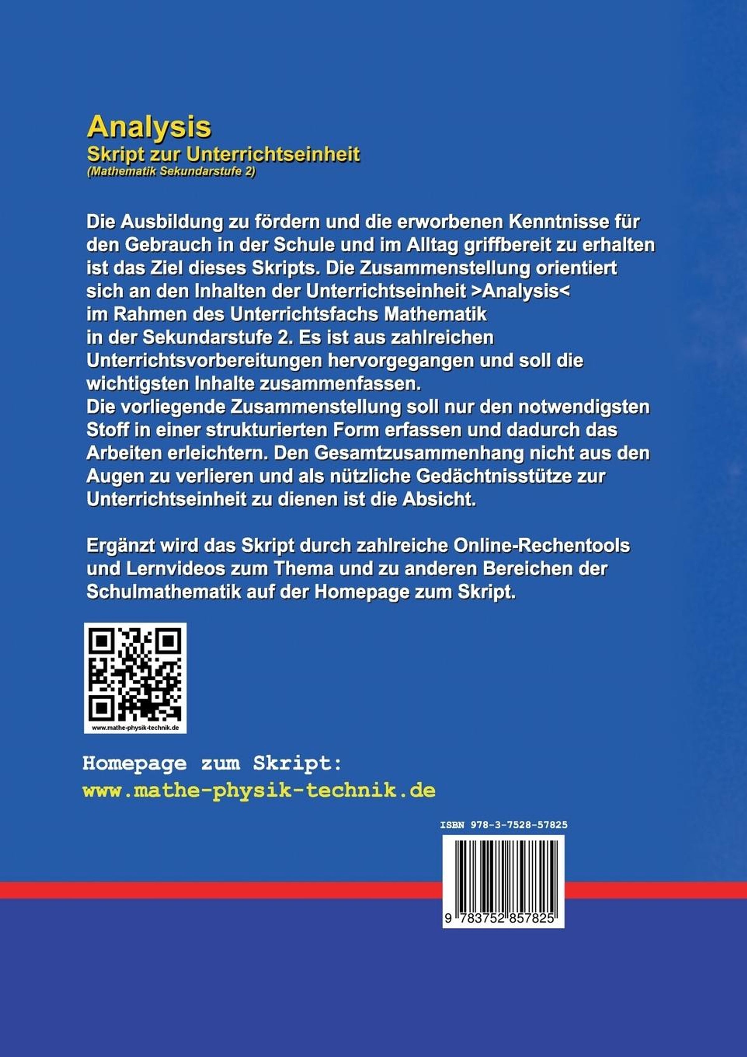Die Ausbildung zu fördern und die erworbenen Kenntnisse für den Gebrauch in der Schule und im Alltag griffbereit zu erhalten ist das Ziel dieses Skripts. Die Zusammenstellung orientiert sich an den Inhalten der Unterrichtseinheit Analysis im Rahmen des Unterrichtsfachs Mathematik (Sek 2). Es ist aus zahlreichen Unterrichtsvorbereitungen der vergangenen Jahre hervorgegangen und soll die wichtigsten Inhalte zusammenfassen. Die vorliegende Zusammenstellung soll nur den notwendigsten Stoff in einer strukturierten Form erfassen und dadurch das Arbeiten erleichtern. Den Gesamtzusammenhang nicht aus den Augen zu verlieren ist die Absicht. Als nützliche Gedächtnisstütze zur Unterrichtseinheit zu dienen ist das Ziel.