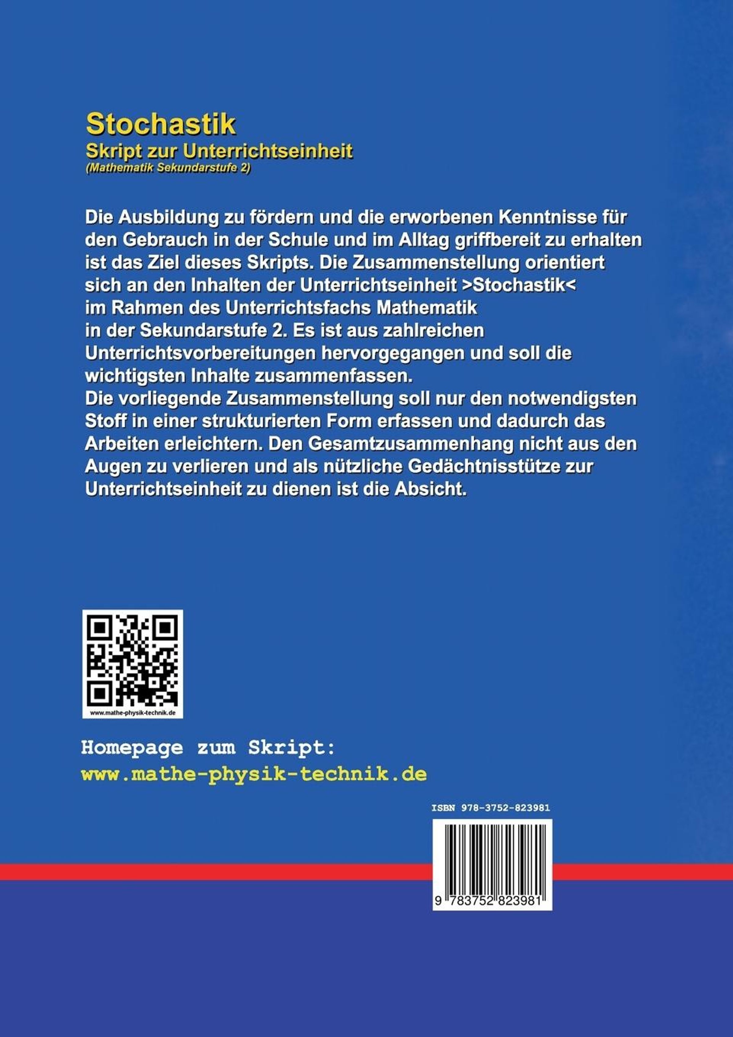 Die Ausbildung zu fördern und die erworbenen Kenntnisse für den Gebrauch in der Schule und im Alltag griffbereit zu erhalten, ist das Ziel dieses Skripts. Die Zusammenstellung orientiert sich an den Inhalten der Unterrichtseinheit >Stochastik< im Rahmen des Mathematikunterrichts (Sekundarstufe 2). Es ist aus zahlreichen Unterrichtsvorbereitungen der vergangenen Jahre hervorgegangen und soll die wichtigsten Inhalte zusammenfassen. Die vorliegende Zusammenstellung soll nur den notwendigsten Stoff in einer strukturierten Form erfassen und dadurch das Arbeiten erleichtern. Den Gesamtzusammenhang nicht aus den Augen zu verlieren, ist die Absicht. Jedes Lehrbuch lebt von der kritischen Mitarbeit der Leser. Der Verfasser freut sich deshalb über Verbesserungsvorschläge oder Hinweise auf mögliche Druckfehler. Als nützliche Gedächtnisstütze zur Unterrichtseinheit zu dienen, ist das Ziel.