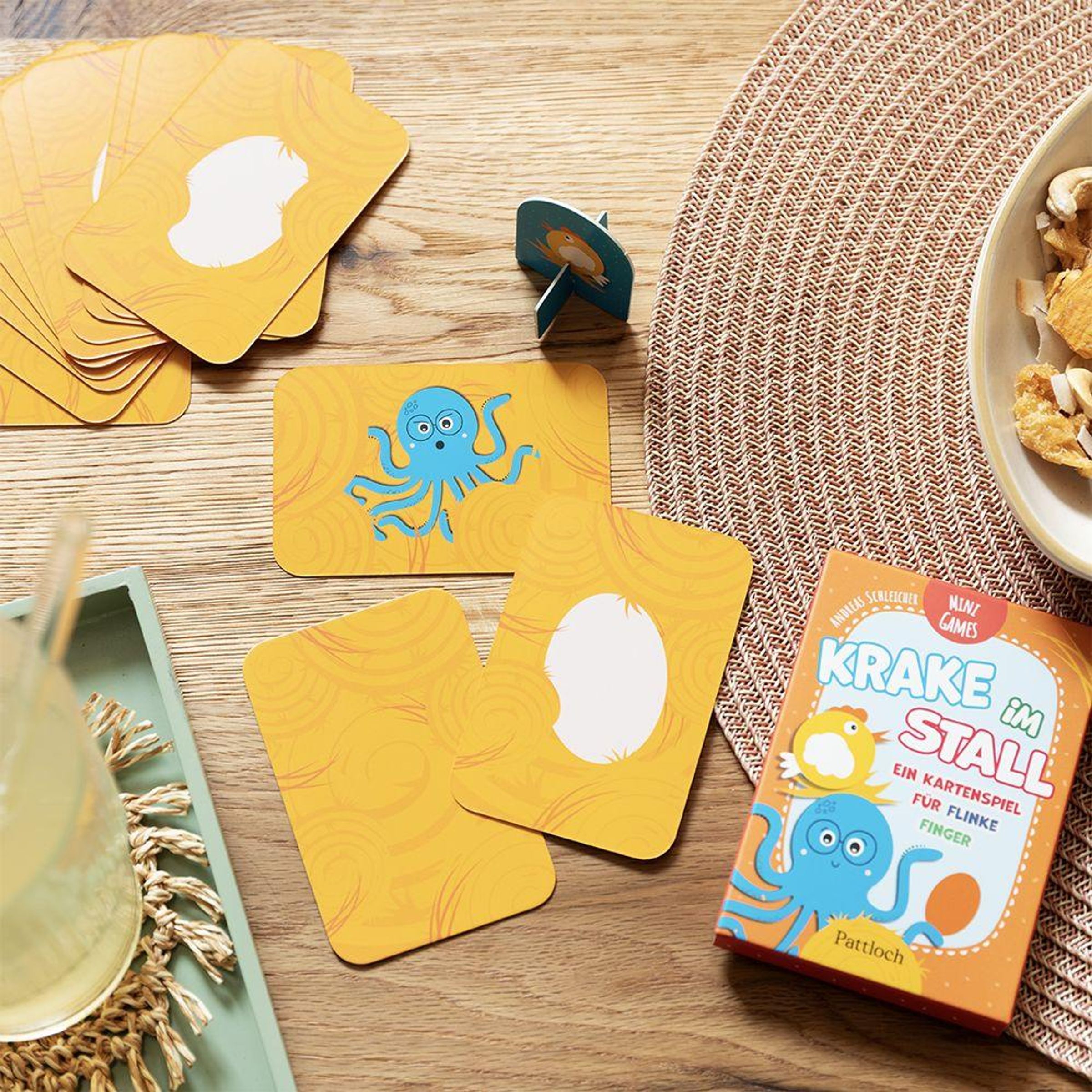 Das rasante Kinderspiel ab 6 Jahren kommt mit 5 Eikarten, 1 Krakenkarte, 9 Strohkarten, 1 Spielfigur und mit einfachen Regeln, kurzen Runden und großem Spielspaß!