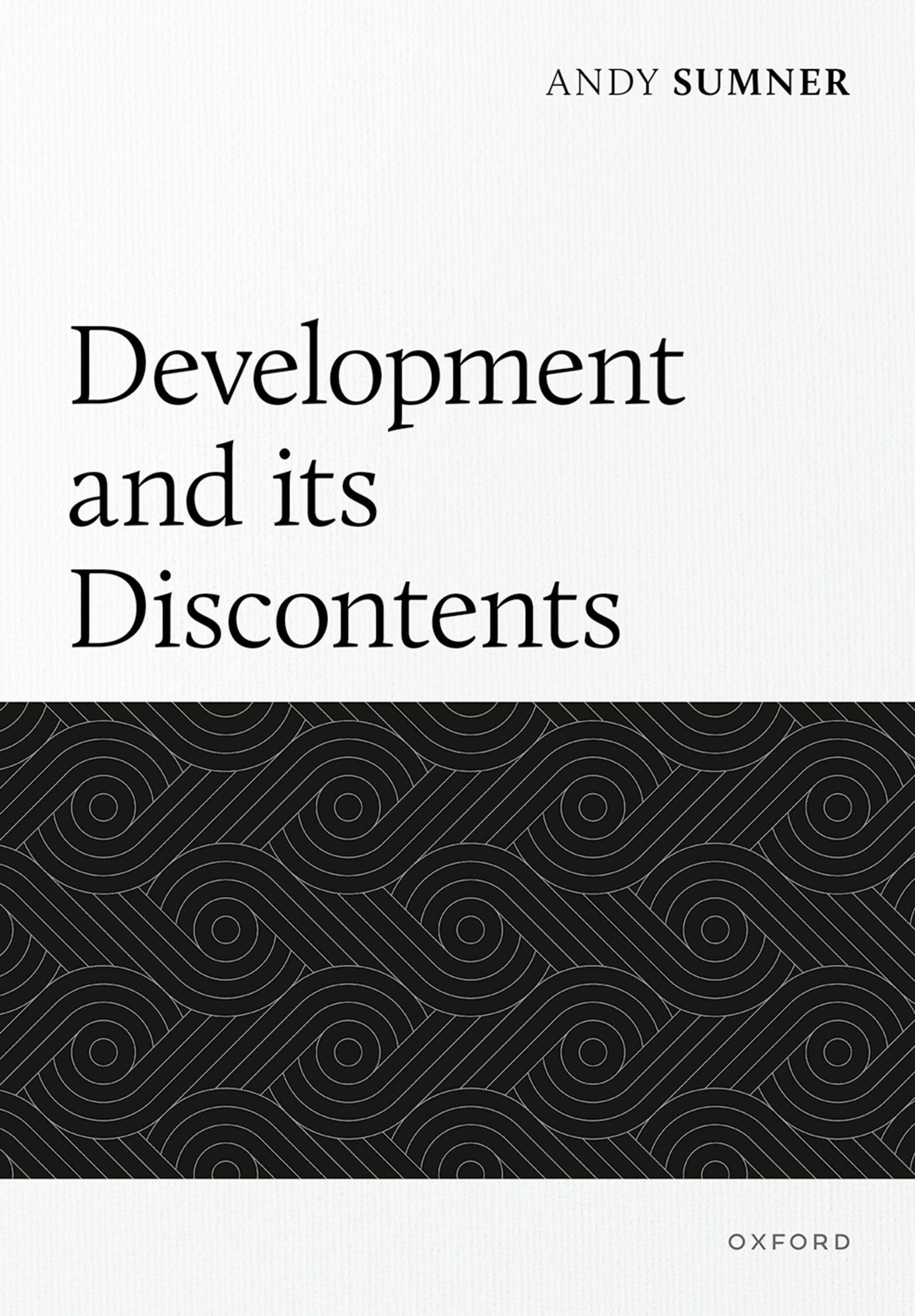 ANDY SUMNER, "Development and its Discontents", OXFORD. Abstrakte weiße Spiralmuster auf schwarzem Hintergrund., Buch