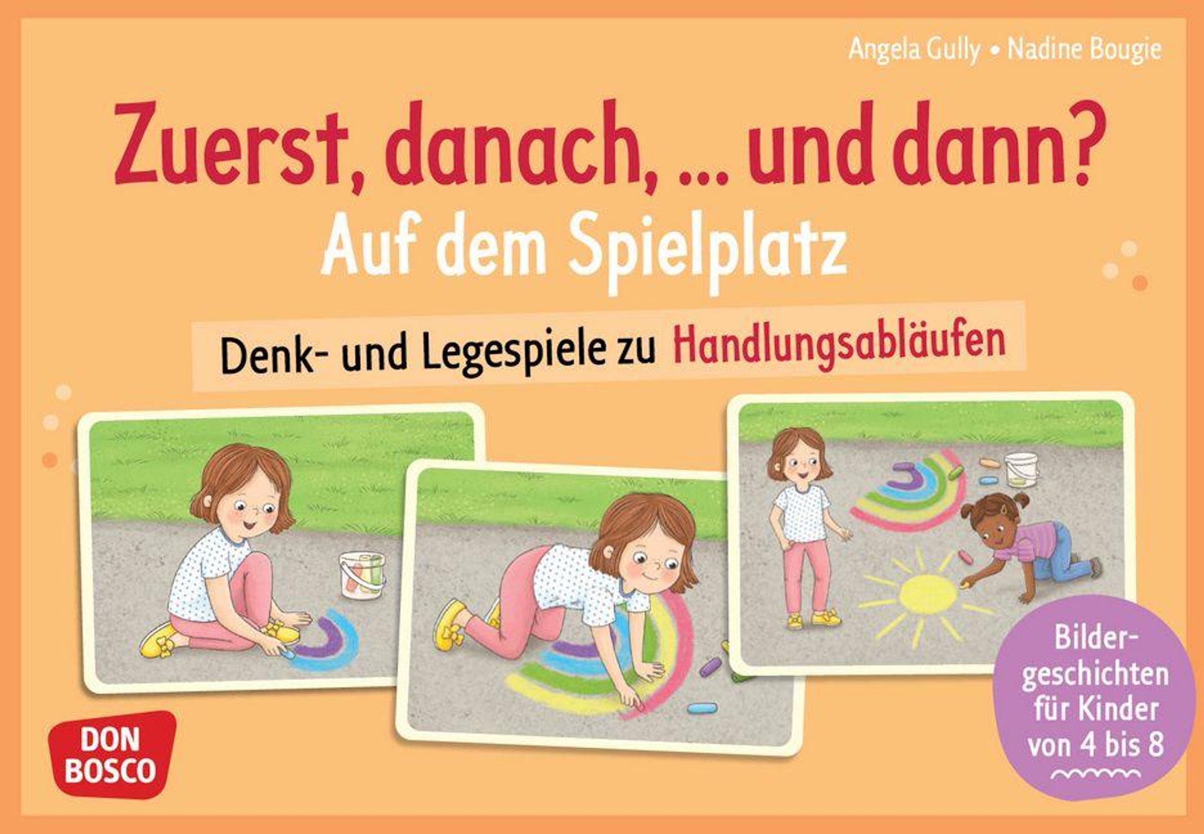 Wer steigt zuerst auf die Korbschaukel - und wer folgt? Wie viele Schritte braucht es, bis die Sandburg fertig ist? Und in welcher Reihenfolge entstehen die Farben des Regenbogens mit Straßenkreide? Für dieses Legespiel wurden kleine Spielplatz-Geschichten in drei oder vier Handlungsschritte aufgeteilt. Ziel des Spieles ist es, die richtige zeitliche Abfolge für die Bildkarten zu finden - das fördert logisches Denken und die visuelle Wahrnehmung.