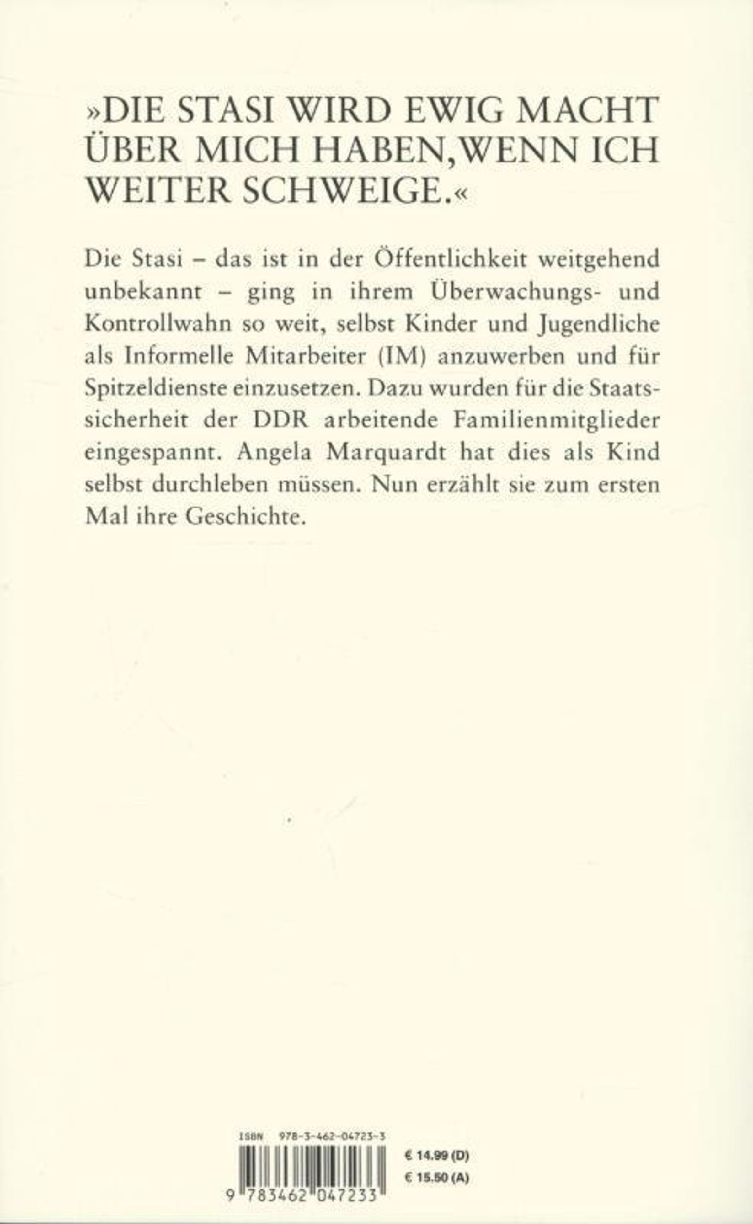 Angela Marquardt zeigt in ihrem Buch, wie die Staatssicherheit Kinder und Jugendliche systematisch und skrupellos missbrauchte. Es ist aber auch eine Geschichte darüber, wie man sich von seiner Vergangenheit befreien kann. Die Wende ist für Angela Marquardt ein Glücksfall. Durch einen Zufall gerät die junge Punkerin aus Greifswald in die Politik. In der PDS macht sie schnell Karriere, wird mit 25 stellvertretende Parteivorsitzende und später Bundestagsabgeordnete. In Berlin kann sie endlich Abstand von den schwierigen Familienverhältnissen gewinnen, aus denen sie kommt. Doch 2002 platzt die Nachricht in ihr Leben: Es sind Auszüge aus einer Stasi-Akte gefunden worden, in denen sie sich im Alter von 15 Jahren zur Zusammenarbeit mit dem Ministerium für Staatssicherheit verpflichtet. Während eine öffentliche Hetzjagd auf die Politikerin beginnt, versucht sie, Erinnerungen wiederzufinden. Nach Differenzen verlässt sie die PDS, tritt später in die SPD ein. Aber die Gespenster der Vergangenheit lassen sie nicht los. Als sie eines Tages zufällig jenem Mann begegnet, der früher ihr 'Führungsoffizier' war, fasst sie einen Entschluss: Sie will die ganze Geschichte erzählen. Es wird eine schmerzhafte, schonungslose Reise in die Vergangenheit, in deren Verlauf sie Dinge entdeckt, von denen sie nichts ahnte. Anhand ihrer Erinnerungen, ihrer eigenen Akte und anderer Dokumente rekonstruiert Angela Marquardt, was damals wirklich geschehen ist.