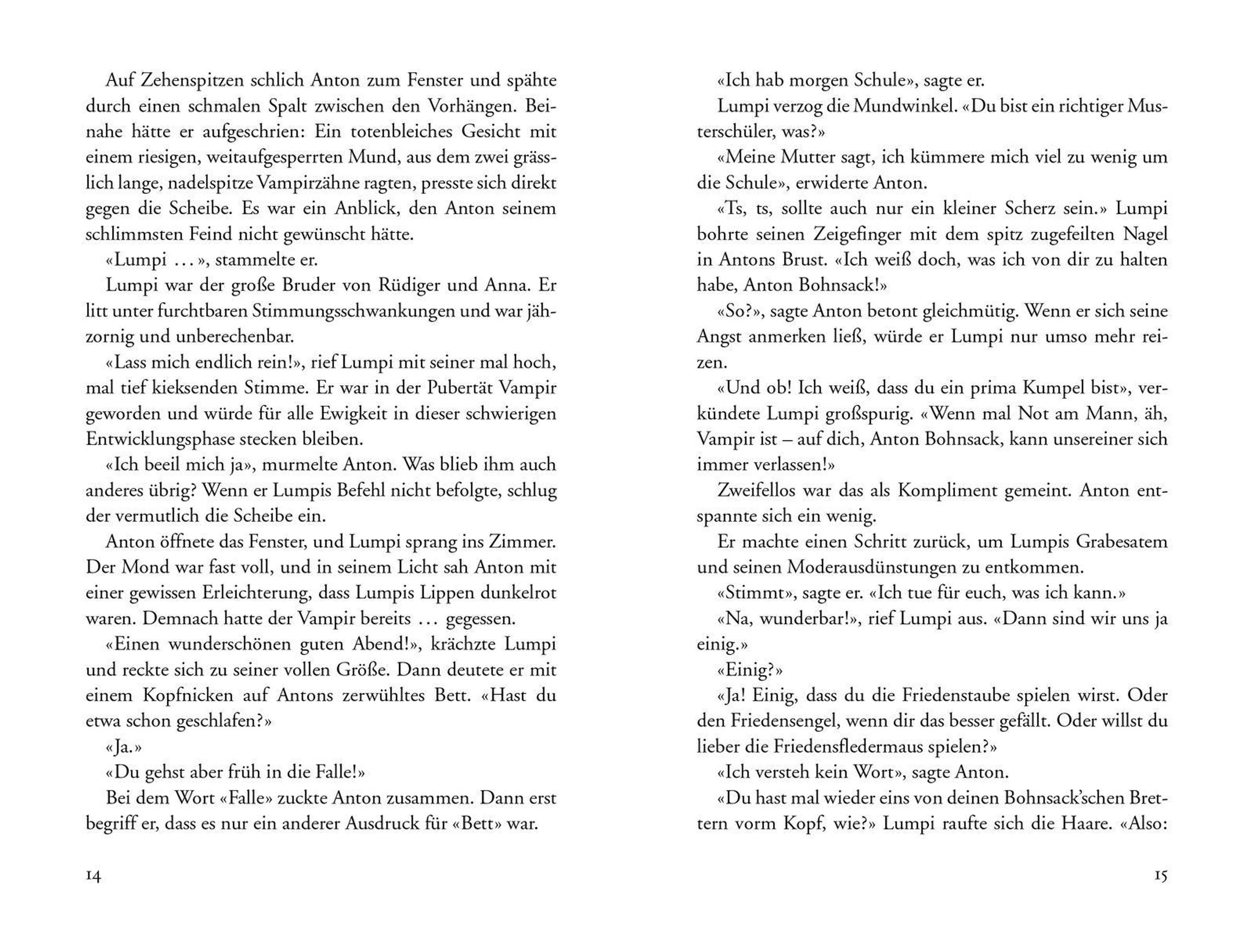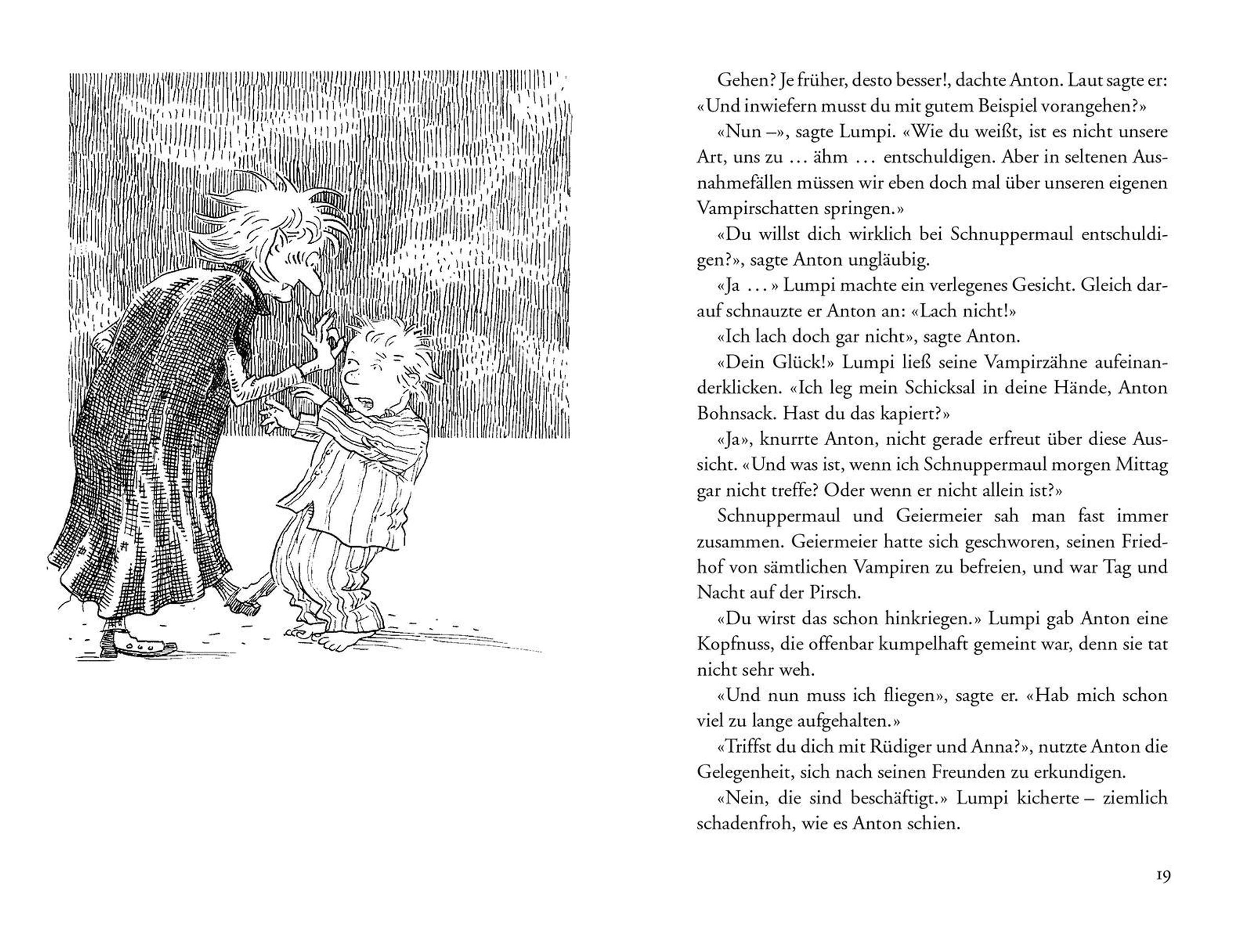 Dank einer Einladung von Olga Fräulein von Seifenschwein, die Anton auf keinen Fall ablehnen darf, nimmt er an der höchsten und geheimsten Zeremonie der Vampire teil: der Nacht der Letzten Verwandlung! In dieser Nacht, in der es keine Geheimnisse, keine Lügen und keine Täuschungen gibt, erfährt Anton, was es bedeutet, ein Mensch unter Vampiren zu sein. Selbst Rüdiger, der kleine Vampir, kann ihm dieses Mal nicht zu Hilfe kommen ...