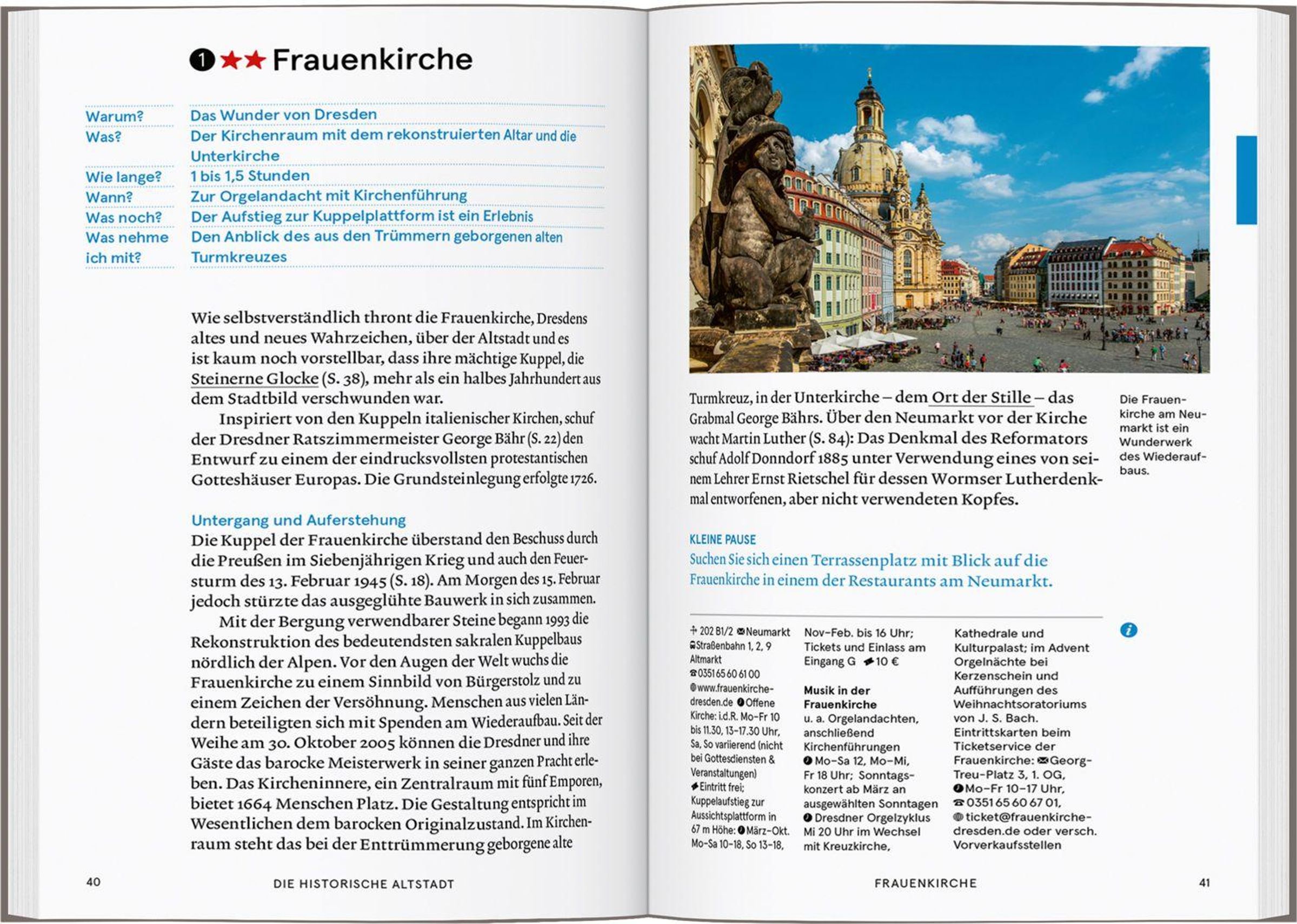 Als wenn er genau wüsste, was Ihnen gefällt - planen Sie morgens schnell und unkompliziert den Tag mit dem Baedeker SMART Dresden Reiseführer. Gehen Sie doch einmal in Ihrem Urlaub unterhalb der Brühlschen Terrasse an Bord eines historischen Schaufelraddampfers und genießen Sie ein Prosecco-Frühstück, während das Altstadtpanorama an Ihnen vorbeizieht. Am Nachmittag kehren Sie zurück in die Fachwerkidylle rund um den Körnerplatz und lassen den Tag im Biergarten beim Lingnerschloss ausklingen. Oder Sie betrachten Dresdens Attraktionen einmal von oben? Auf der Kuppel der Frauenkirche haben Sie einen großartigen Rundumblick. Neben den klassischen Sehenswürdigkeiten halten wir Reisetipps für ganz besondere Urlaubsmomente für Sie bereit. Ein unbezahlbarer Blick auf Frauenkirche, Semperoper und das Residenzschloss von Dresden wartet zum Sonnenuntergang auf den Treppen des Finanzministeriums auf Sie. Mit unseren inspirierenden Ideen sorgen wir für eine entspannte Urlaubsplanung und machen Ihren Städtetrip nach Dresden unvergesslich.