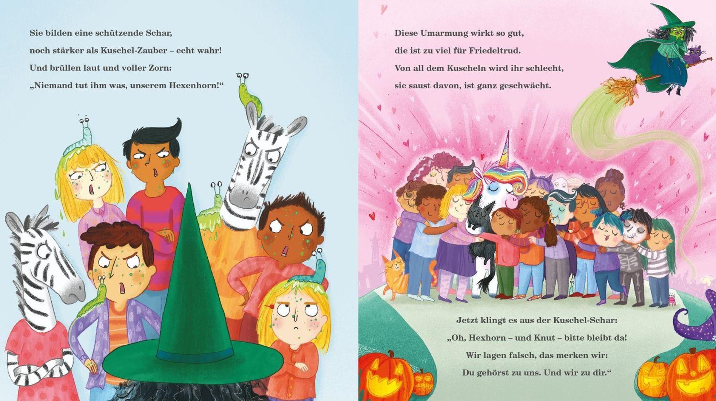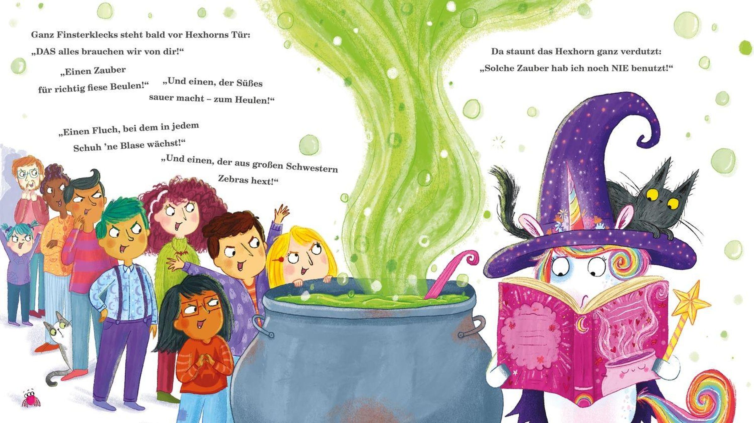 Bösewichte aufgepasst: Hier kommt das Hexhorn! Im kleinen Örtchen Finsterklecks warten alle auf die neue Hexe: Das Hexenhaus ist eingerichtet, der Kessel steht bereit, und auch eine struppige Katze namens Knut ist schon da. Doch dann braust ein ganz besonderes Wesen auf dem Besen heran: mit Umhang, Hut und einem Horn! Das Hexhorn kann allerdings keine fiesen Zauber, sondern hext lieber Regenbögen, magische Törtchen und Kuschel-Sprüche. Die Finsterkleckser sind enttäuscht und schicken das Hexhorn fort. Doch als die tatsächlich fiese Hexe Friedeltrud aus dem Nachbarort auftaucht und Chaos stiftet, stellt sich das mutige Hexhorn ihr entgegen. Ob Freundlichkeit und Zusammenhalt am Ende doch stärker sind als fiese Flüche?