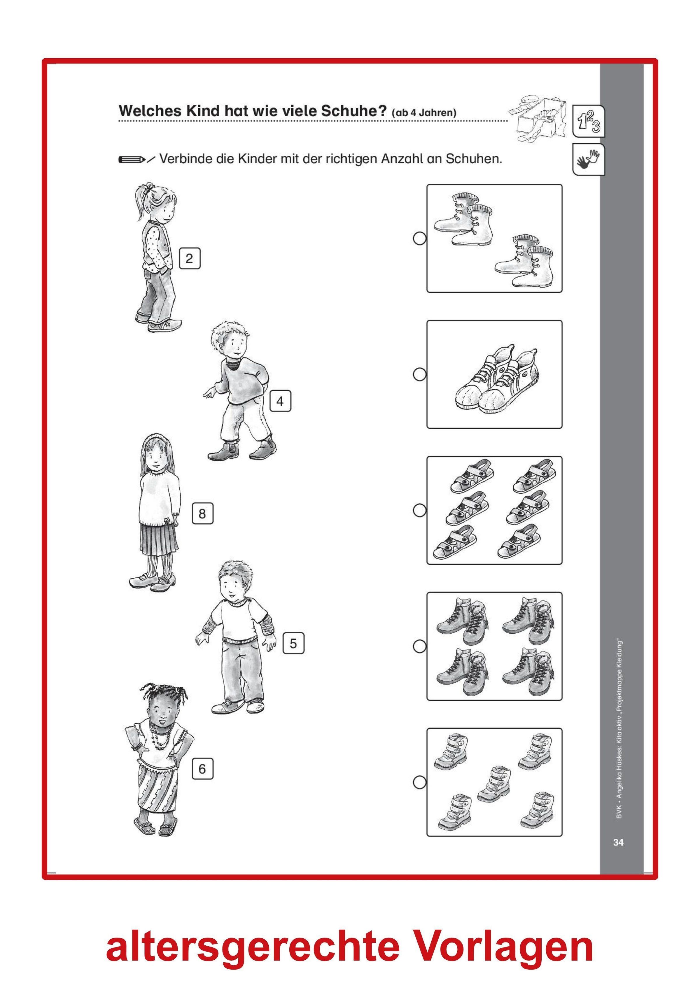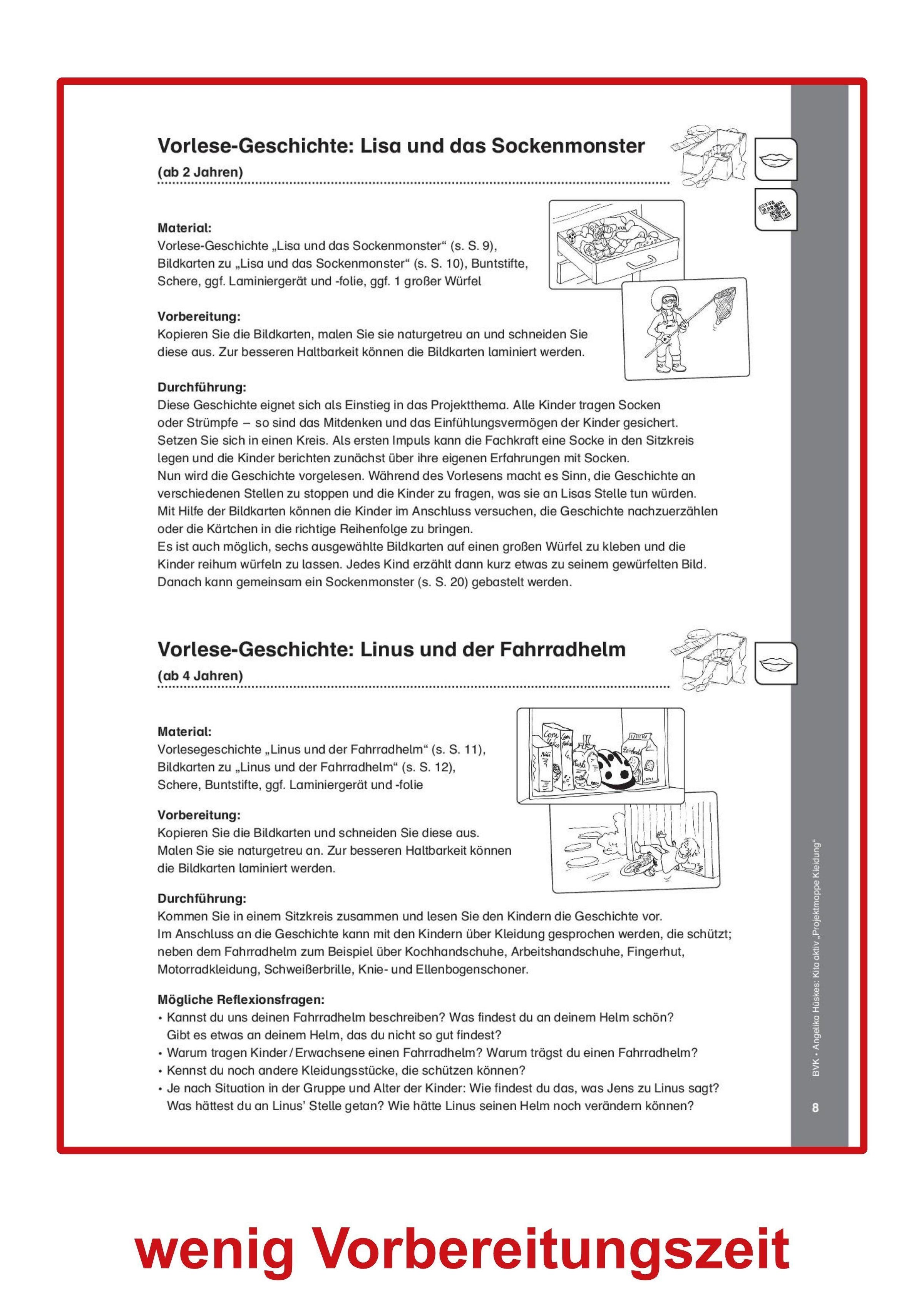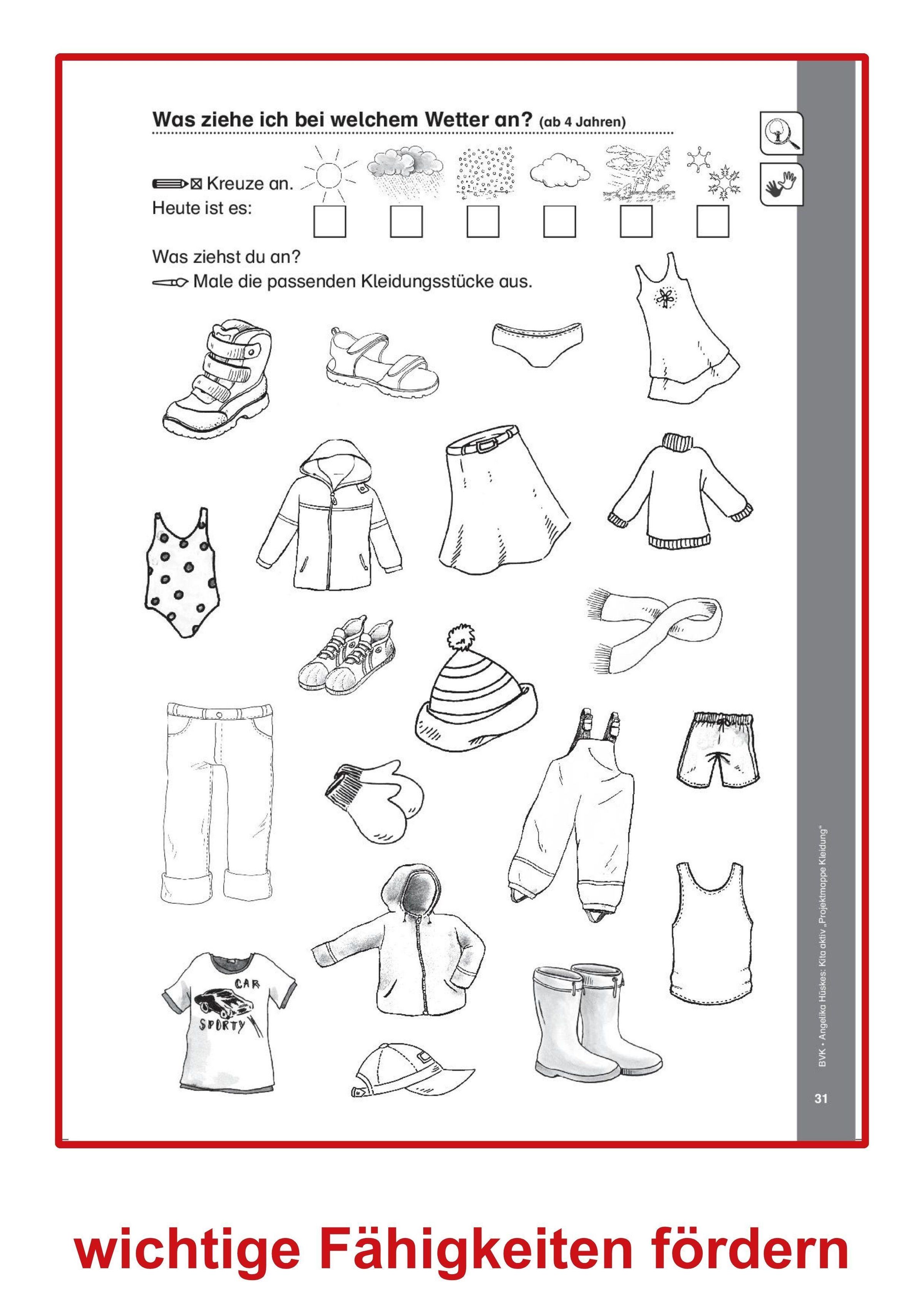 Aus dem Inhalt: Vorlese-Geschichte: Lisa und das Sockenmonster - Kleider-Fingerspiel - Bälle filzen - Die Lieblingskleidung der Kinder - Figuren anziehen - Wo kommt unsere Kleidung her? - Was ziehe ich bei welchem Wetter an? - Knopfspiele - Eine Schleife binden ...