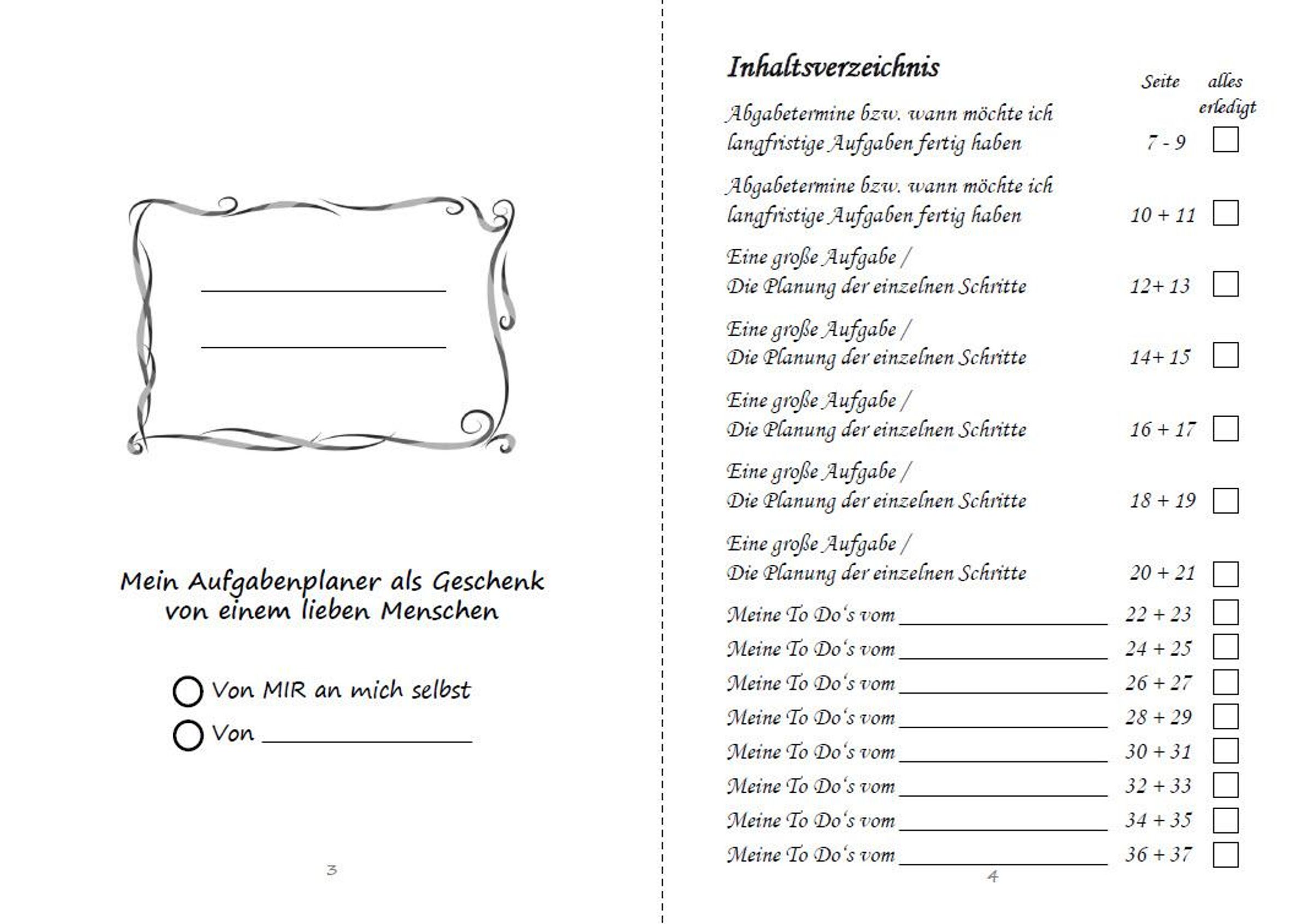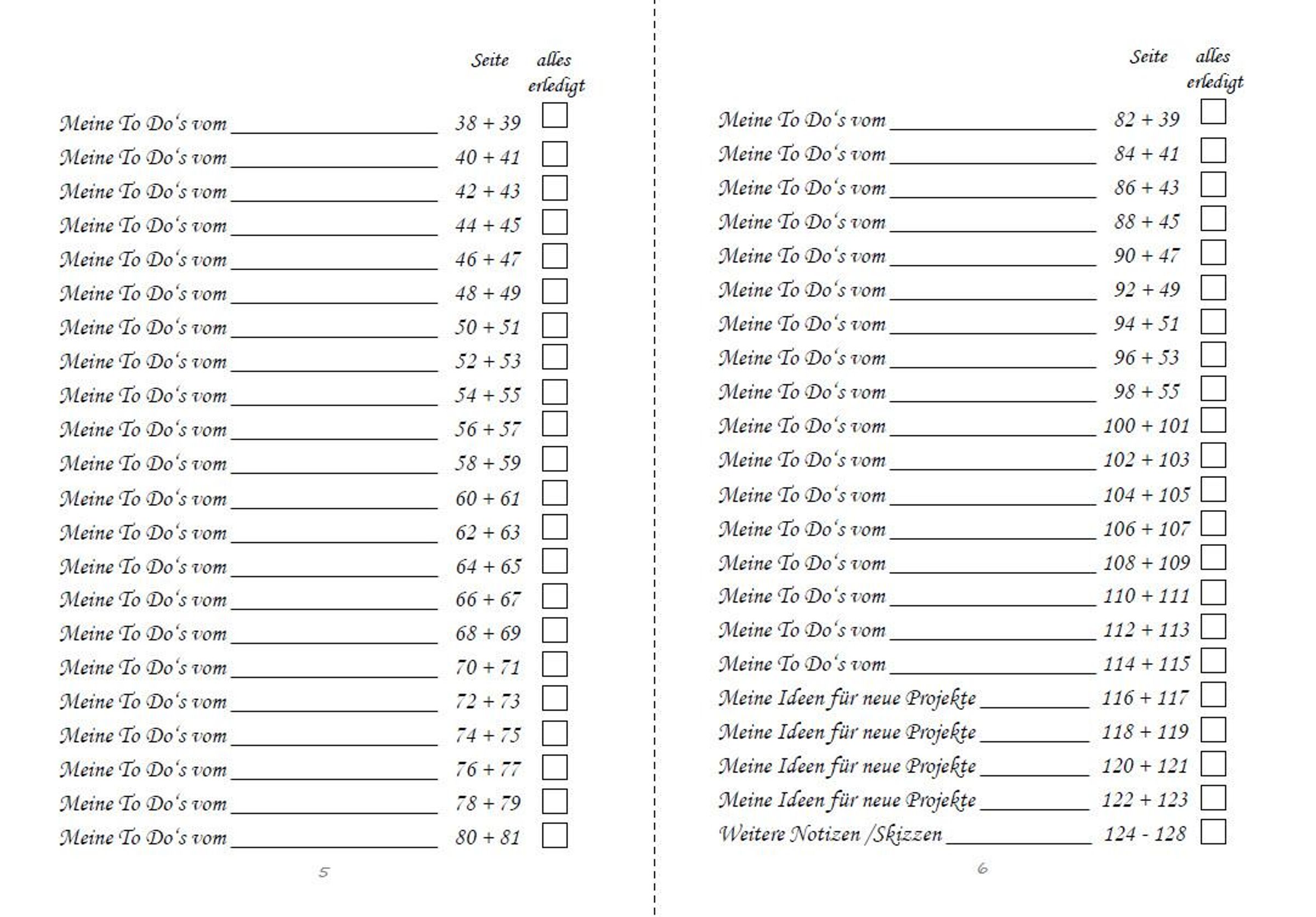 ** Weiterhin 47 Doppelseiten = 94 Einzelseiten mit deiner To Do Liste zum Abhaken und am Ende jeder Seite auch zum Abhaken, ob alle Aufgaben dieser Seite erledigt sind. Als Clou kannst du im Inhaltsverzeichnis den Datumsbereich eintragen, von wann die To Do Liste ist und vor allem auch abhaken, wenn du die Eintragungen auf der Doppelseite komplett erledigt hast. So ist schnell im Inhaltsverzeichnis ersichtlich auf welcher freien Seite du neue To Dös eintragen kannst und bei welchen Seiten noch ein paar Aufgaben zu erledigen sind, weil es vielleicht auch dort mal länger dauert.