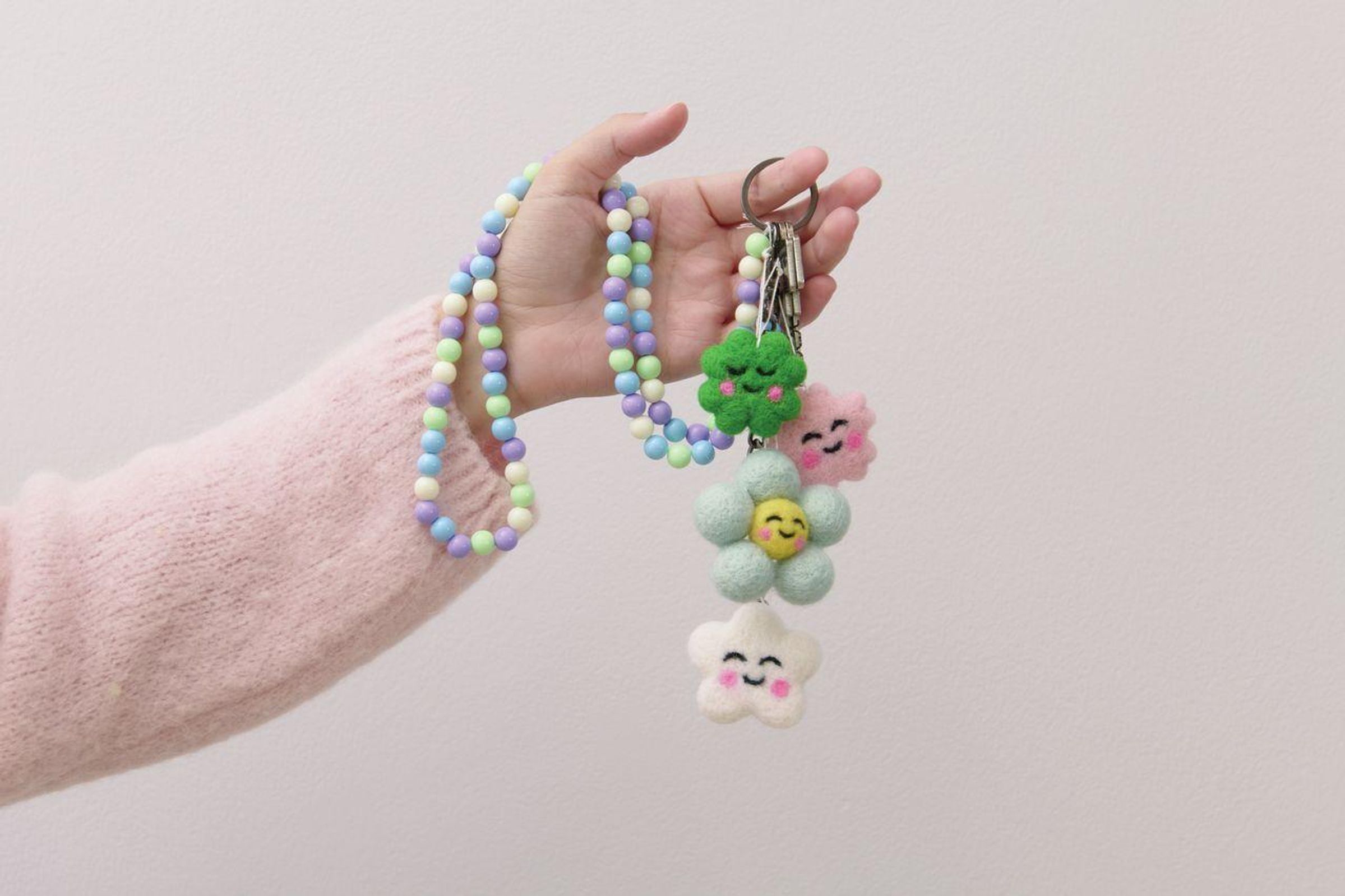 Das Aufhänger Filz-Sortiment "Cloud & Bloom" 3D umfasst vier handgefilzte Figuren aus 100 % Wolle. Enthalten sind Kirschblüte, Blume, Wolke und Kleeblatt, die jeweils detailreich gearbeitet sind. Die Anhänger eignen sich ideal für kreative Dekorationen und saisonale Gestaltungen.