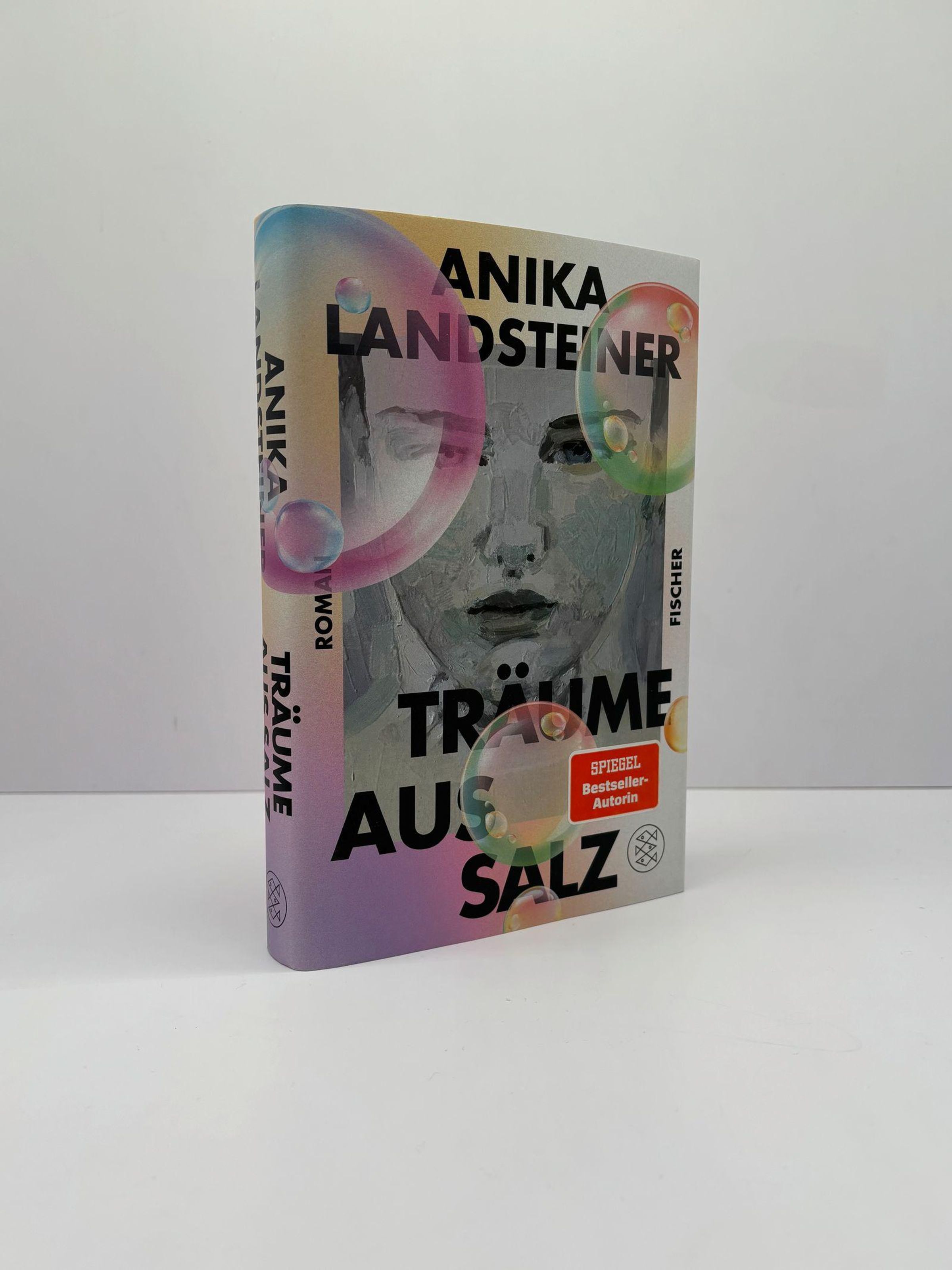 Text: "ANIKA LANDSTEINER", "TRÄUME AUS SALZ", "SPIEGEL Bestseller-Autorin". Illustration mit zartem Gesicht hinter farbigen Blasen., Buch
