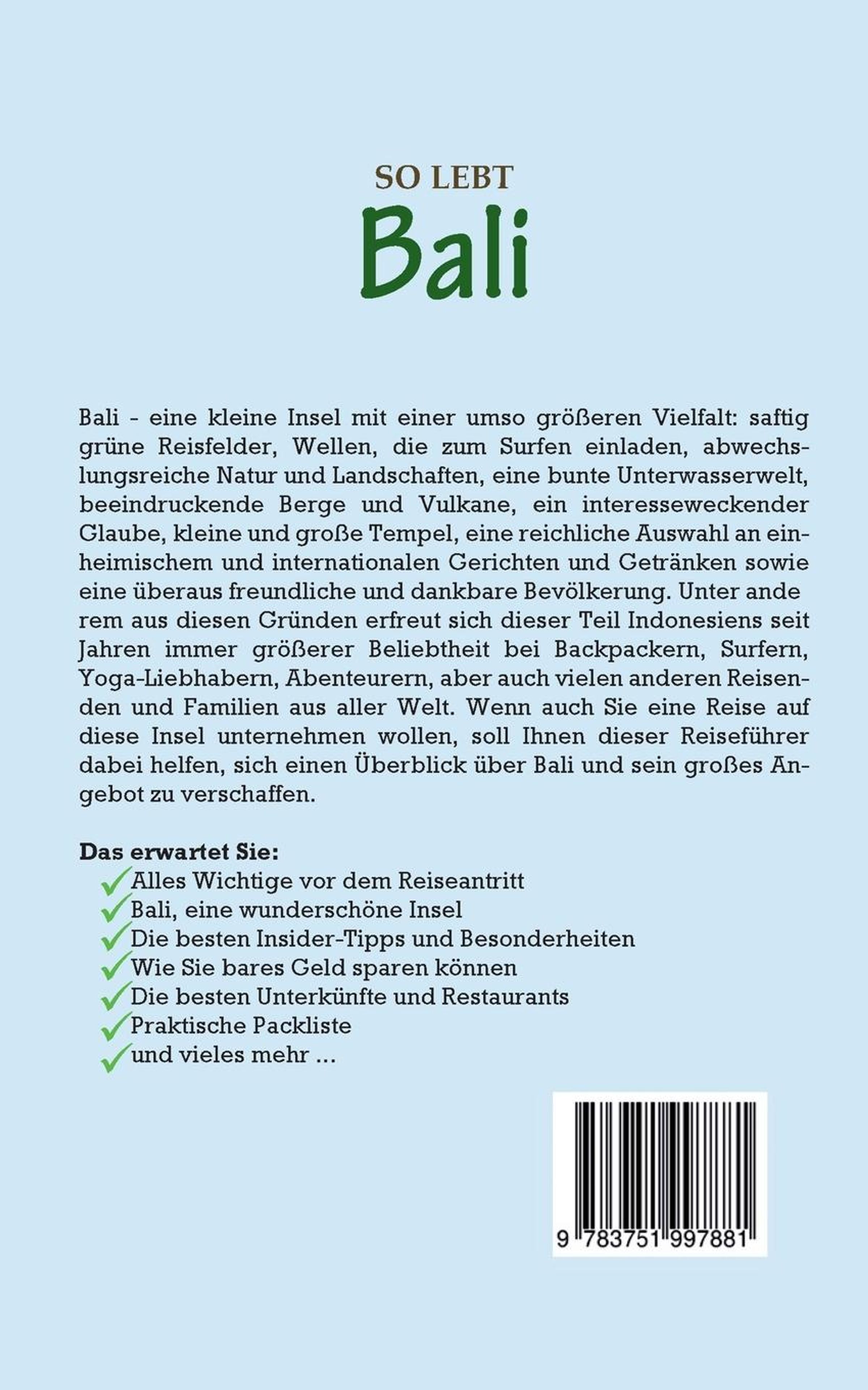 Bali - eine kleine Insel mit einer umso größeren Vielfalt: saftig grüne Reisfelder, Wellen, die zum Surfen einladen, abwechslungsreiche Natur und Landschaften, eine bunte Unterwasserwelt, beeindruckende Berge und Vulkane, ein interesseweckender Glaube, kleine und große Tempel, eine reichliche Auswahl an einheimischem und internationalen Gerichten und Getränken sowie eine überaus freundliche und dankbare Bevölkerung. Unter anderem aus diesen Gründen erfreut sich dieser Teil Indonesiens seit Jahren immer größerer Beliebtheit bei Backpackern, Surfern, Yoga-Liebhabern, Abenteurern, aber auch vielen anderen Reisenden und Familien aus aller Welt. Wenn auch Sie eine Reise auf diese Insel unternehmen wollen, soll Ihnen dieser Reiseführer dabei helfen, sich einen Überblick über Bali und sein großes Angebot zu verschaffen.