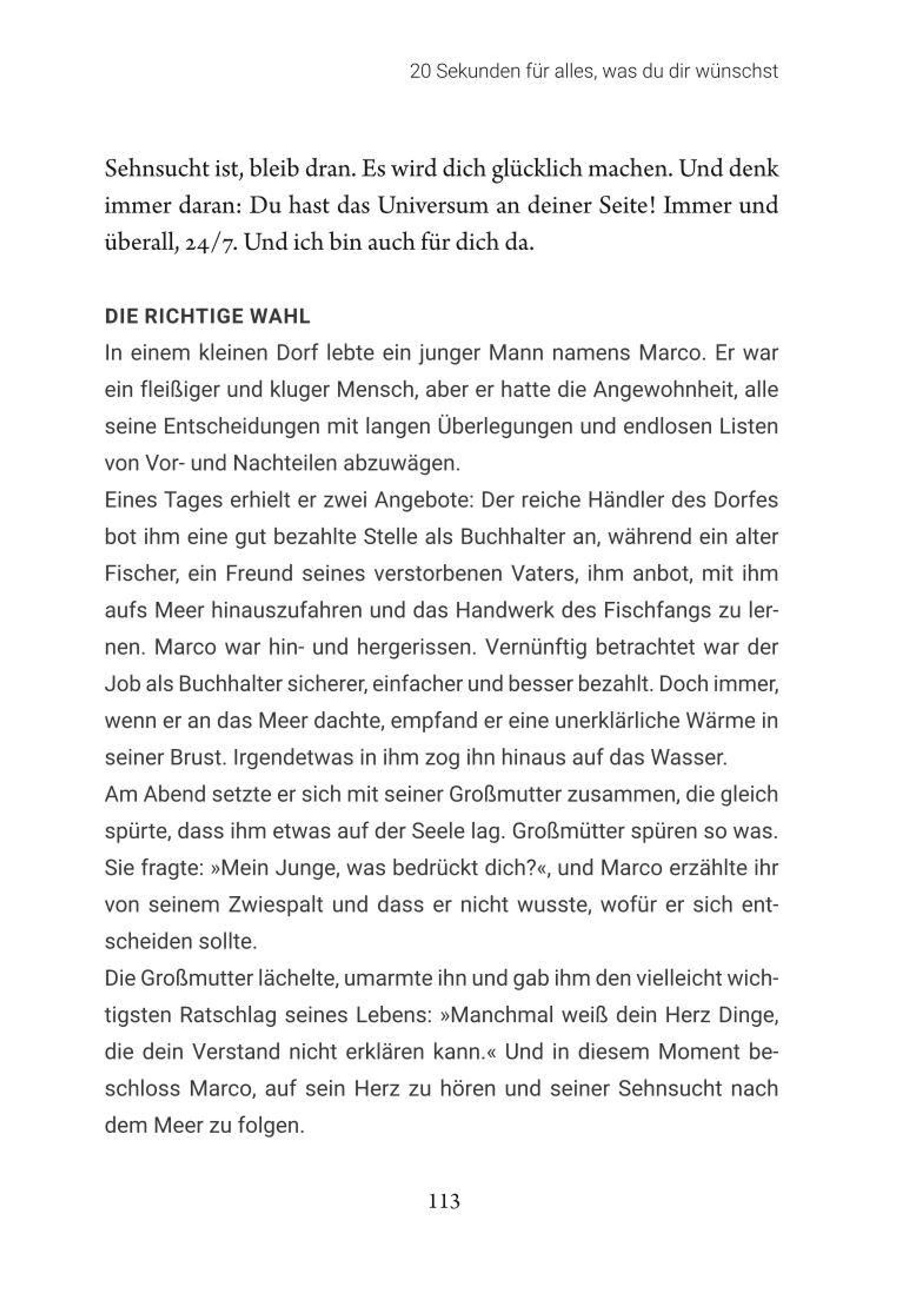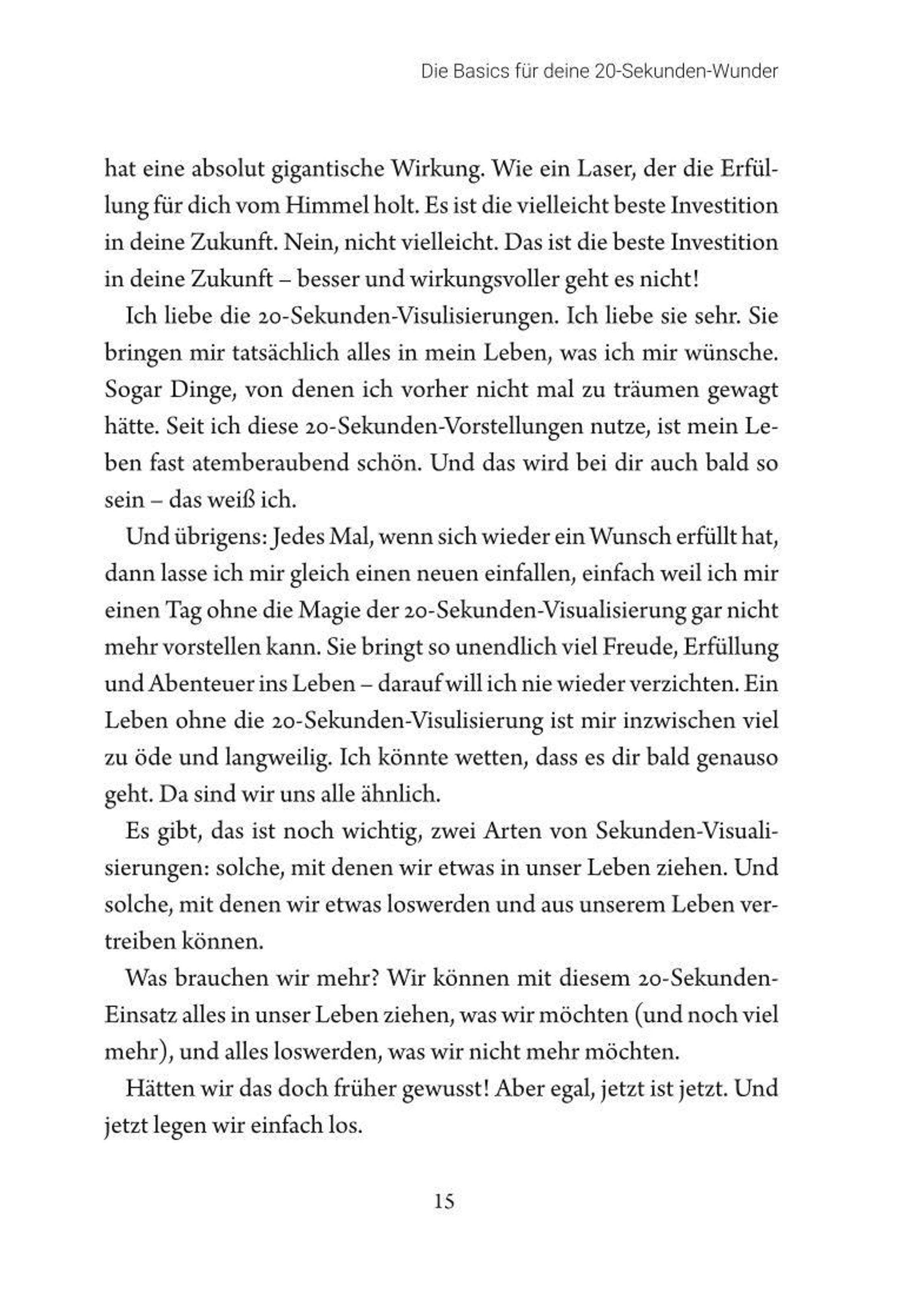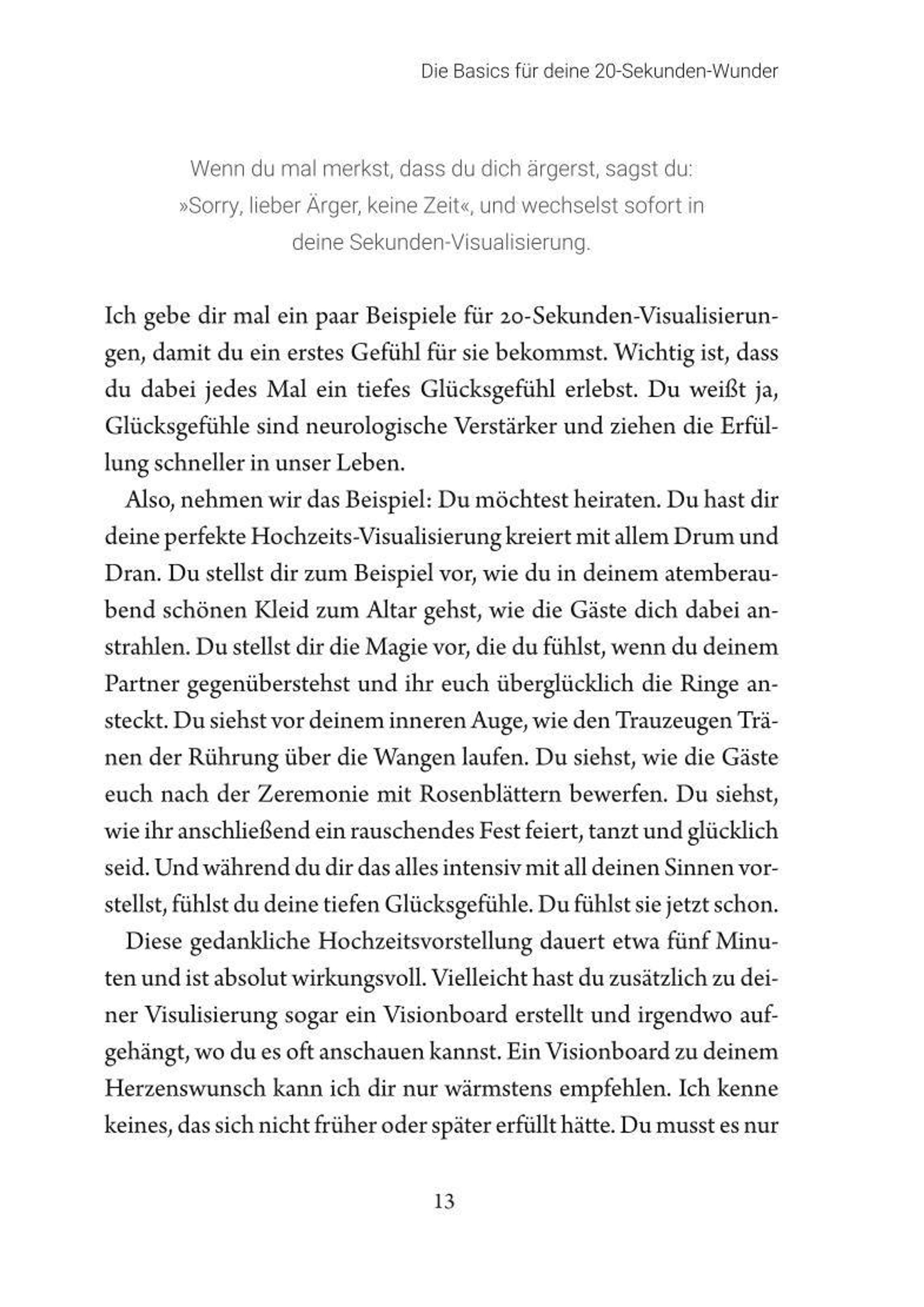 20 Sekunden können unser Leben verändern! Klingt unglaublich? Funktioniert aber! Mit geringstem Zeiteinsatz können wir Sorgen auflösen und das Tor zur Erfüllung unserer Wünsche öffnen. Bestsellerautorin Anjana Gill zeigt alle wichtigen Arten von Mini-Visualisierungen sowie Regeln und Kniffe für erfolgreiches Manifestieren. Dazu gibt sie genaue Anleitungen für alle denkbaren Wünsche und Lebensträume. Dann braucht es nur noch eine klare Entscheidung, und schon kann's losgehen! Dein Alltag wird sich im Handumdrehen mit Zauber und Farbe füllen. Das Glück liegt in unseren Händen und rückt jetzt zum Greifen nah.