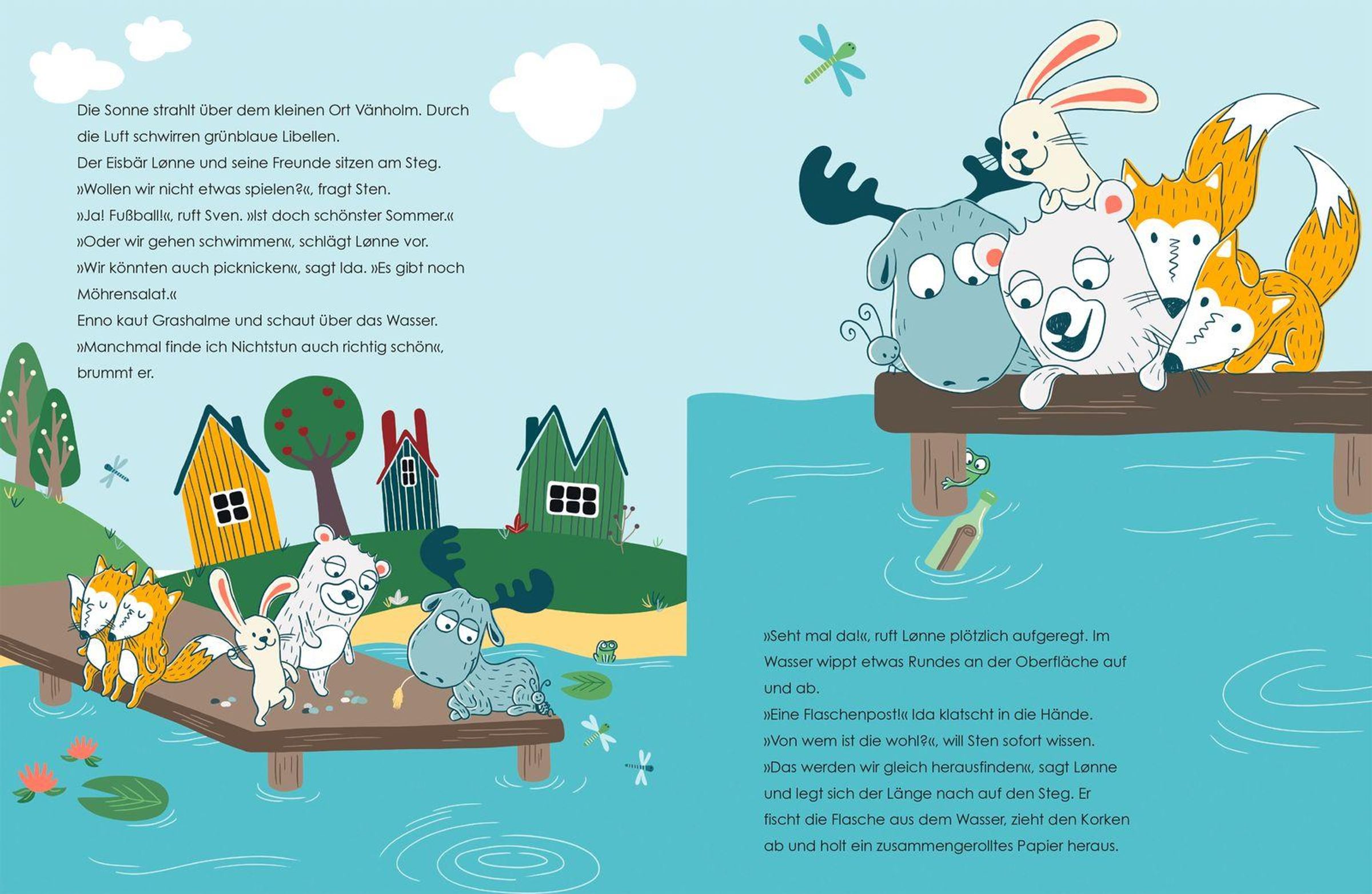 „Hej Lønne! Der Inselschatz“. Eine Illustration: Tiere in einem Boot auf dem Wasser, umgeben von Natur., Buch