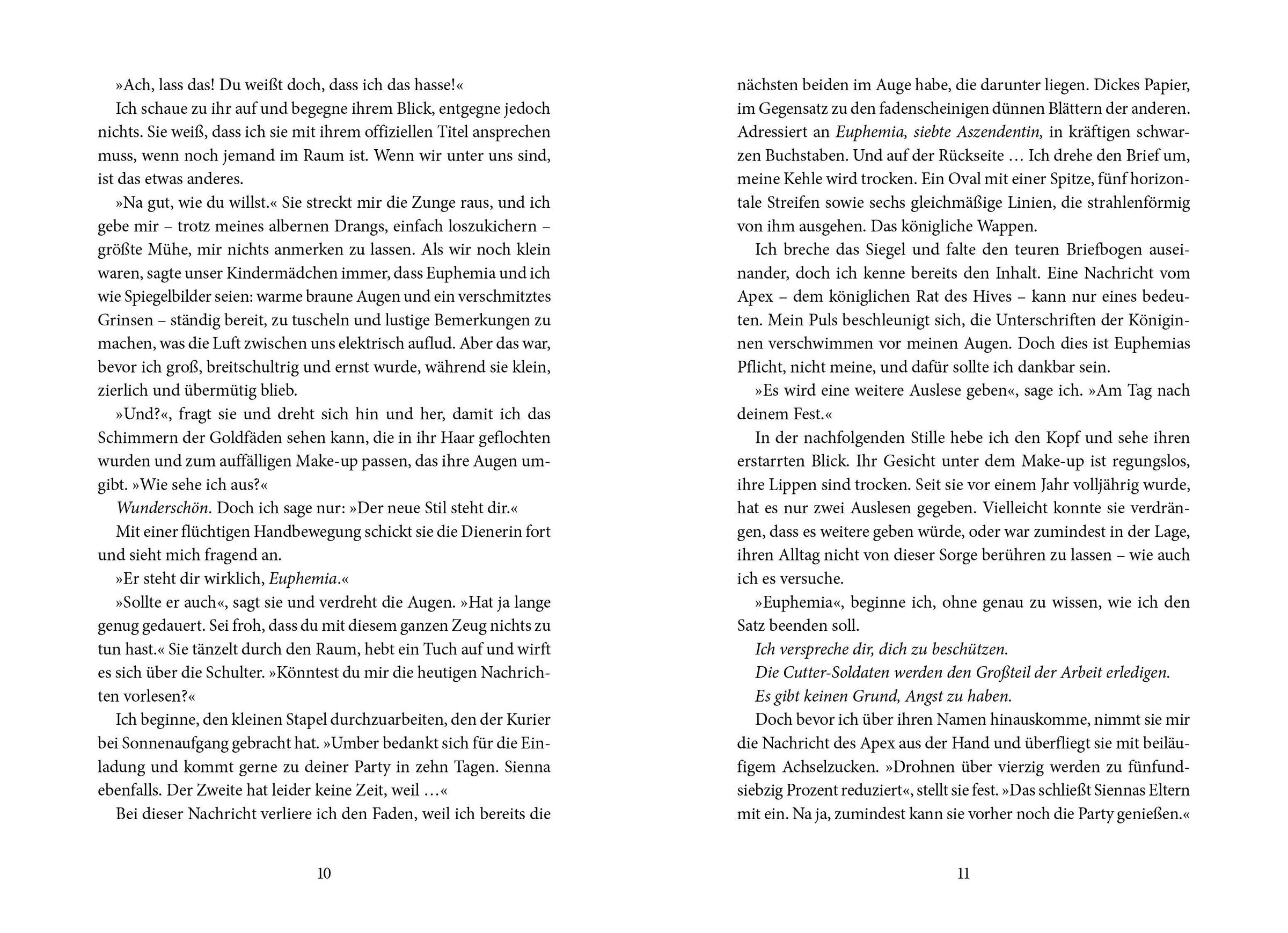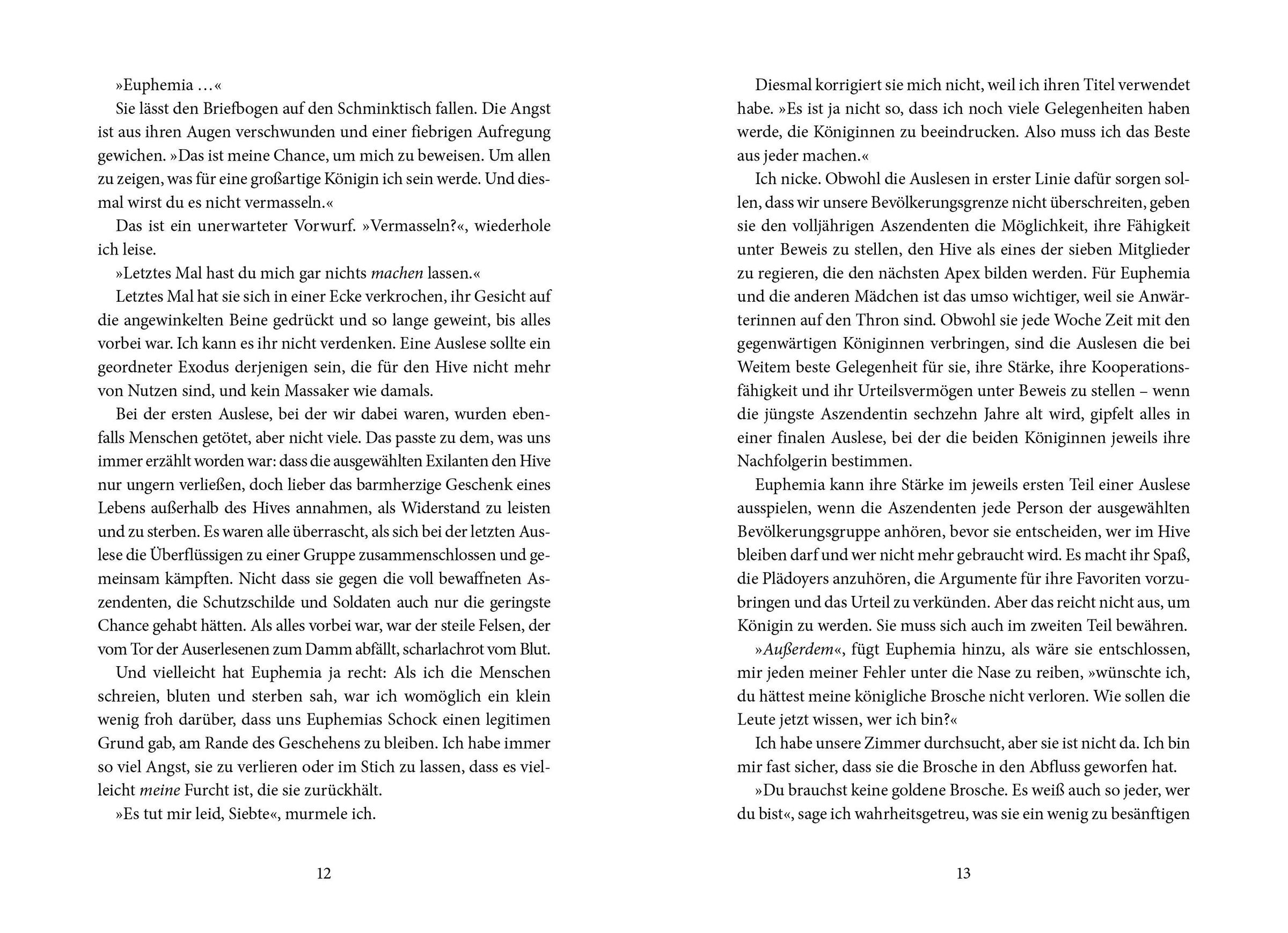 Arenite ist unschuldig und wartet dennoch auf ihre Hinrichtung . Ihr Verbrechen? Sie ist noch am Leben, während ihr Schützling tot ist - eine Tatsache, die nicht sein dürfte. Denn im Hive hat jeder seine Aufgabe, jedes Leben eine Funktion und jeder Fehler einen Preis. Gemeinsam mit Niko, einem königlichen Außenseiter, an ihrer Seite hat Arenite drei Tage Zeit , um das Unmögliche zu beweisen. Drei Tage, um alles infrage zu stellen, was sie über die Welt zu wissen glaubt, in der sie aufgewachsen ist. Drei Tage, um herauszufinden, wer der wahre Mörder ist ...