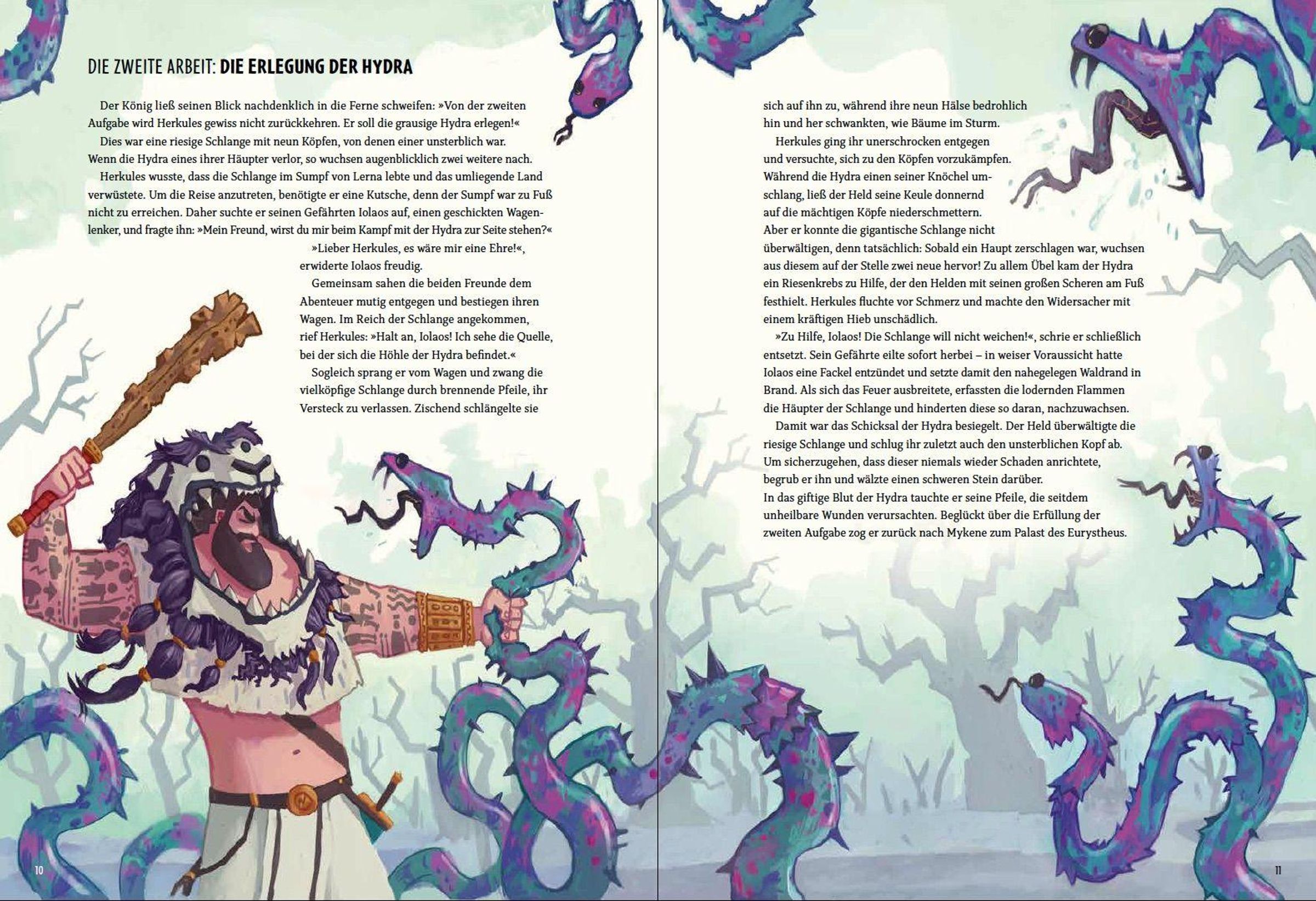 Sagen für Kinder. Die zwölf Heldentaten des Herkules. Illustration von Herkules vor einer Berglandschaft mit Tempelruinen., Buch