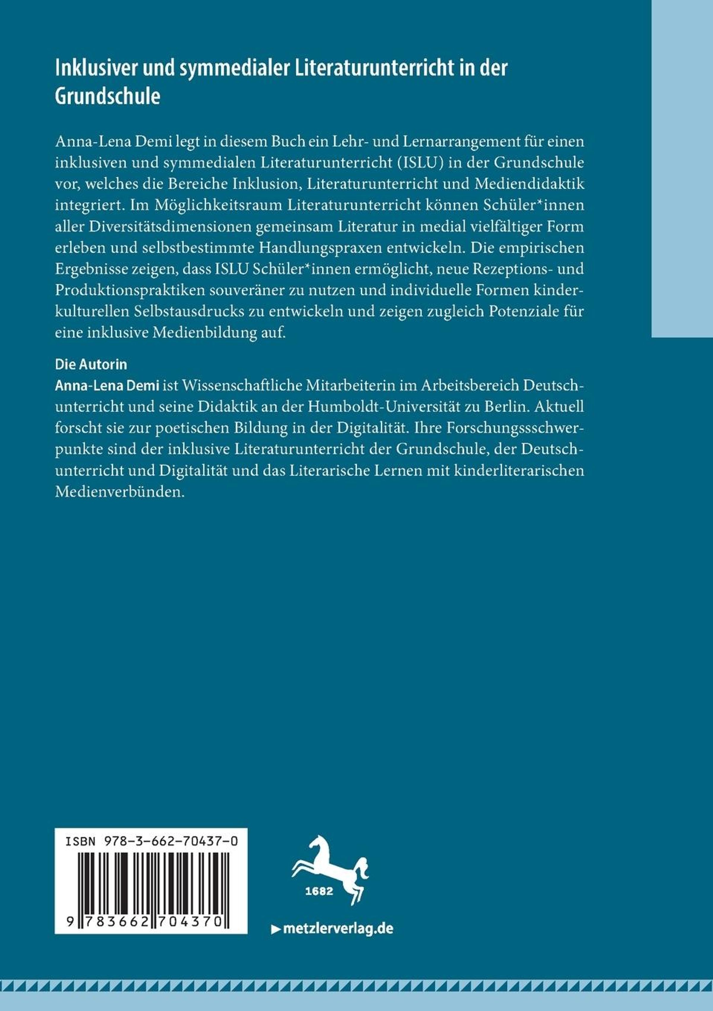 Anna-Lena Demi legt in diesem Buch ein Lehr- und Lernarrangement für einen inklusiven und symmedialen Literaturunterricht (ISLU) in der Grundschule vor, welches die Bereiche Inklusion, Literaturunterricht und Mediendidaktik integriert. Im Möglichkeitsraum Literaturunterricht können Schüler*innen aller Diversitätsdimensionen gemeinsam Literatur in medial vielfältiger Form erleben und selbstbestimmte Handlungspraxen entwickeln. Die empirischen Ergebnisse zeigen, dass ISLU Schüler*innen ermöglicht, neue Rezeptions- und Produktionspraktiken souveräner zu nutzen und individuelle Formen kinderkulturellen Selbstausdrucks zu entwickeln und zeigen zugleich Potenziale für eine inklusive Medienbildung auf.